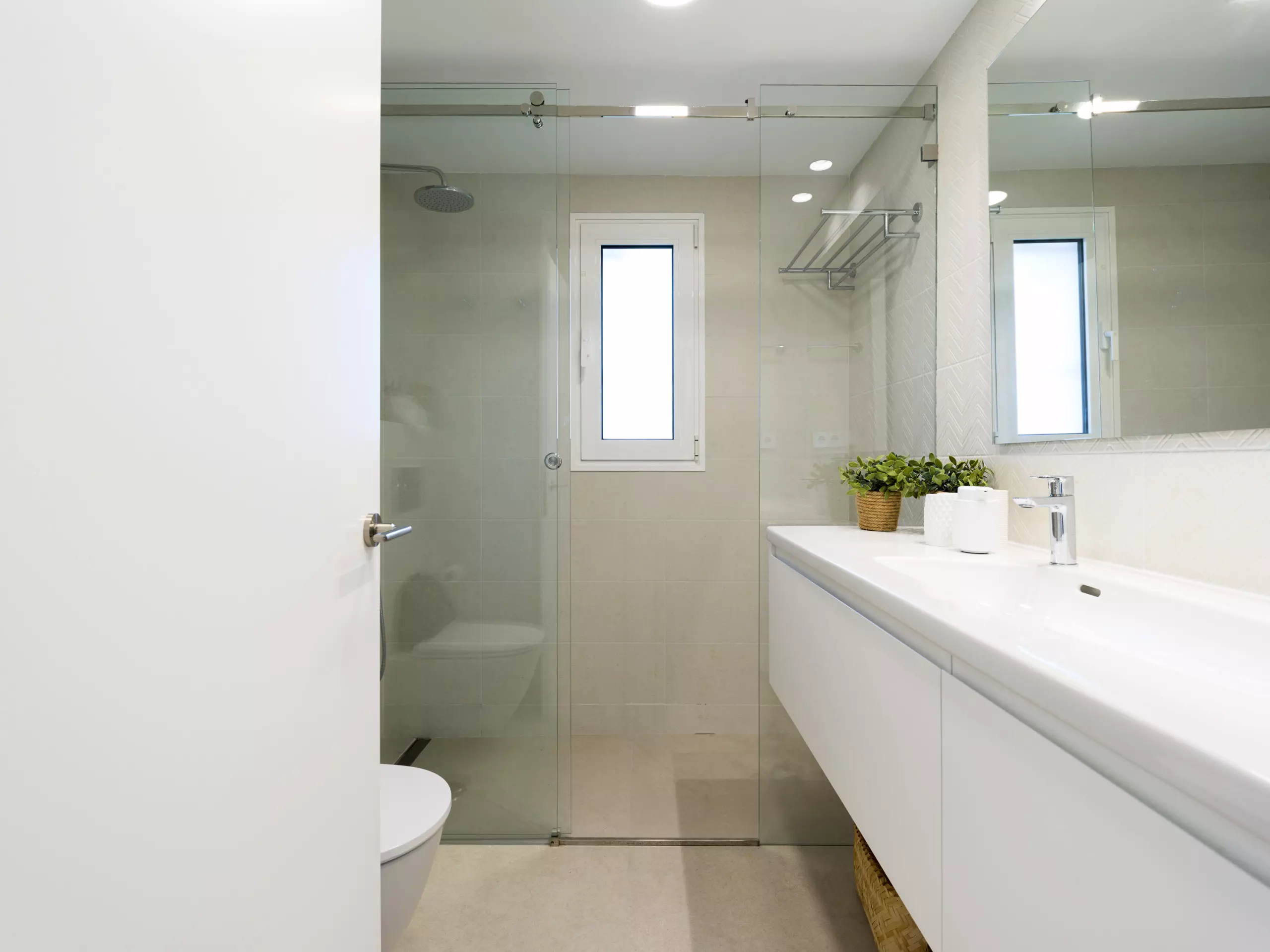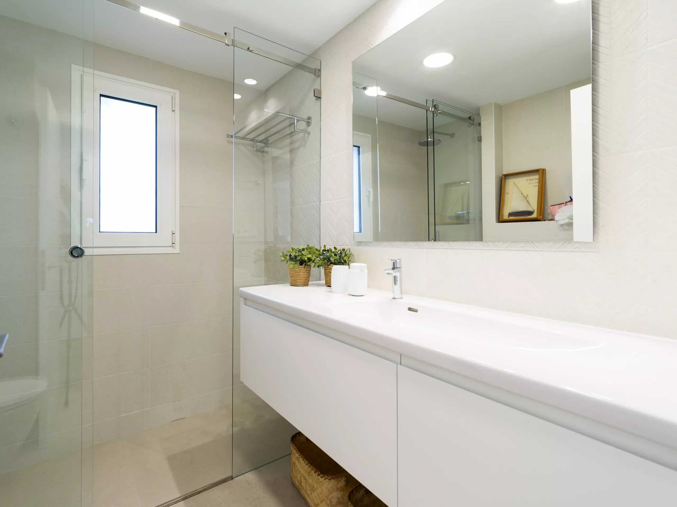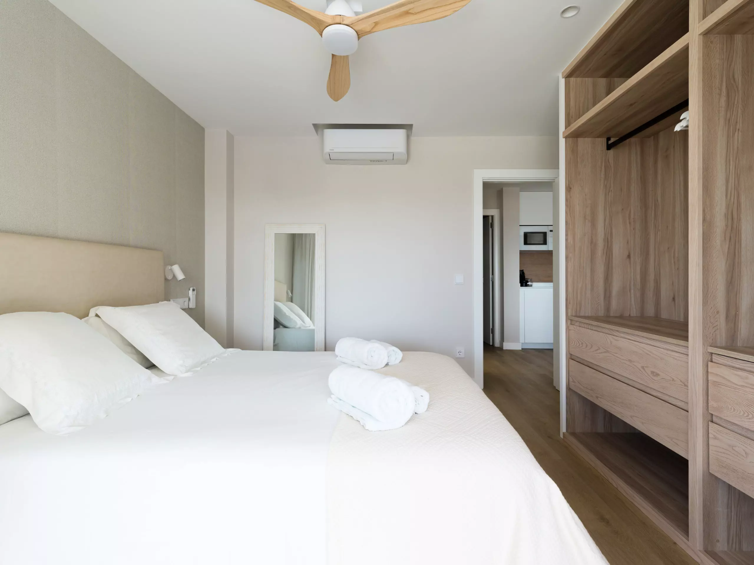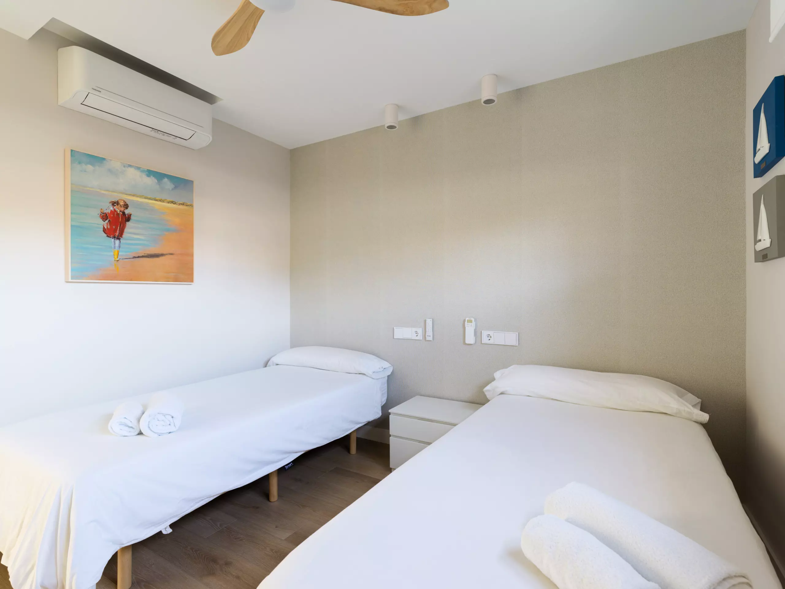 It has two large double bedrooms, one with a 1.5 meter wide double bed and the other with two 0.9 meter wide single beds, two full bathrooms and a very spacious living room. It can accommodate four people.