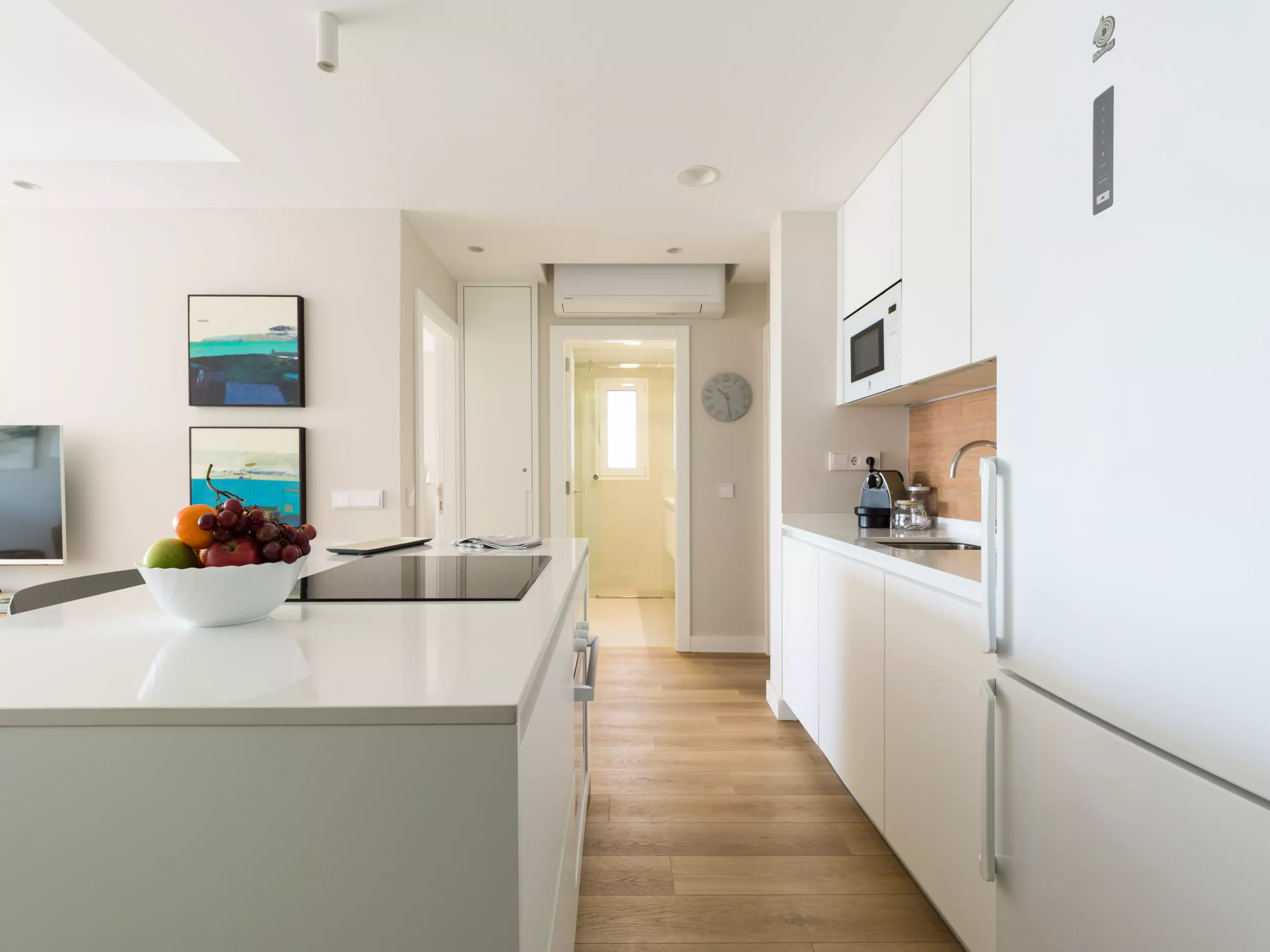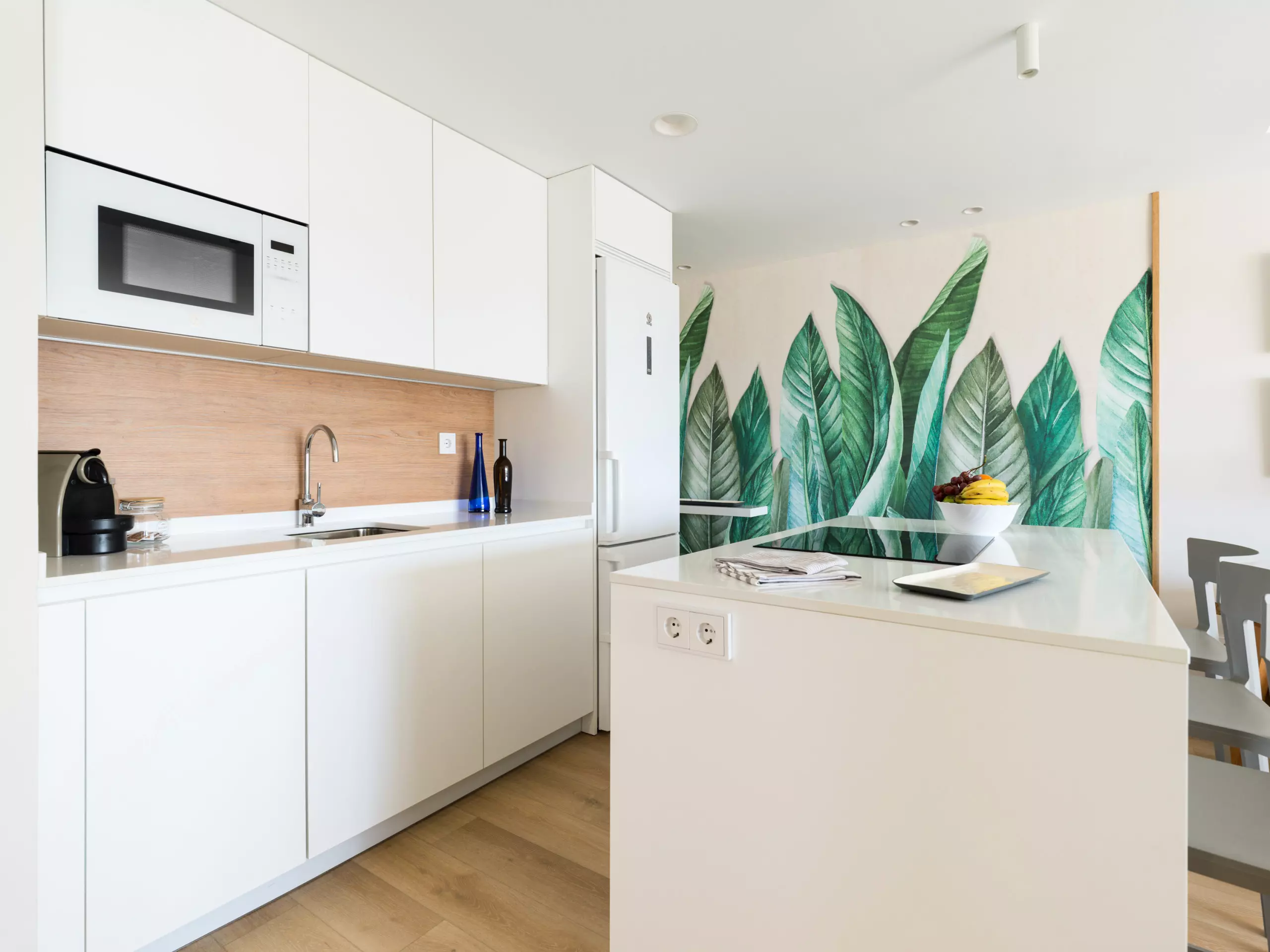 American kitchen with island, fully equipped with induction hob, refrigerator, microwave, oven, freezer, washing machine, dishwasher, dishes, kitchen utensils, coffee maker, toaster, kettle and juicer.