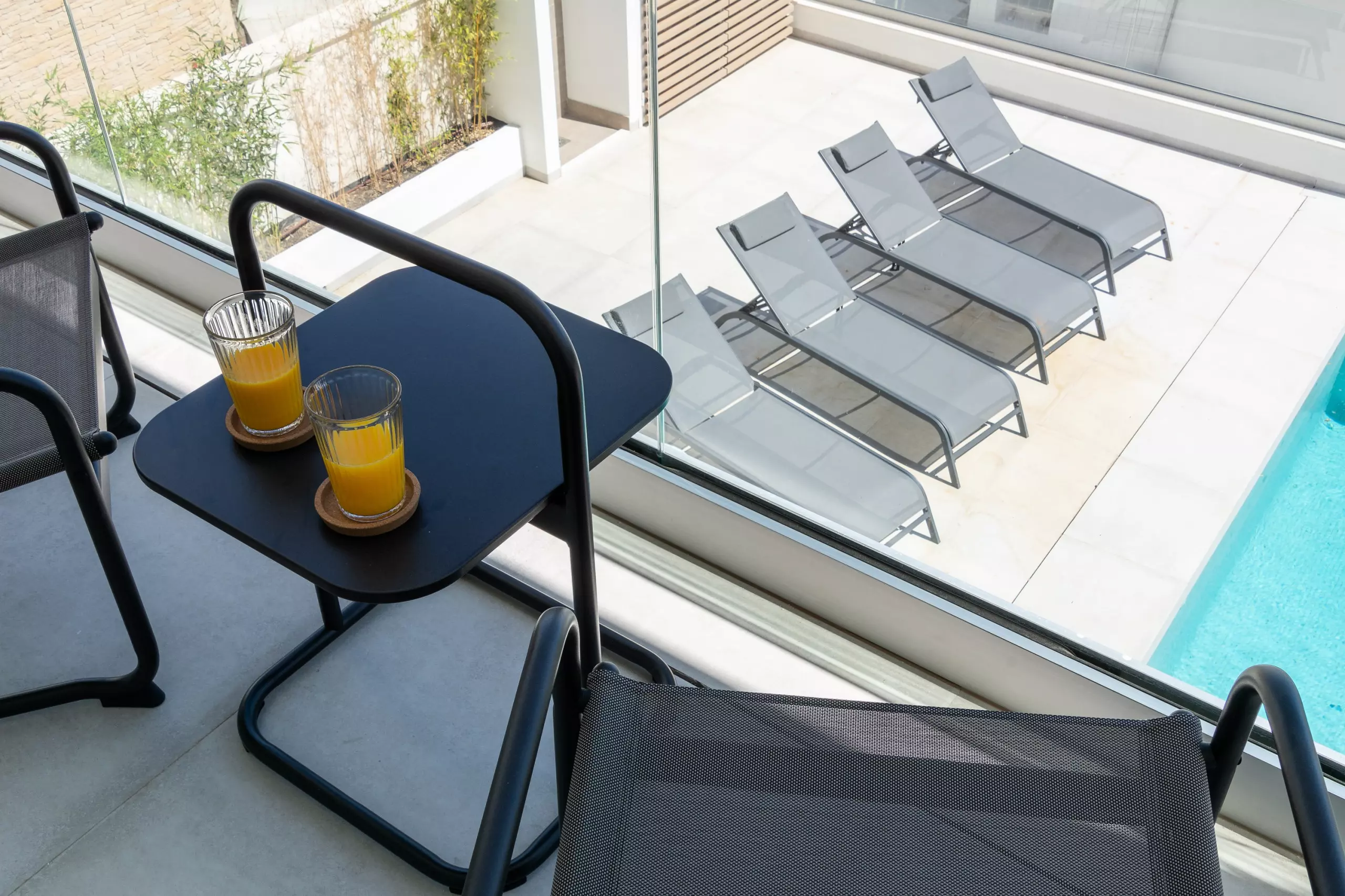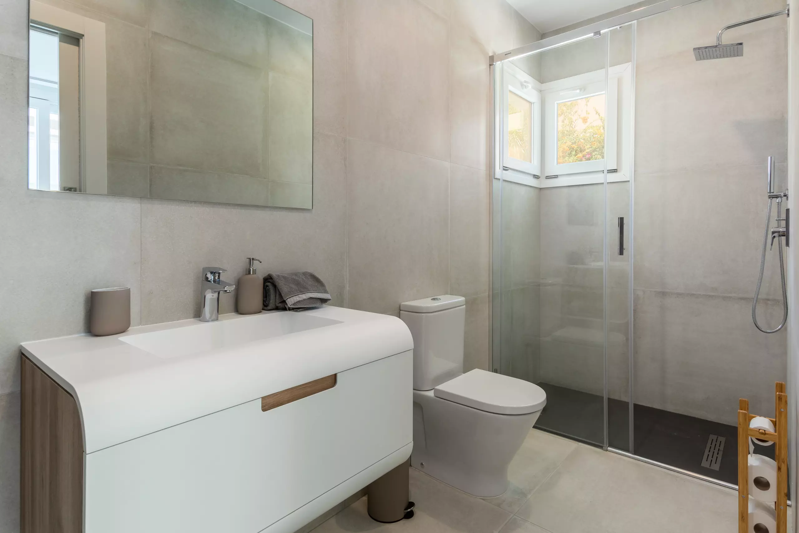 The ground floor comprises an open-plan living room and kitchen, a guest toilet, and one bedroom with an en-suite bathroom. The bathroom has a sink, toilet, and shower. The living room offers direct access through huge sliding doors to the pool, which features six sun loungers.