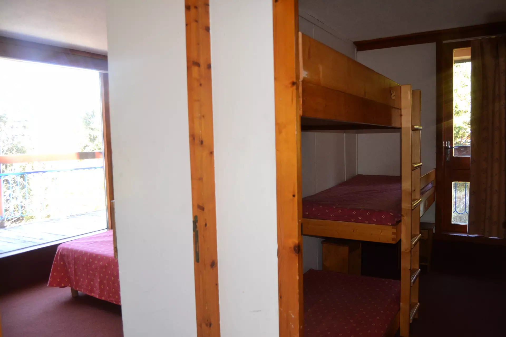 A 2nd bedroom with a set of three bunk beds.