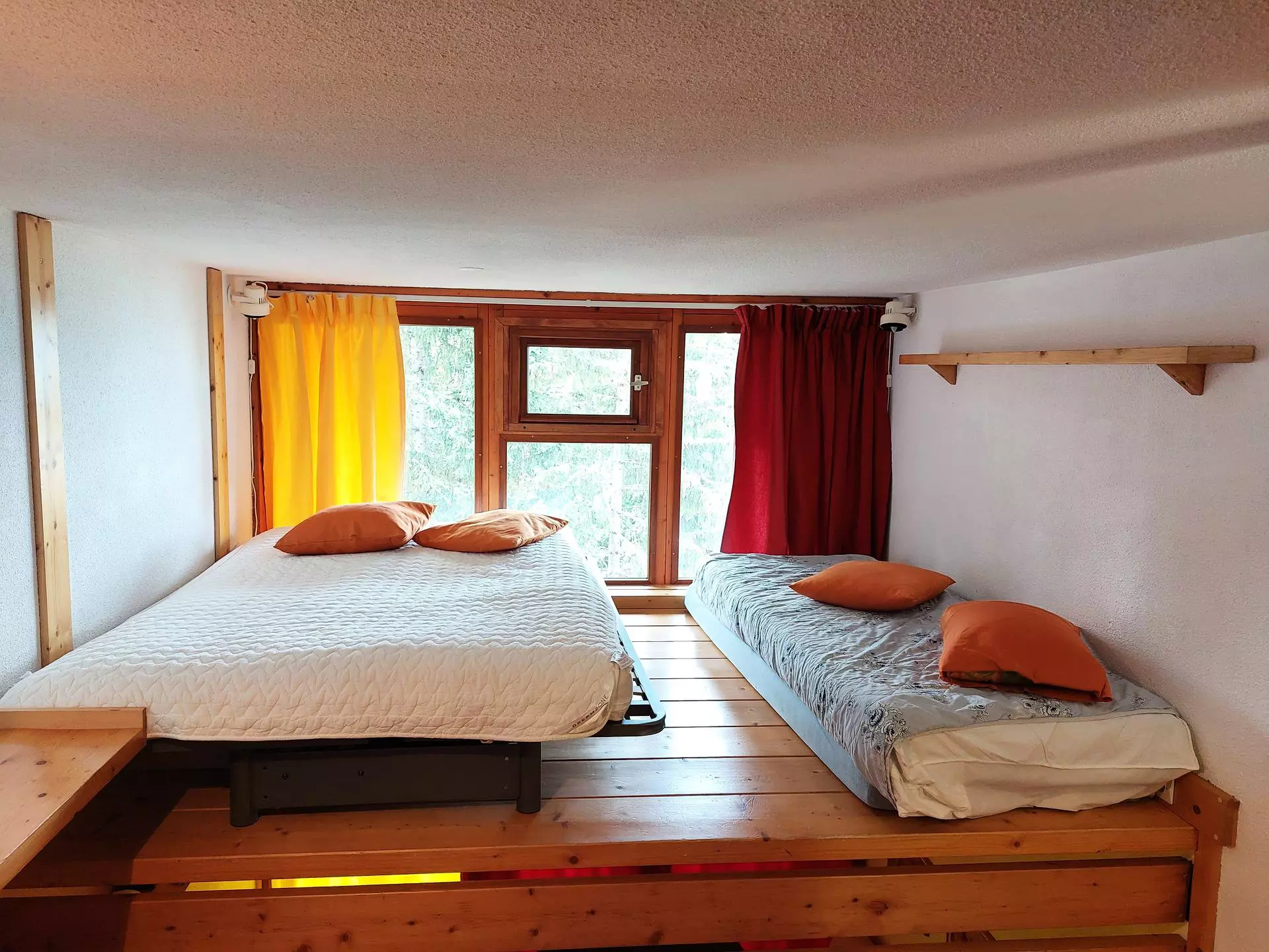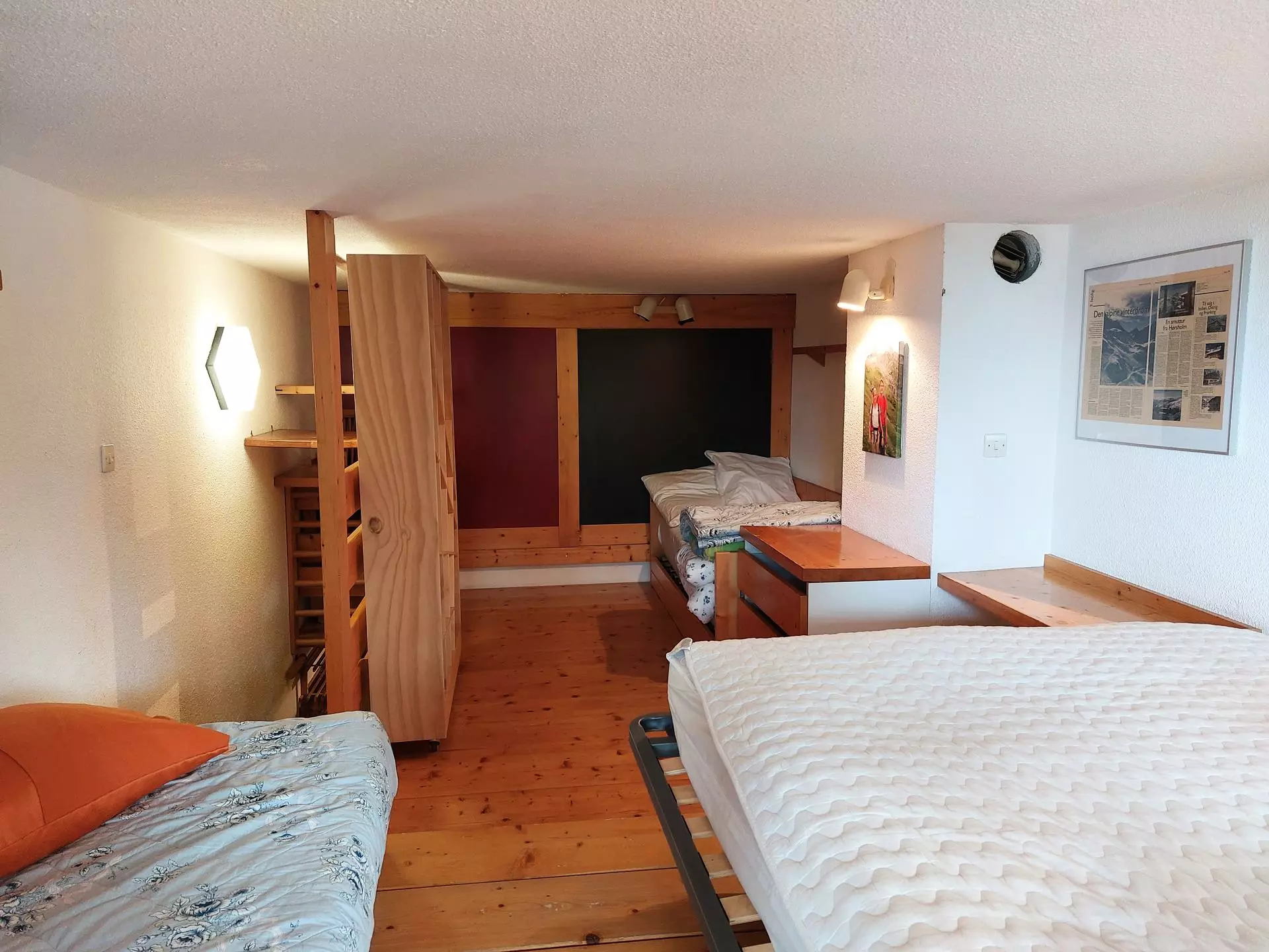Upstairs you will find a double bed 140x190 cm and two single beds (comb bed).