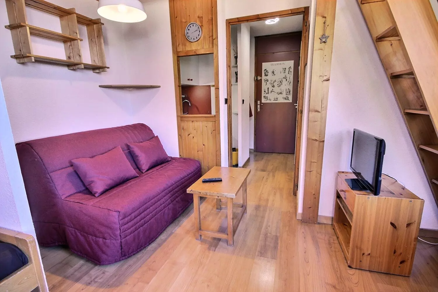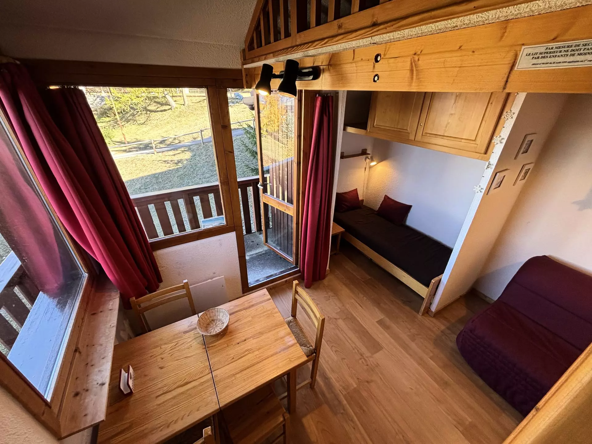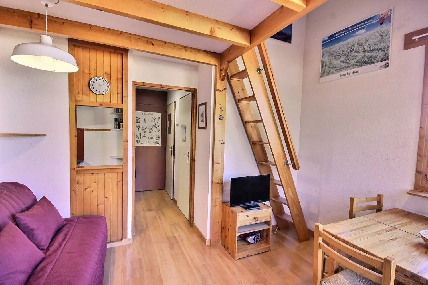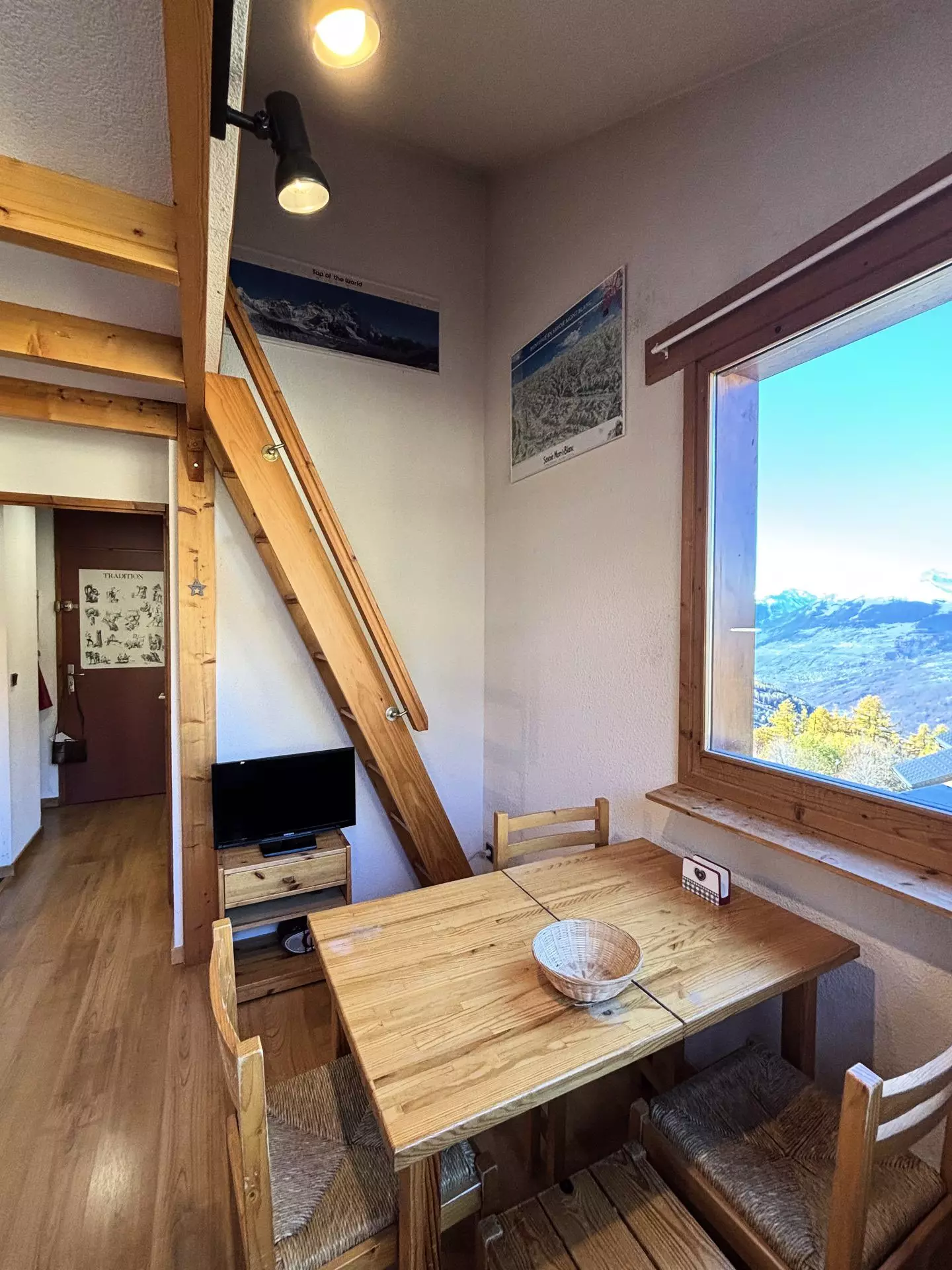 This 20m² studio, which can accommodate up to 4 people, is located on the 4th level (no elevator) of the Les Michailles residence. The main entrance to the residence is on the 5th floor. This studio has been awarded a Paradiski classification: 2 Crystals