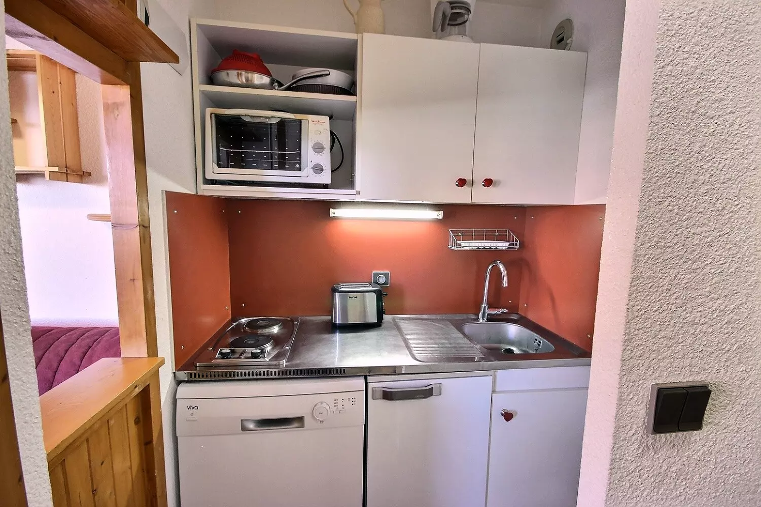 It is equipped with electric hotplates, a mini oven, a dishwasher and a refrigerator.
