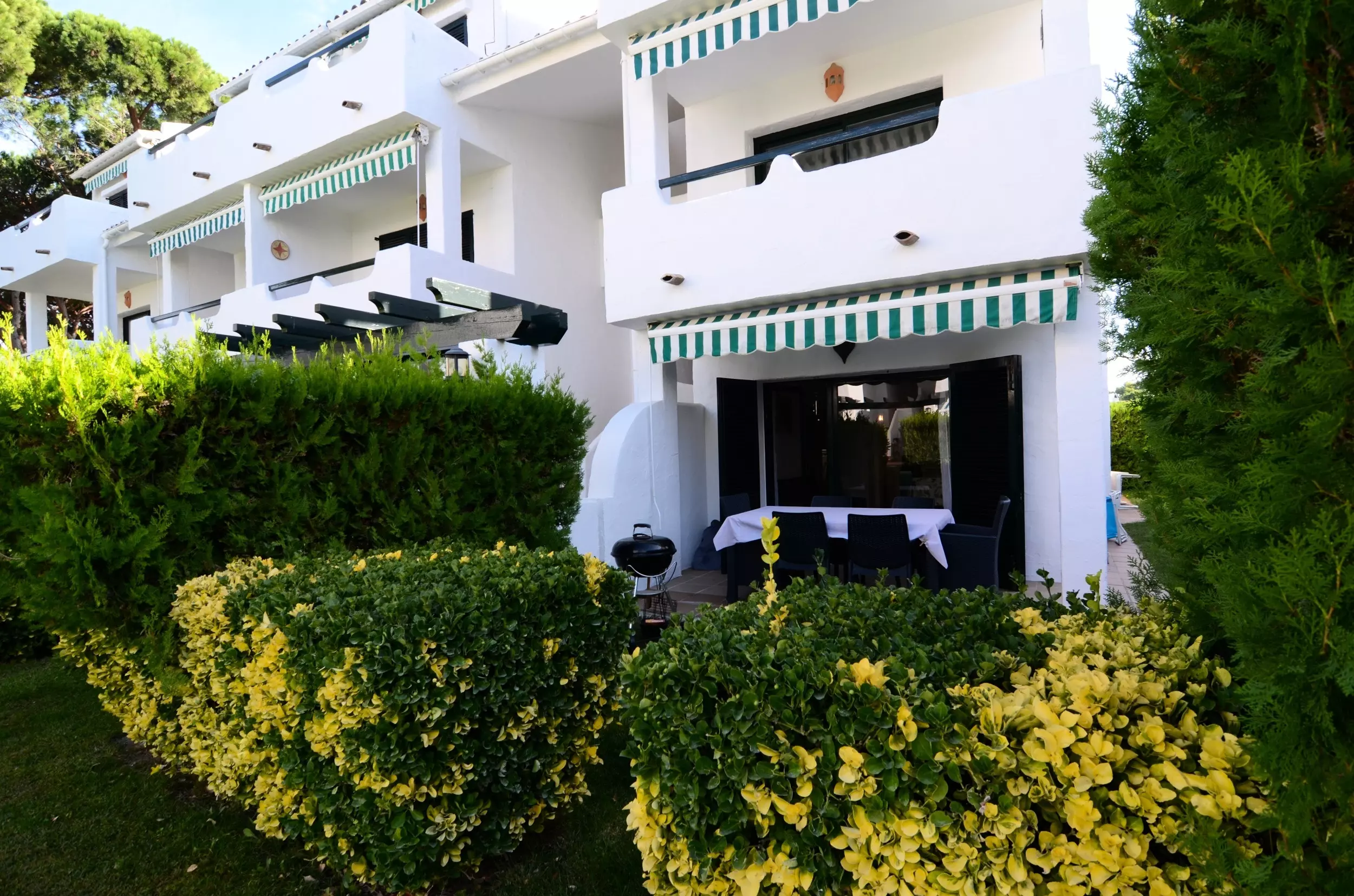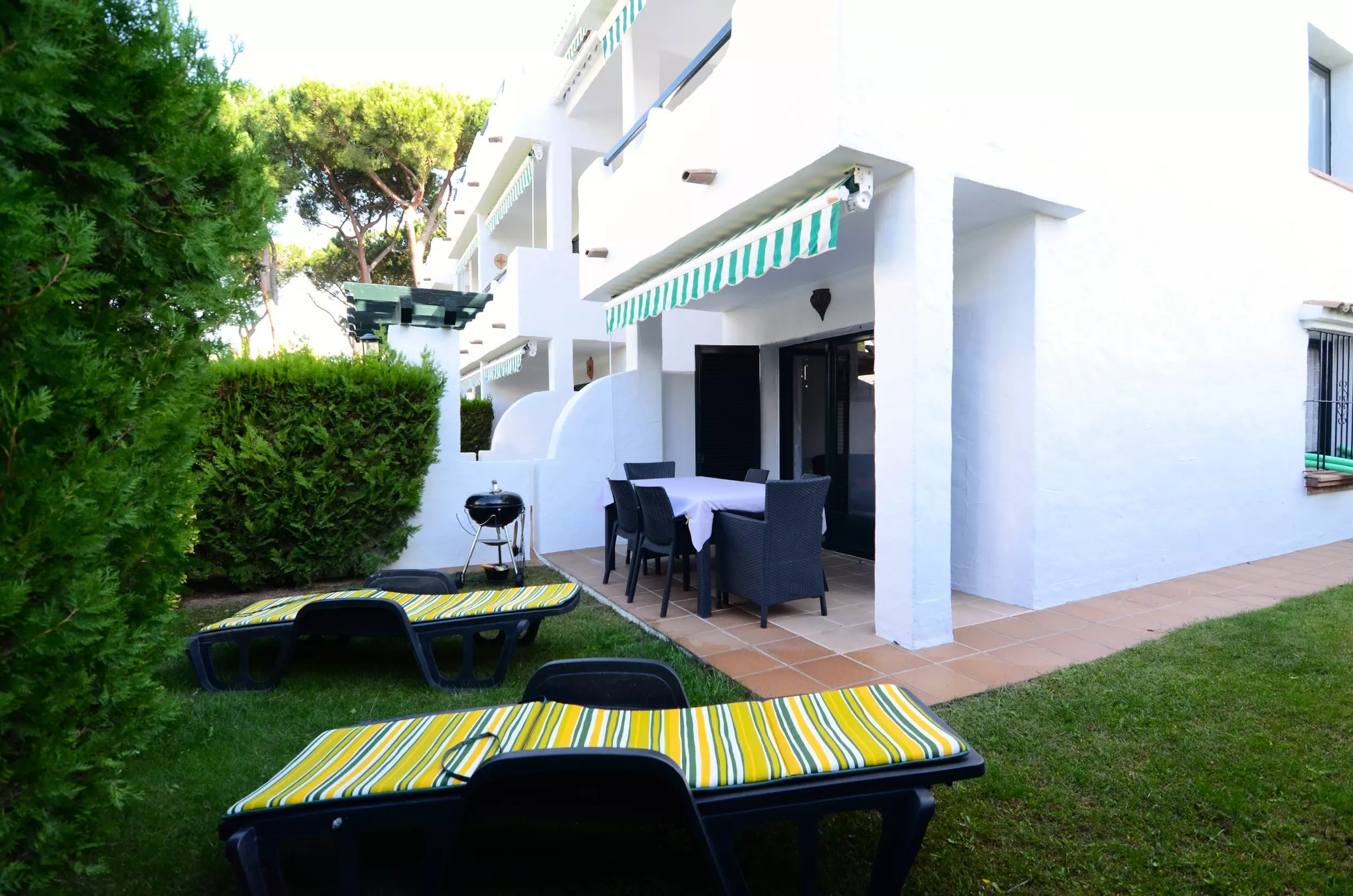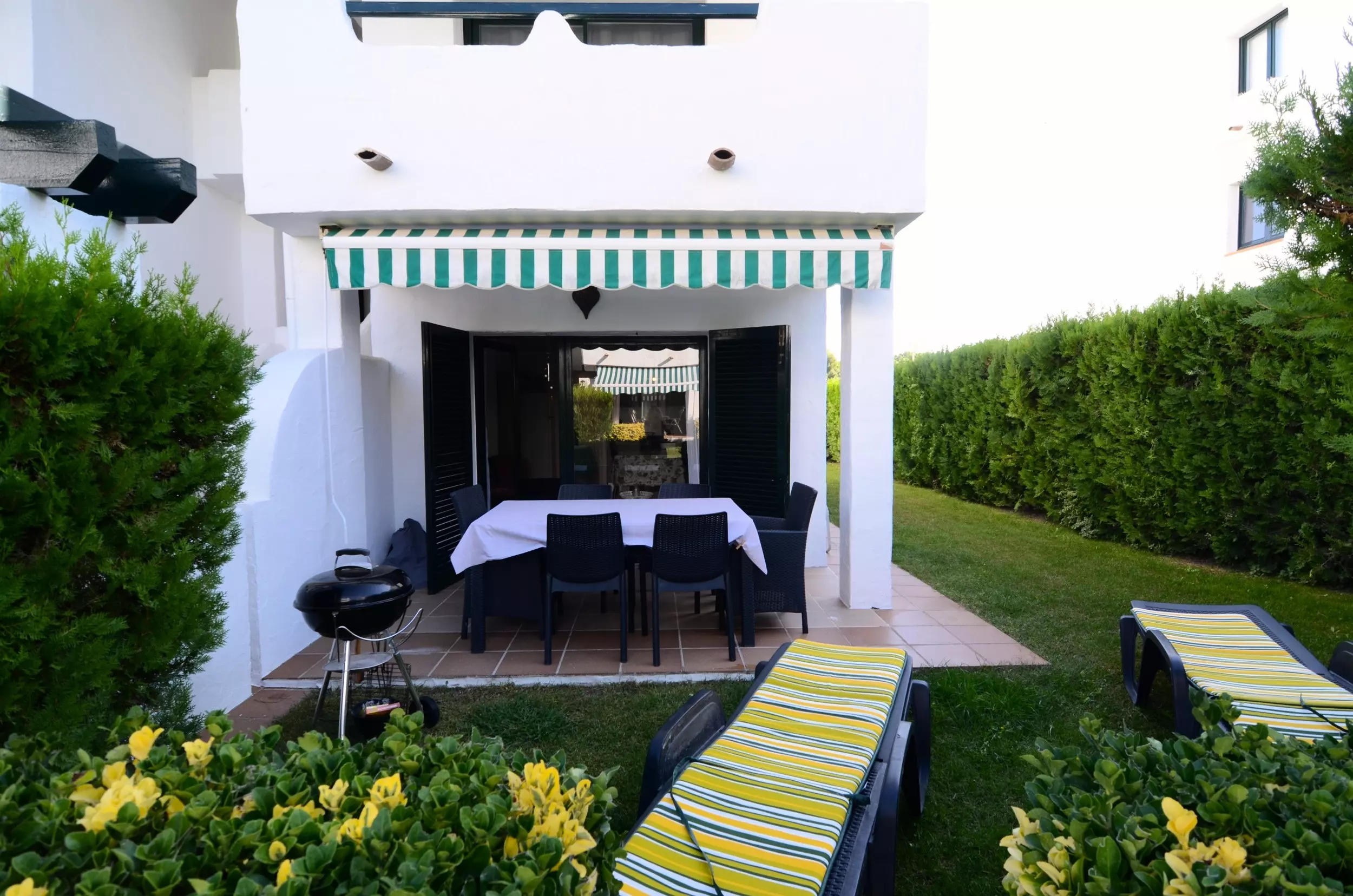 This ground-floor apartment features a large private garden with direct access to the shared pool. It has a barbecue, hammocks, and a table for outdoor dining.