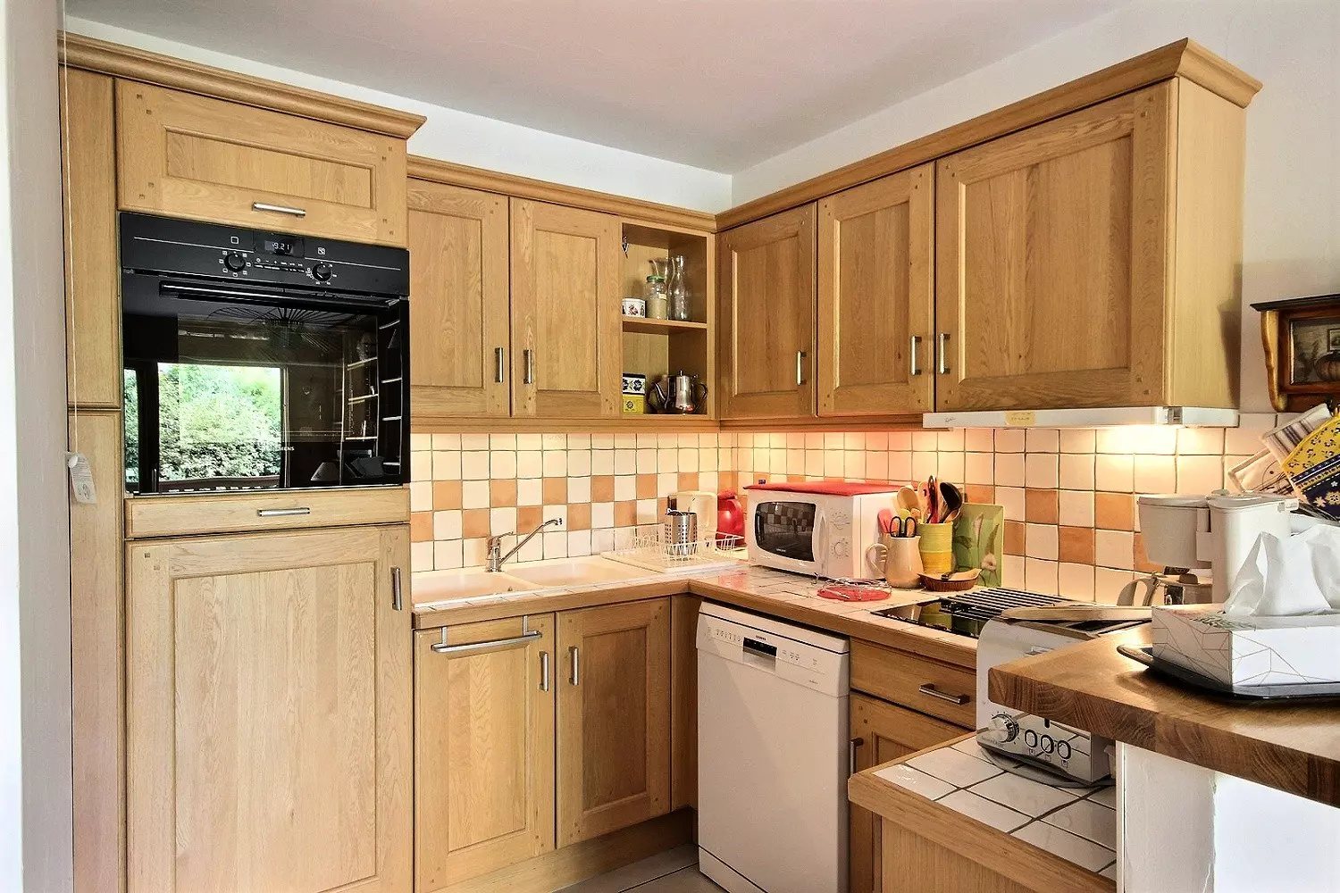 It is equipped with ceramic hobs, an oven, a microwave, a dishwasher and a refrigerator with freezer.