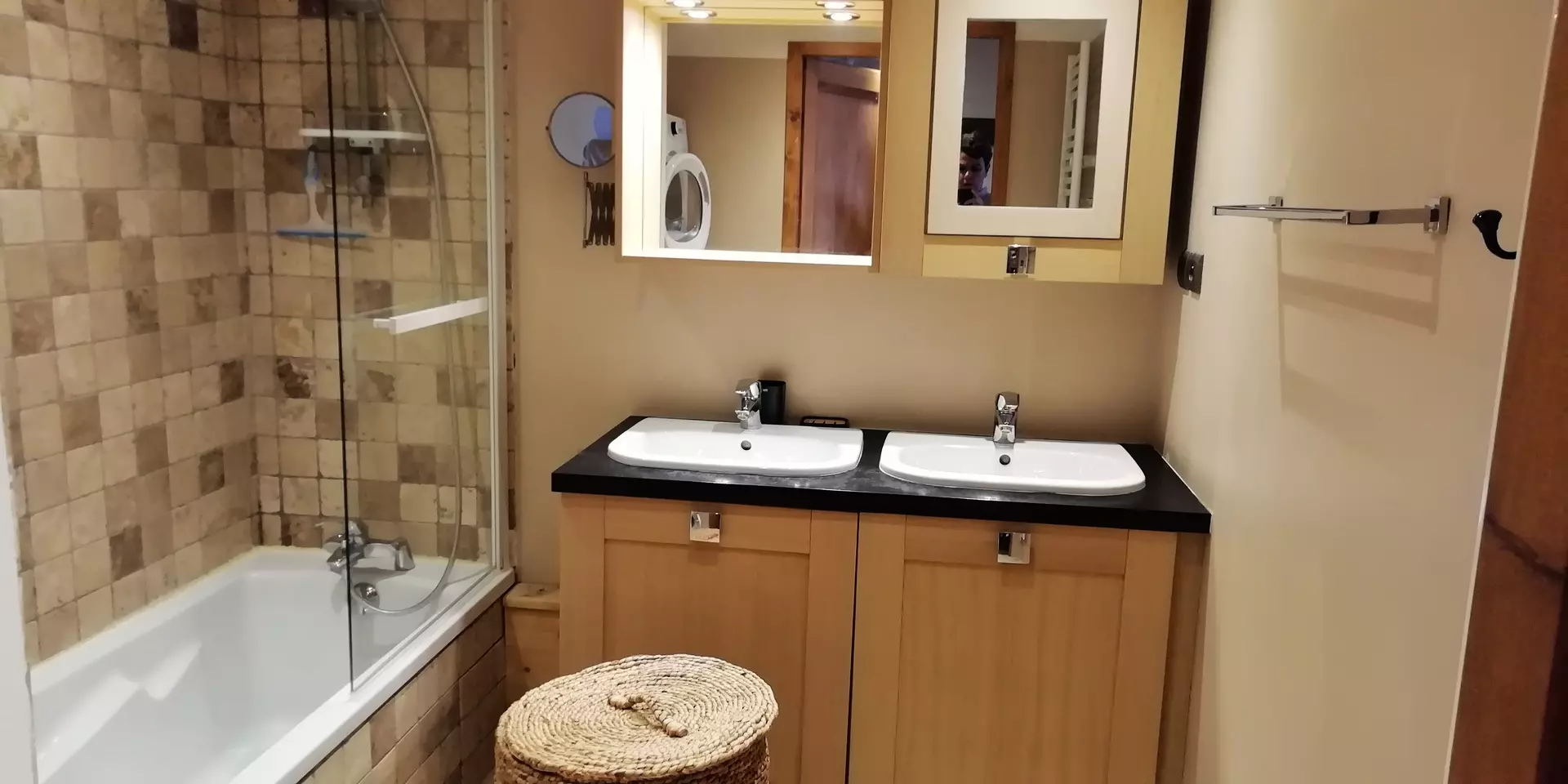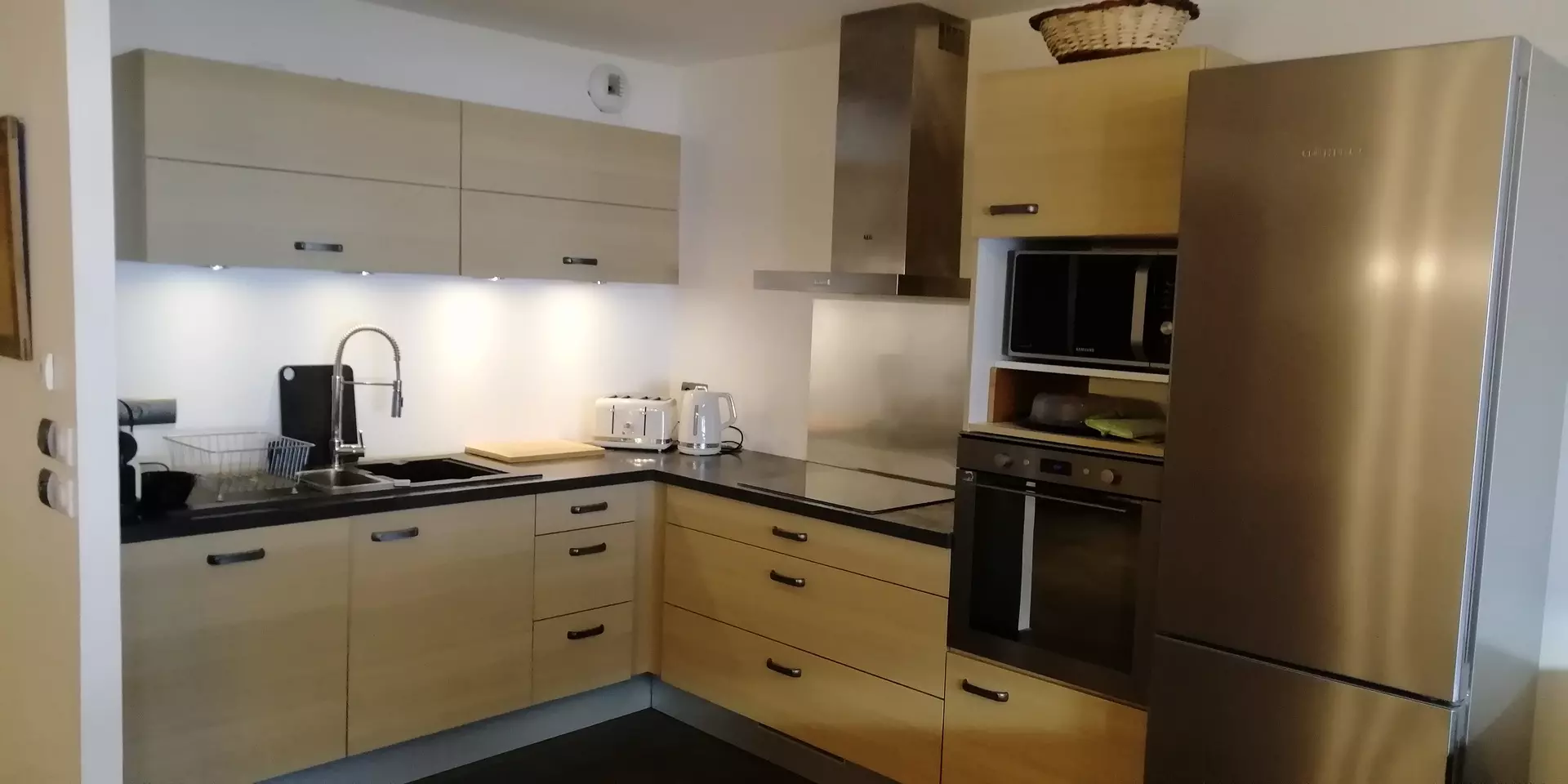It is equipped with induction hobs, an oven, a microwave, a dishwasher and a refrigerator with freezer.