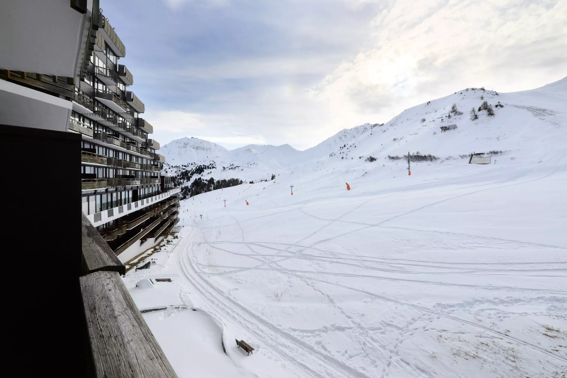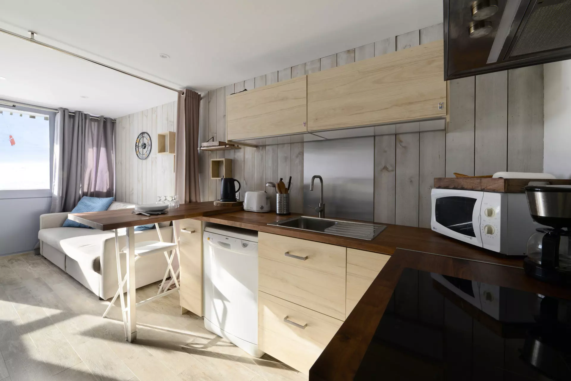 This studio, renovated in 2019, is located on level "H" of the Paquebot des Neiges and is accessible by the "Zénith" elevator. It features a kitchen open to the living room, a bathroom, and a separate toilet. Its south-facing balcony offers a lovely view of the slopes.