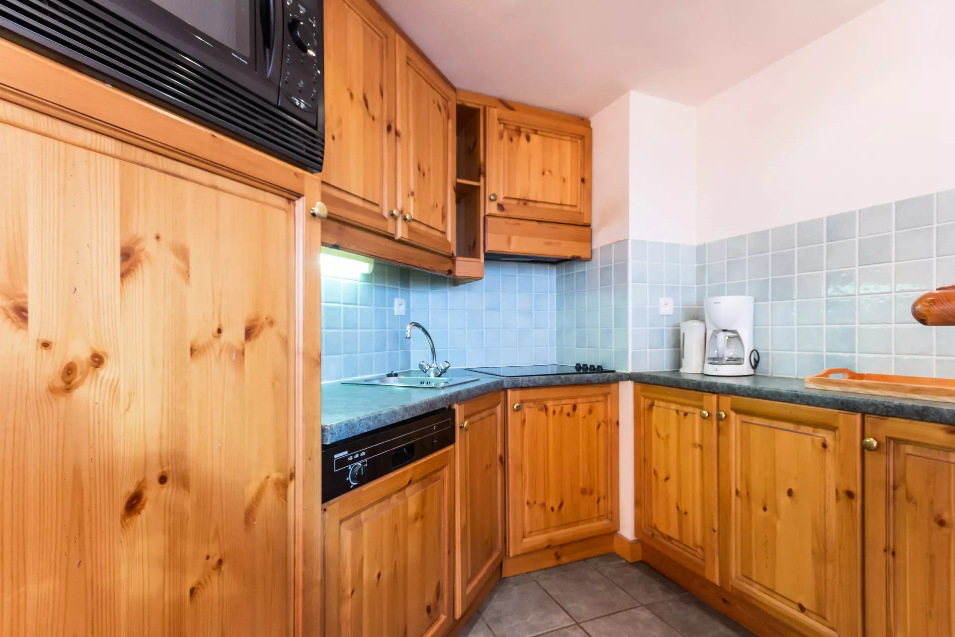 The kitchen, open to the living room via a bar-counter, is equipped with ceramic hobs, a refrigerator, a combination microwave oven and a dishwasher.