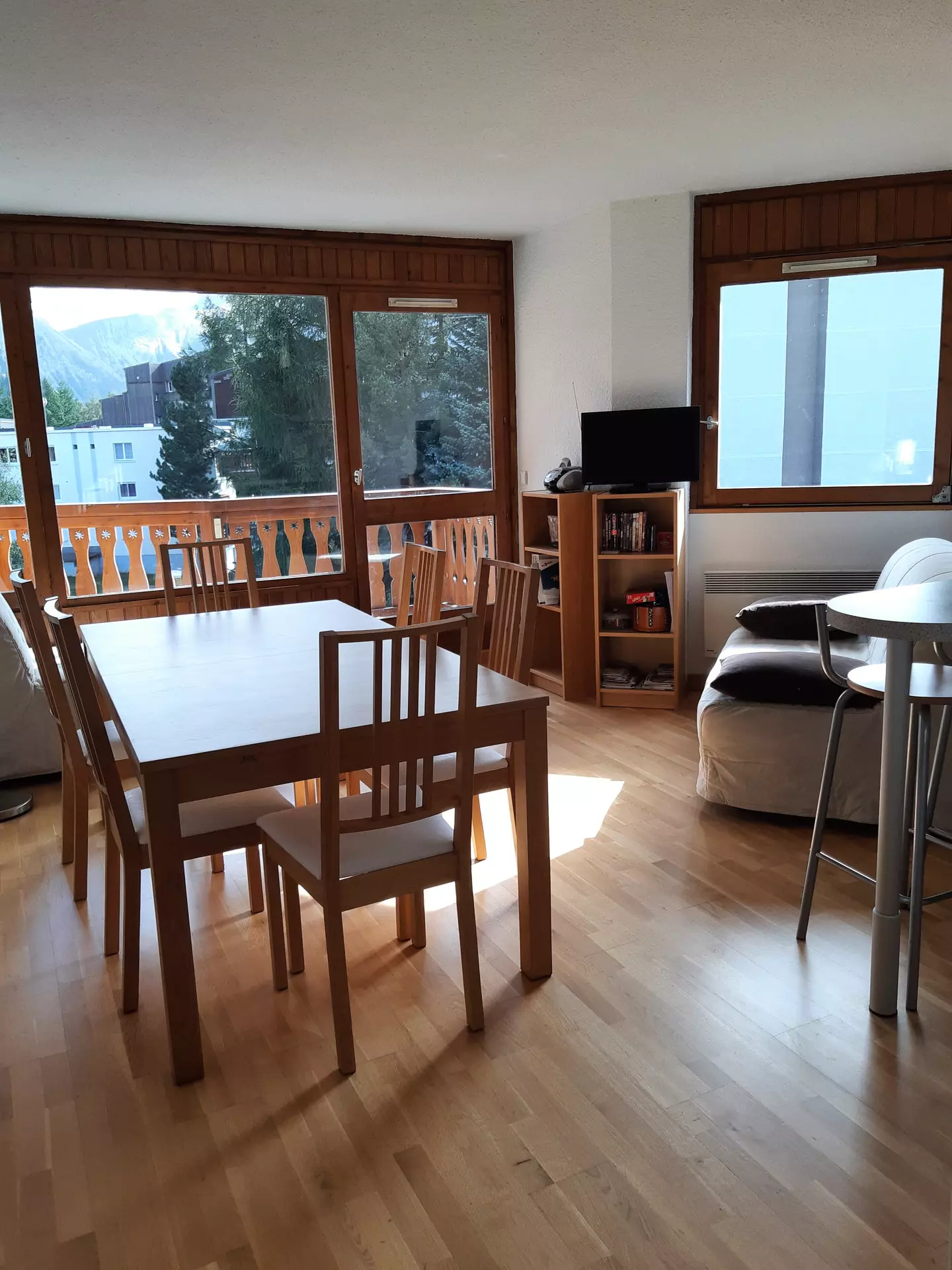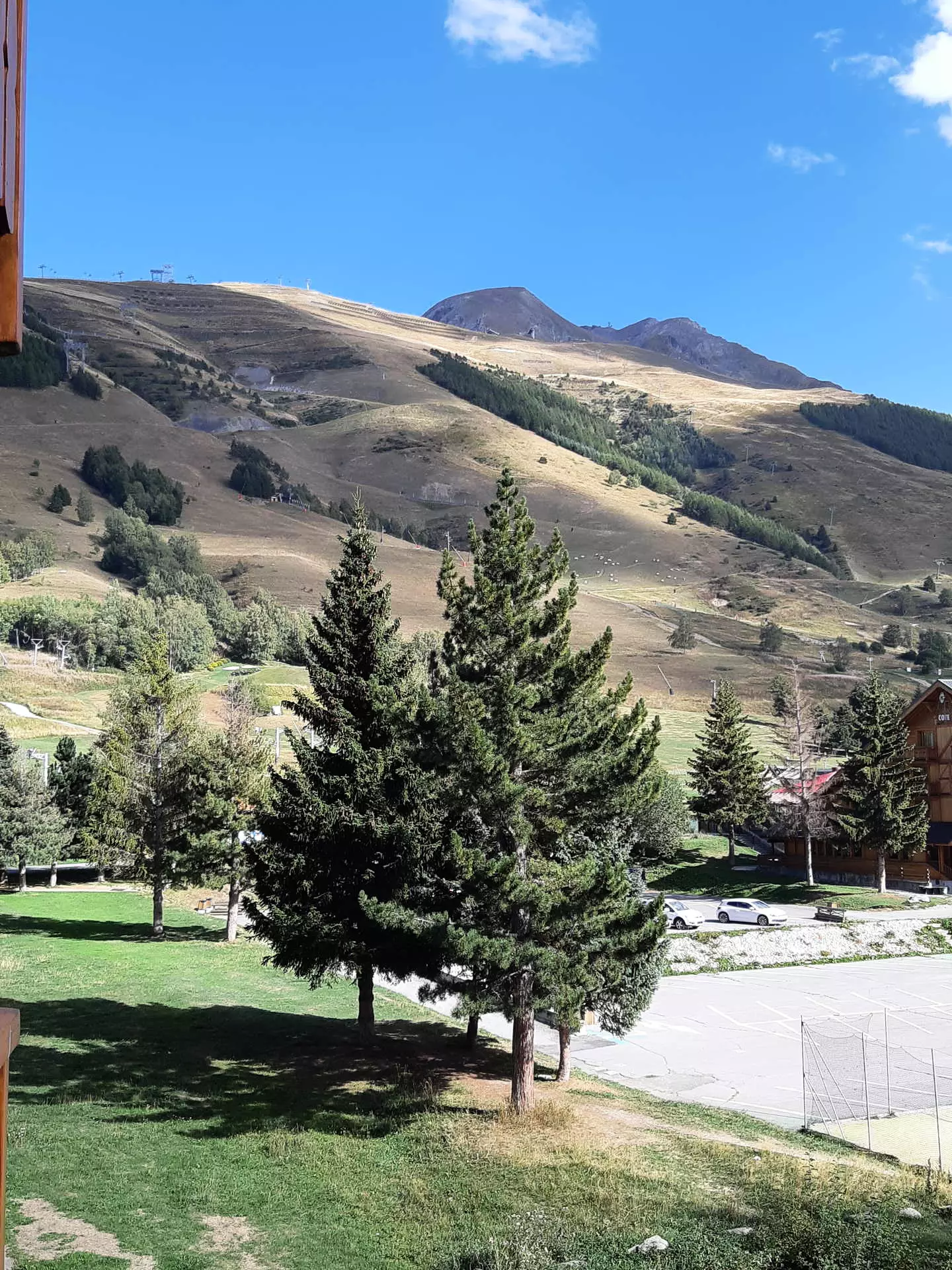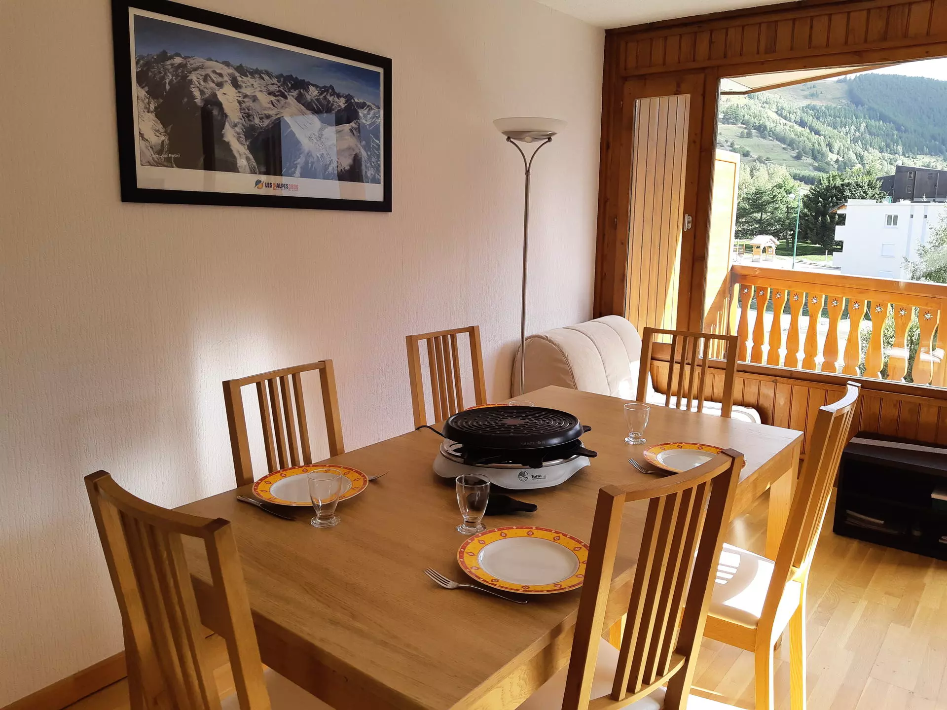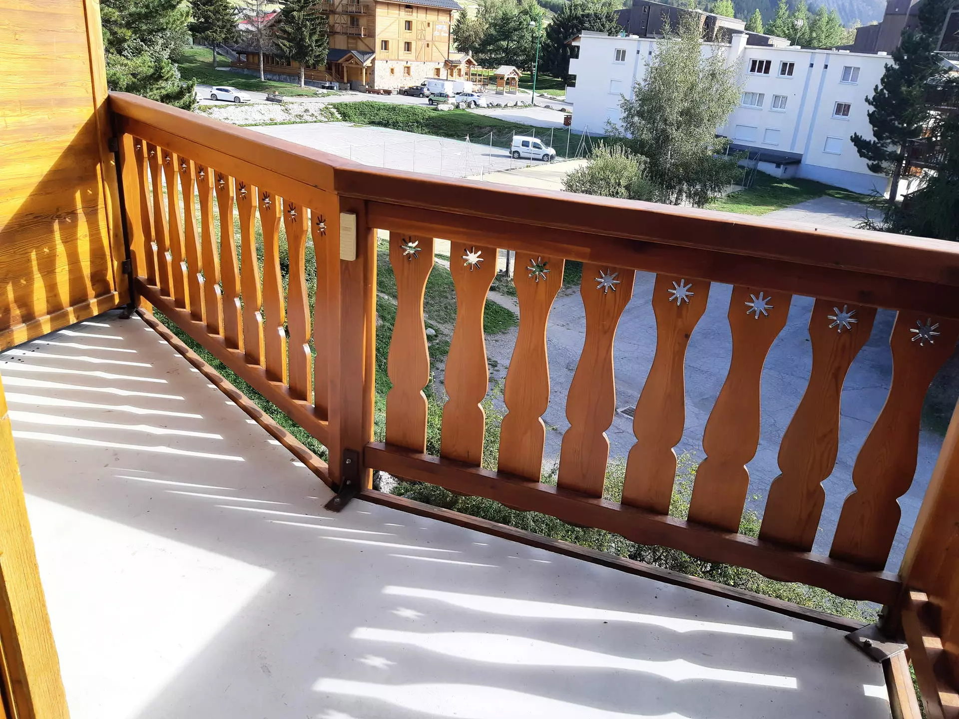 South-facing balcony with views of the mountains and the slopes.