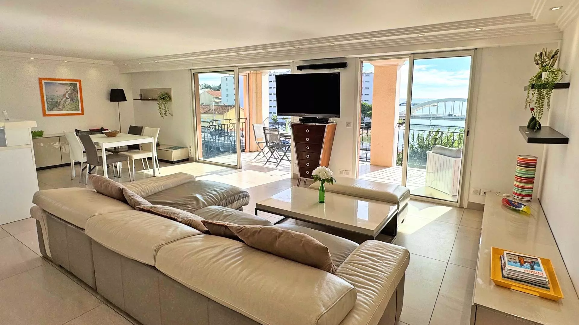 - Large living room with lounge and dining area with sofa, coffee table, flat screen TV, table and chairs, double opening onto the terrace