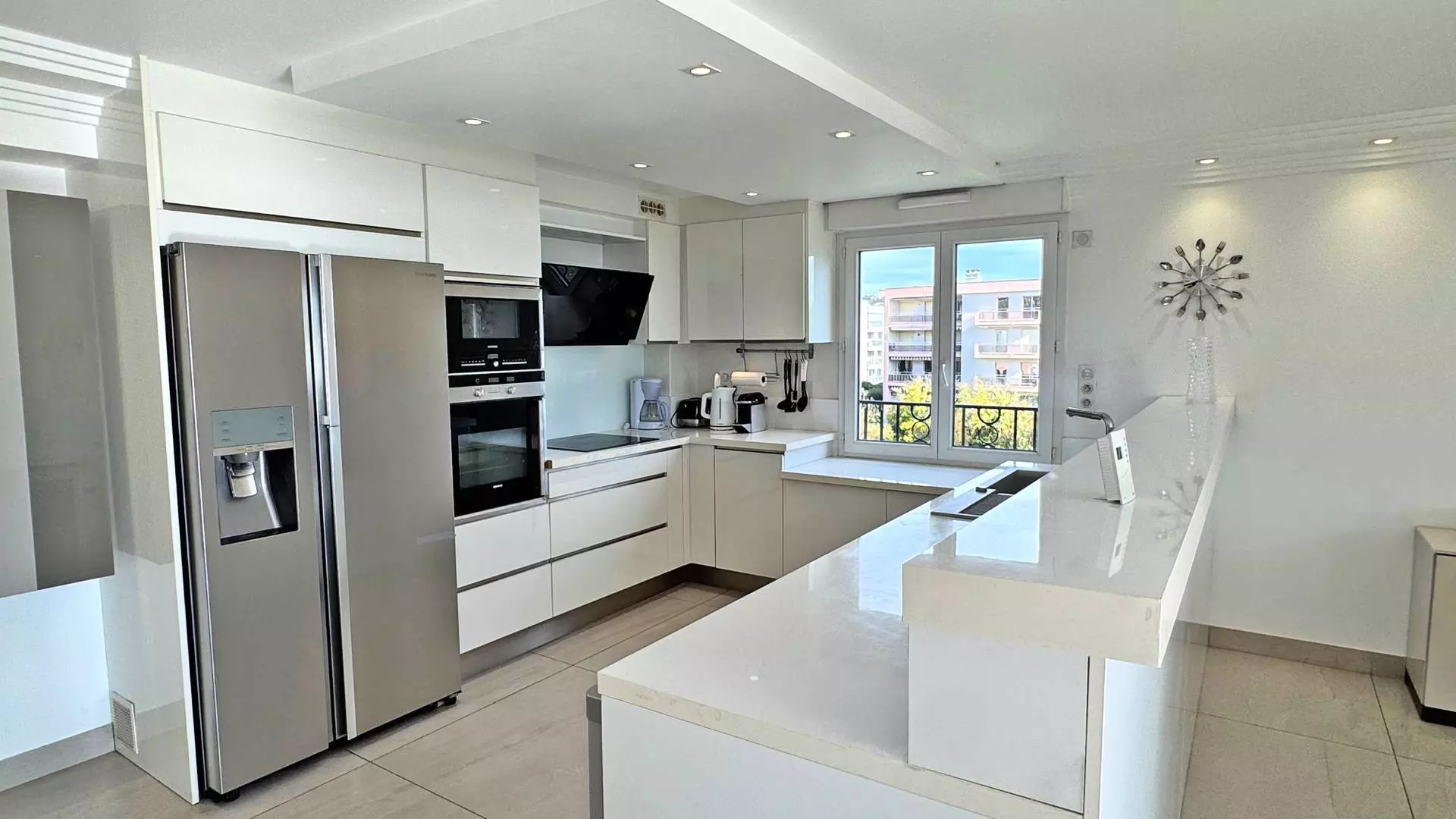 - Fully equipped American kitchen with US fridge/freezer, dishwasher, oven, microwave, coffee maker, kettle, 3-burner hob, various dishes, kitchen utensils and electric wine cellar