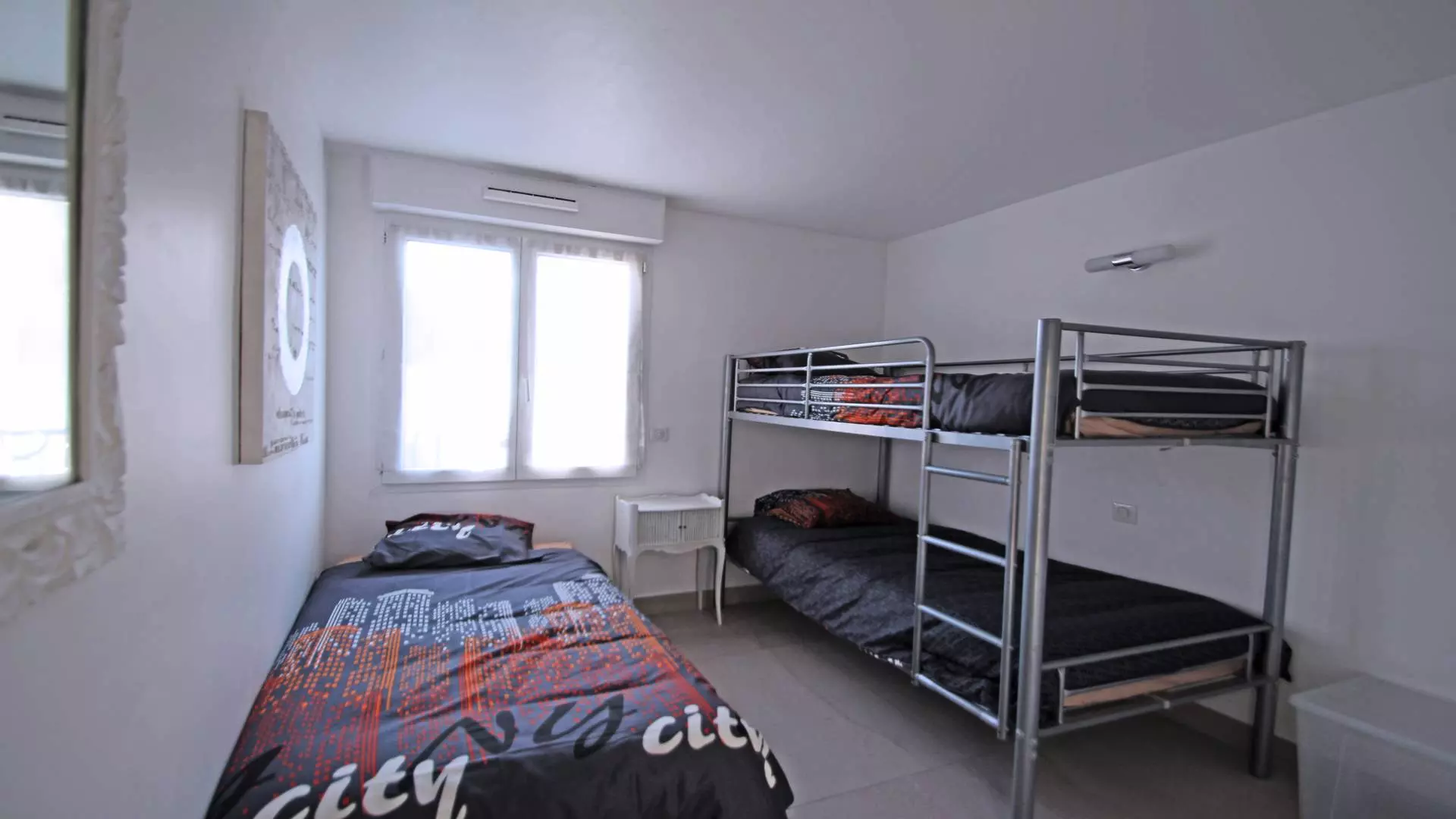 - Bedroom 2 with 2x90 bunk beds, a 90 single bed, closet