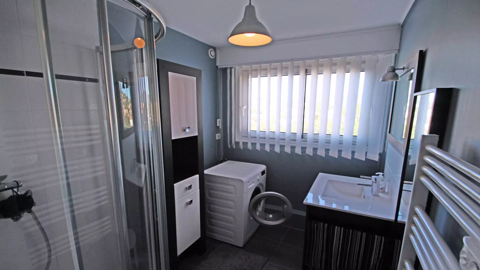 - Shower room with vanity unit, corner shower, storage and washing machine