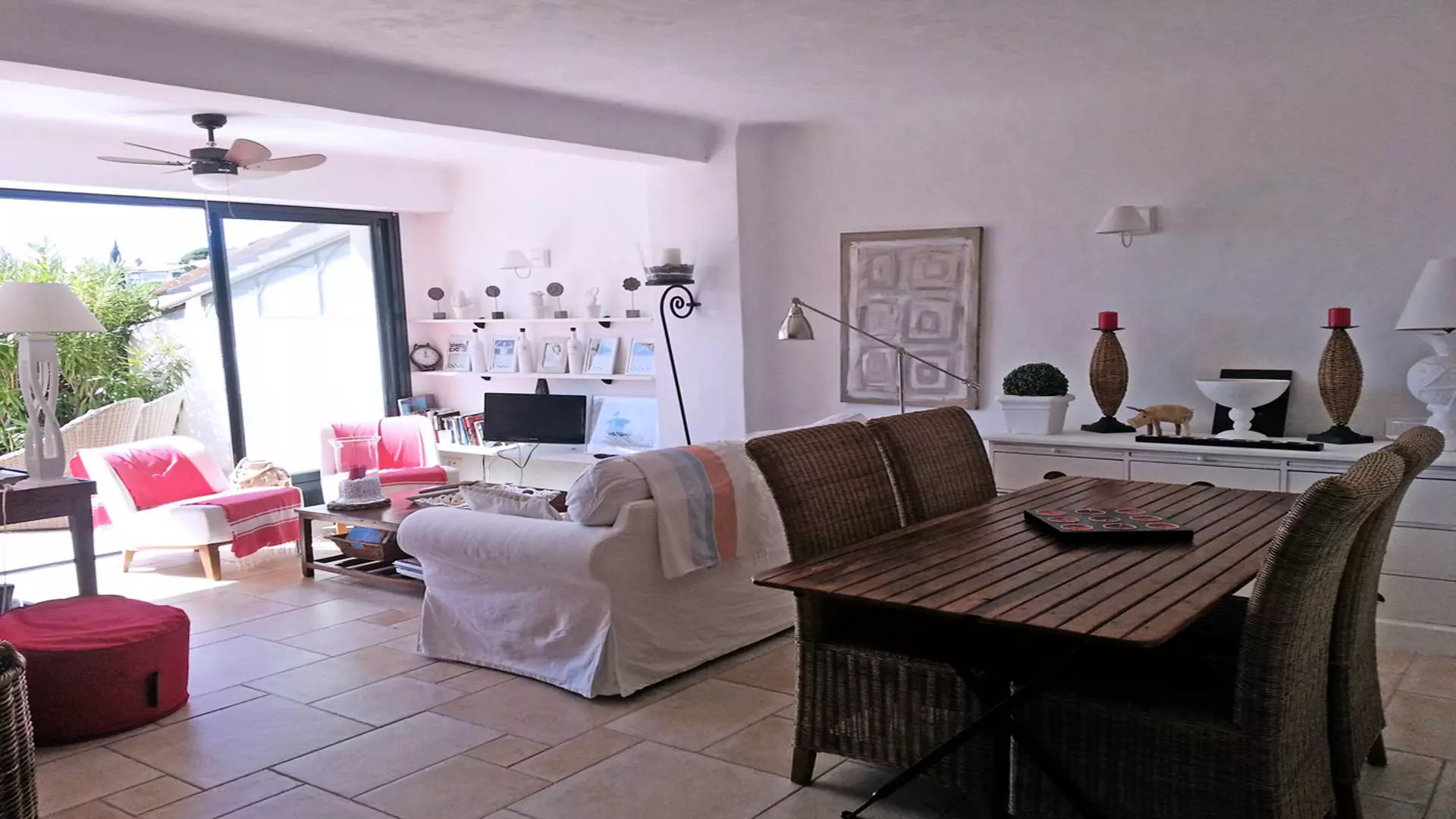 - Living room with sofa and 2 armchairs, flat screen TV and dining room, exterior access