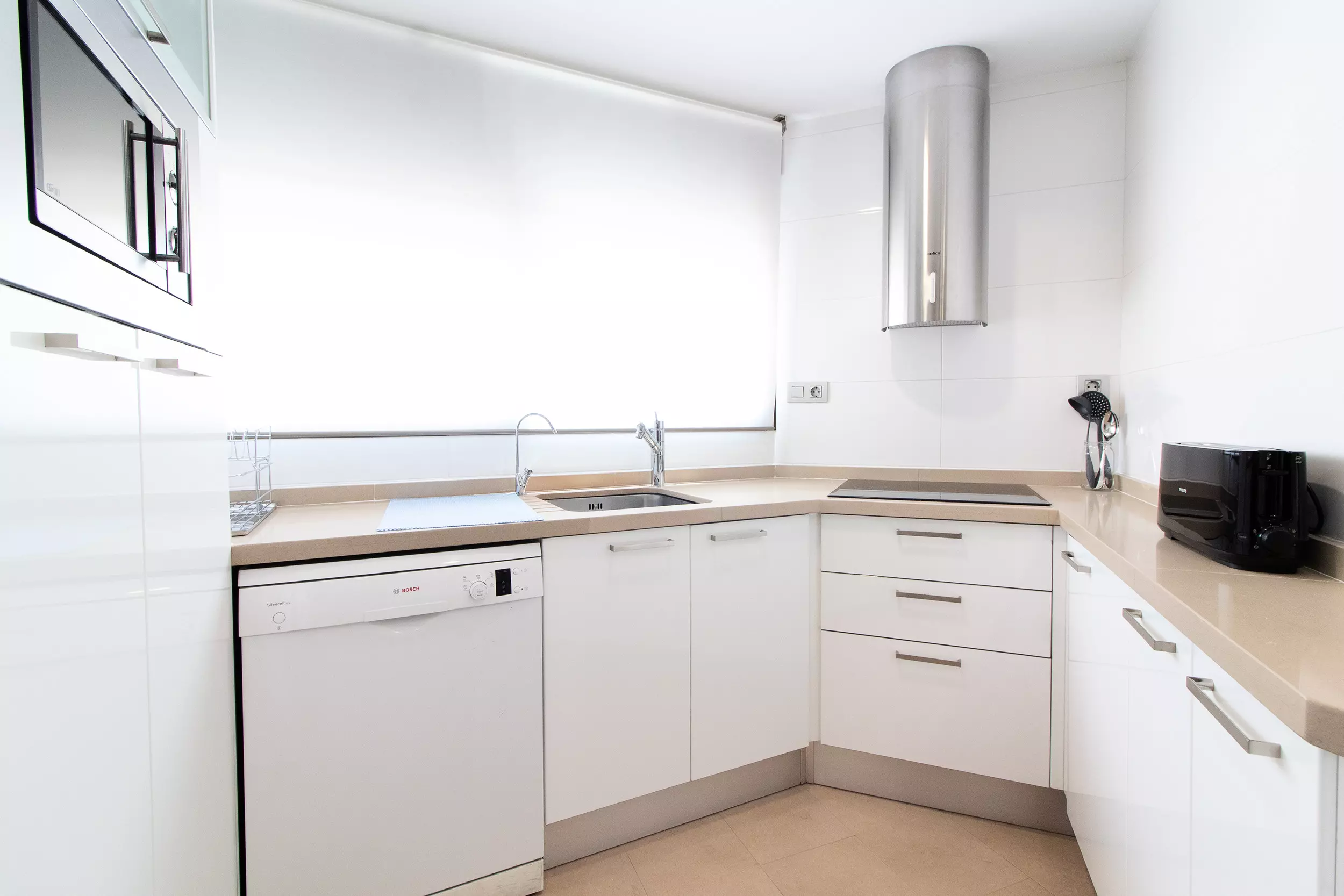 The independent kitchen, with induction hob, is equipped with refrigerator, microwave, oven, freezer, dishwasher, dishes/cutlery, kitchen utensils, coffee maker and toaster.