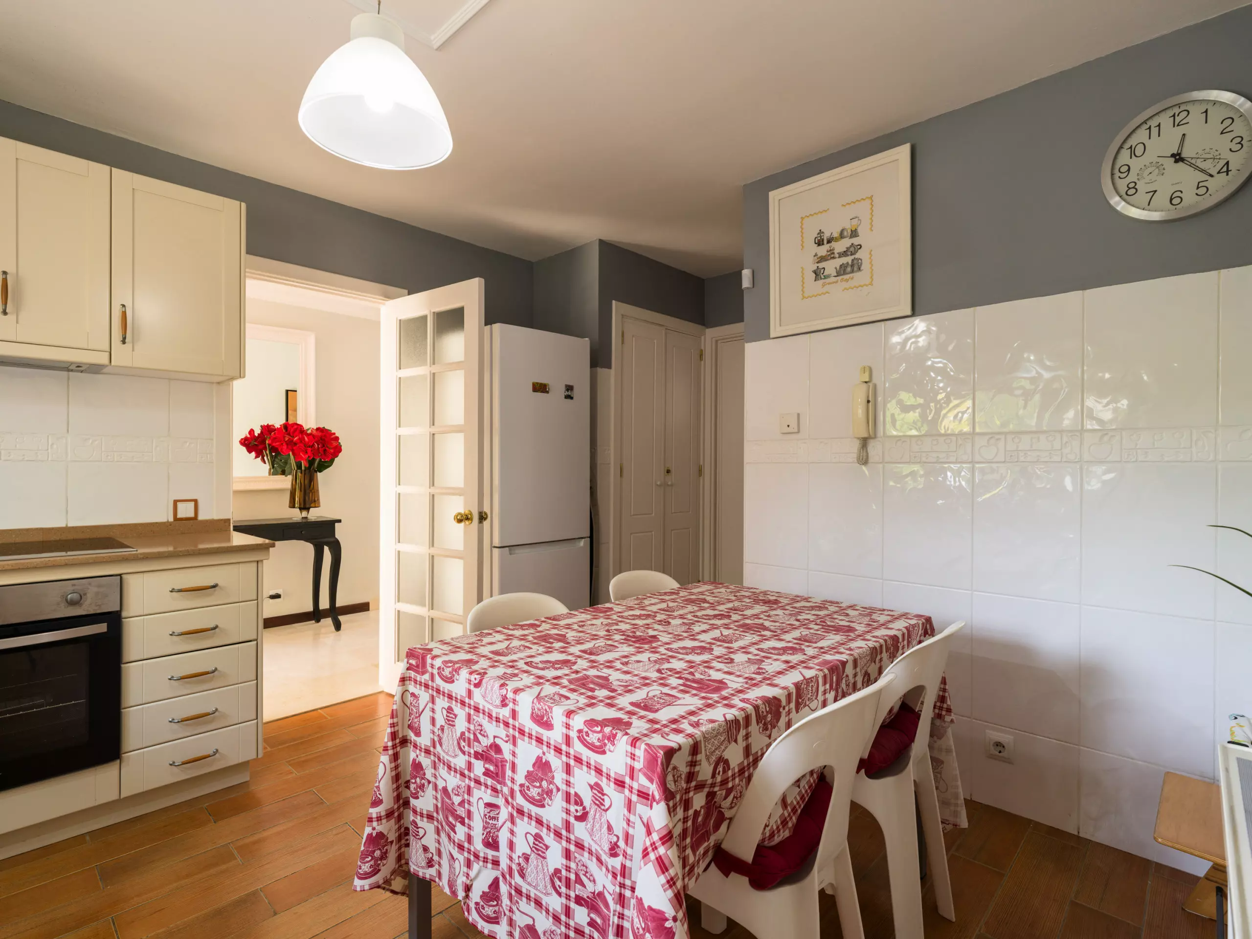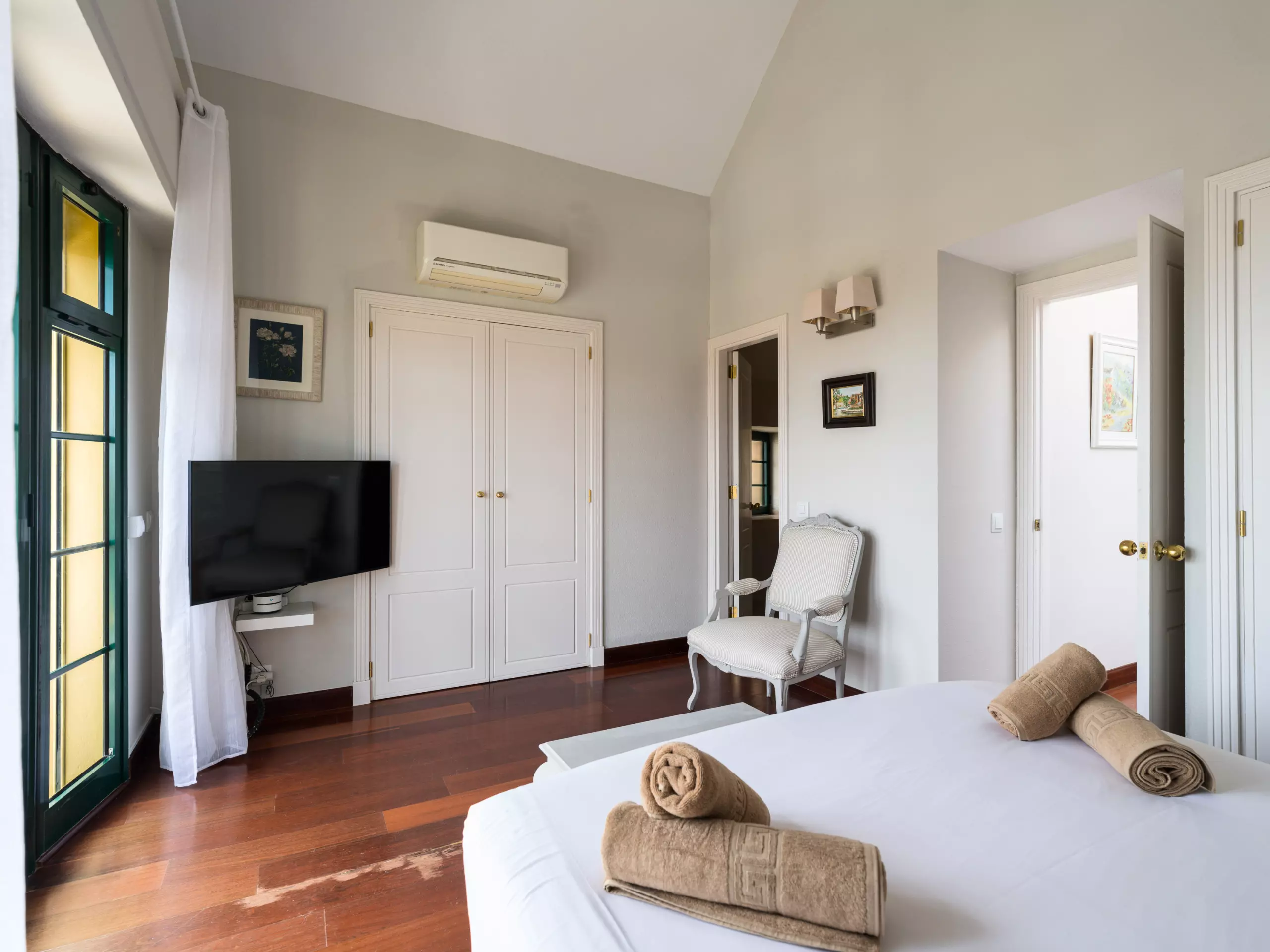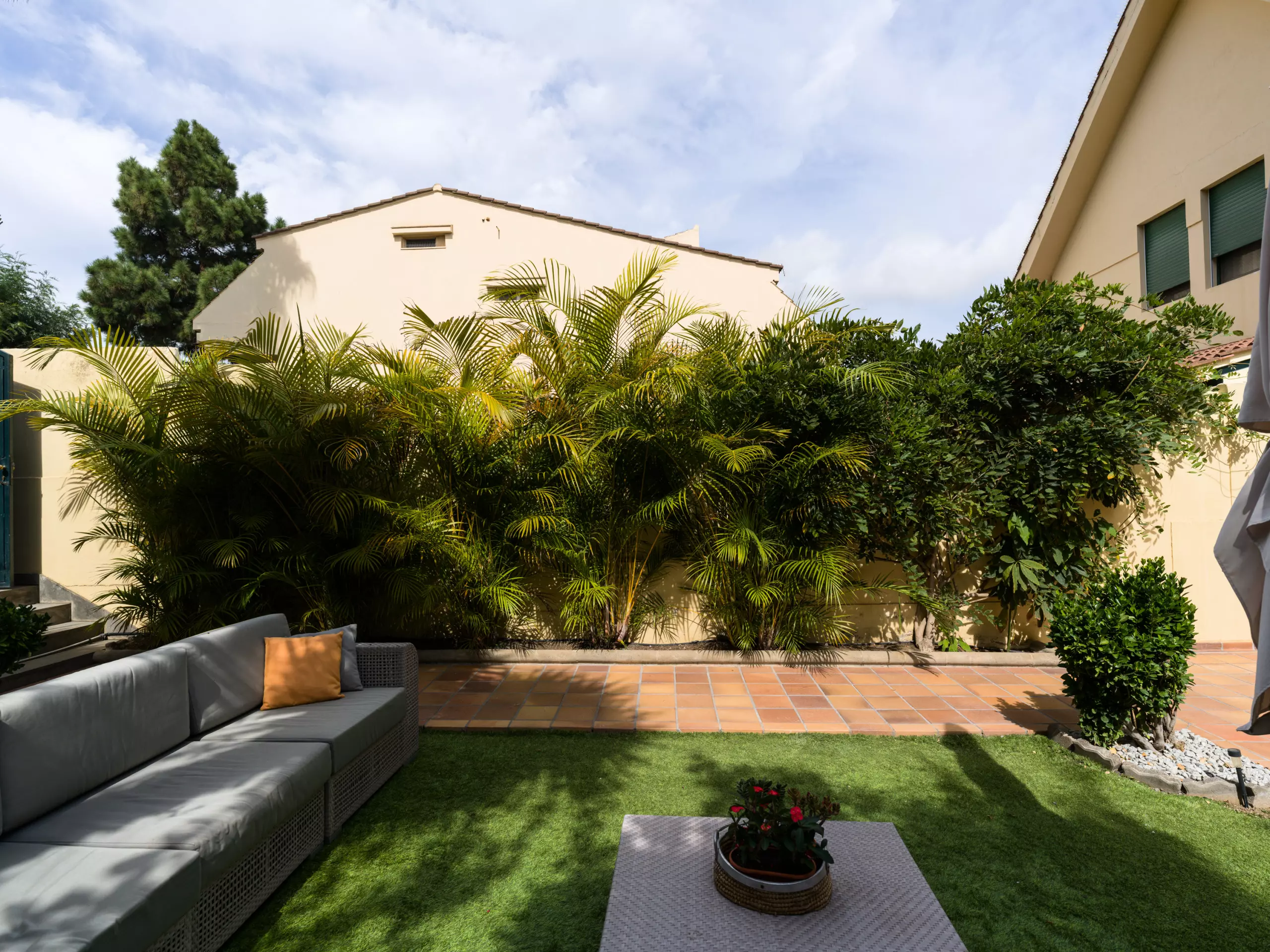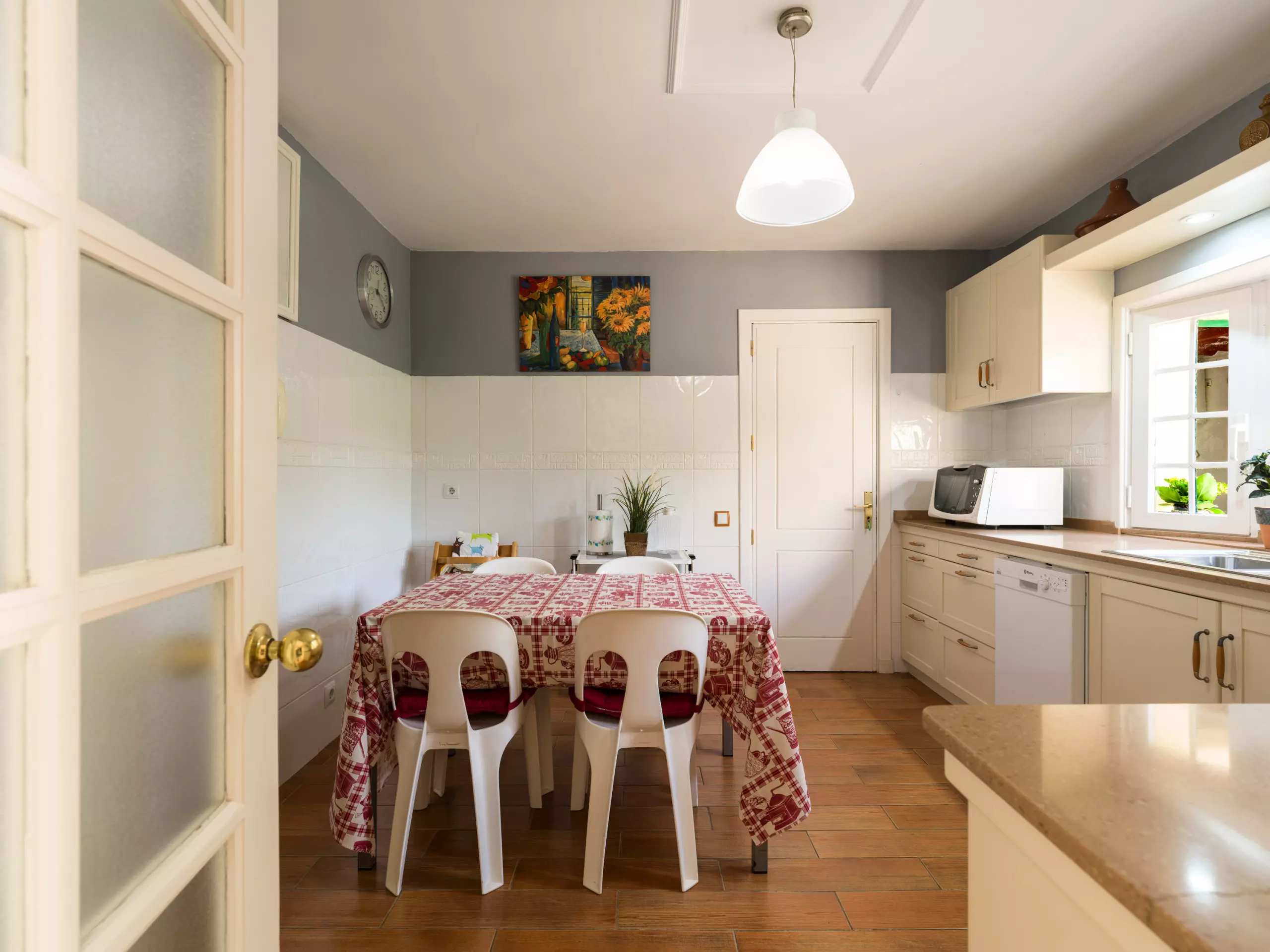 It has garden, garden furniture, fence, 50 m² terrace, washing machine, dryer, barbecue, fireplace, iron, internet access (wifi), hair dryer, tennis court, alarm, heat pump heating, air conditioning in the living room and some bedrooms, outdoor parking in the same building, 1 fan, mosquito nets in the bedroom, 1 TV, radio.