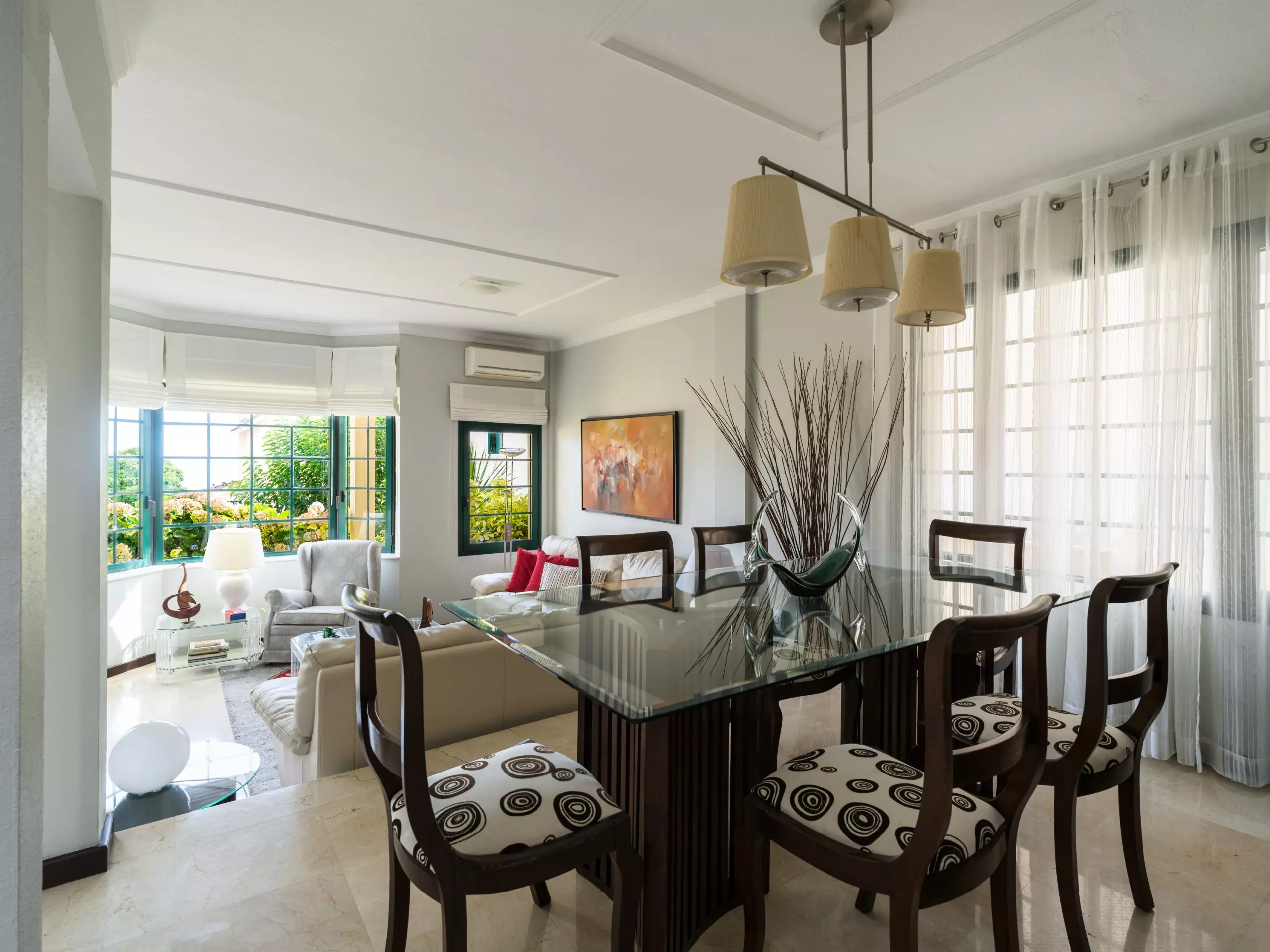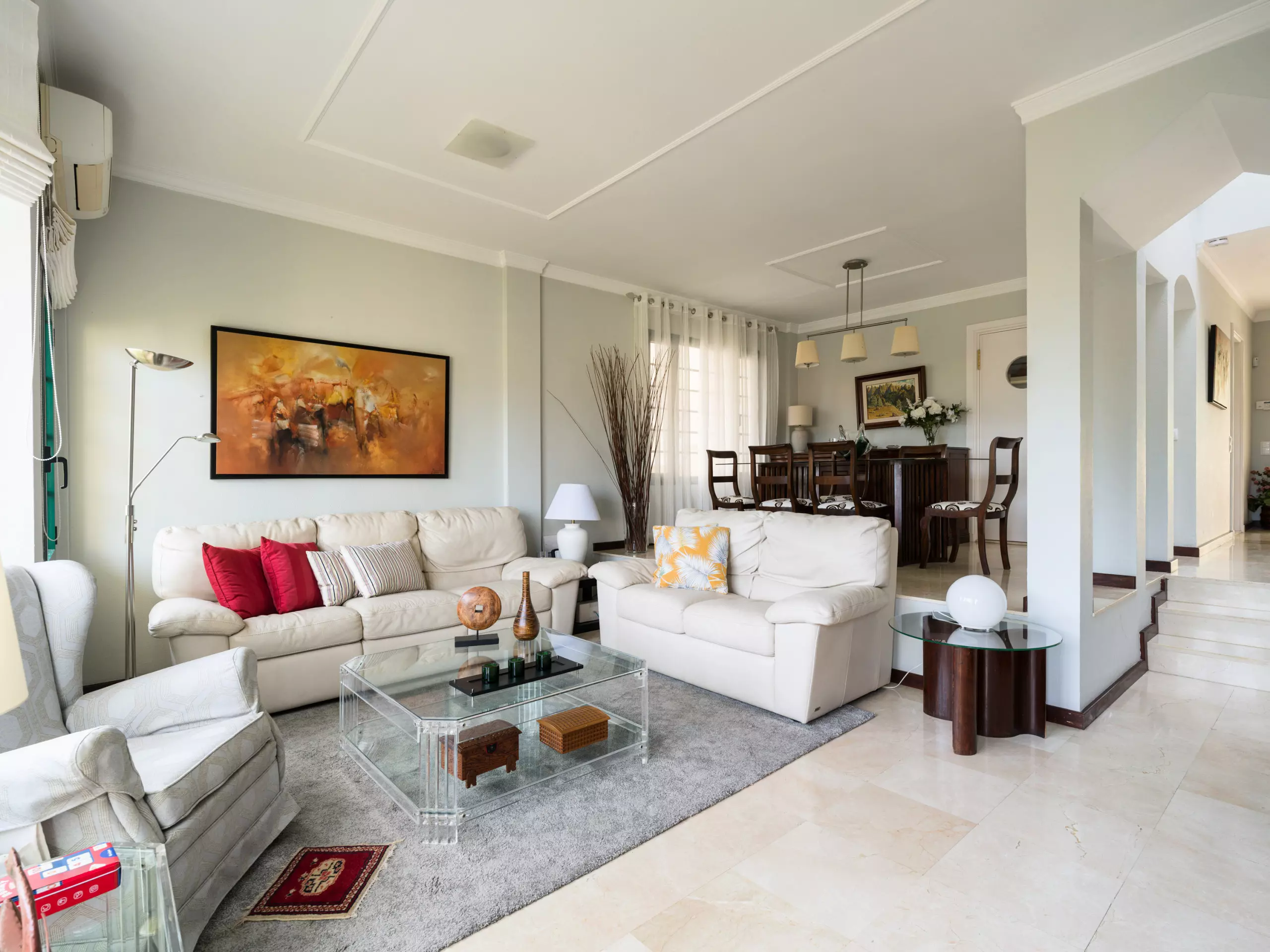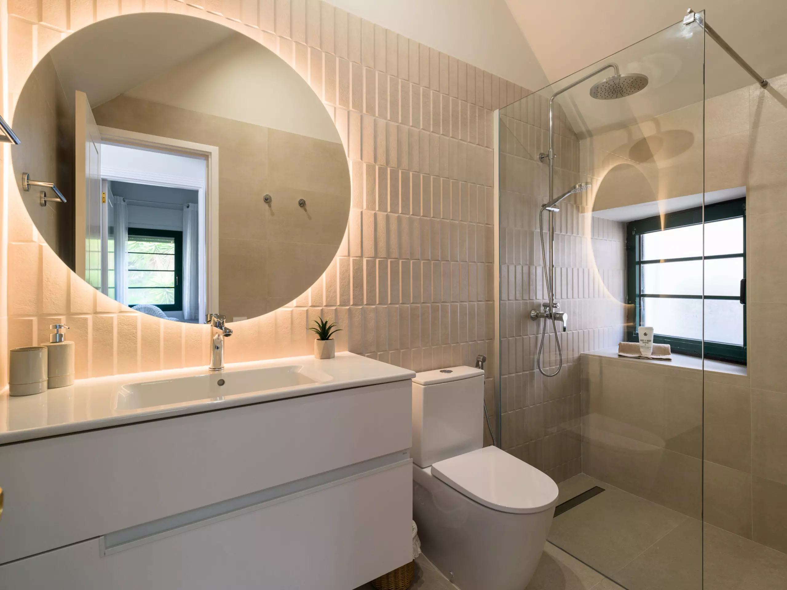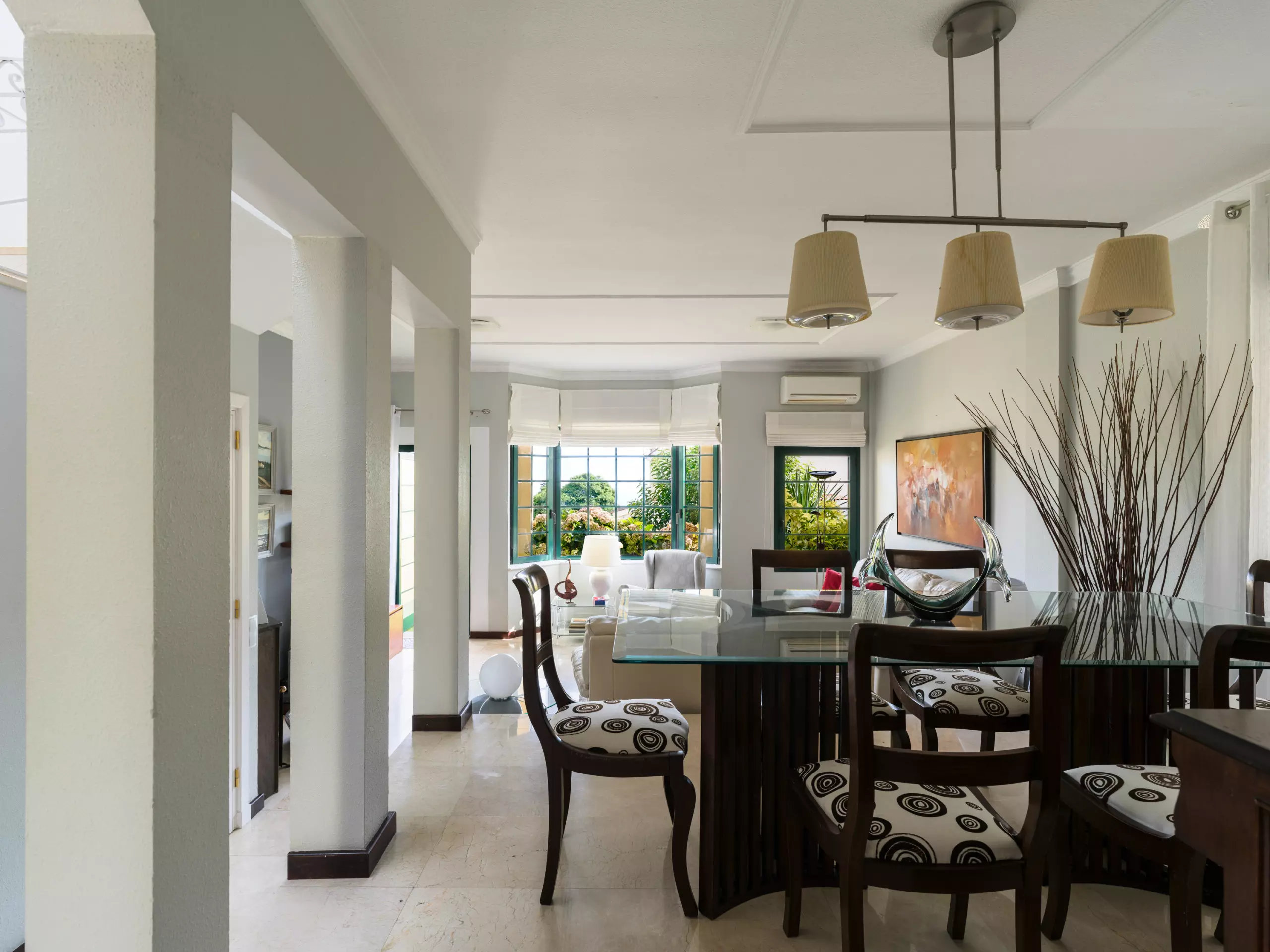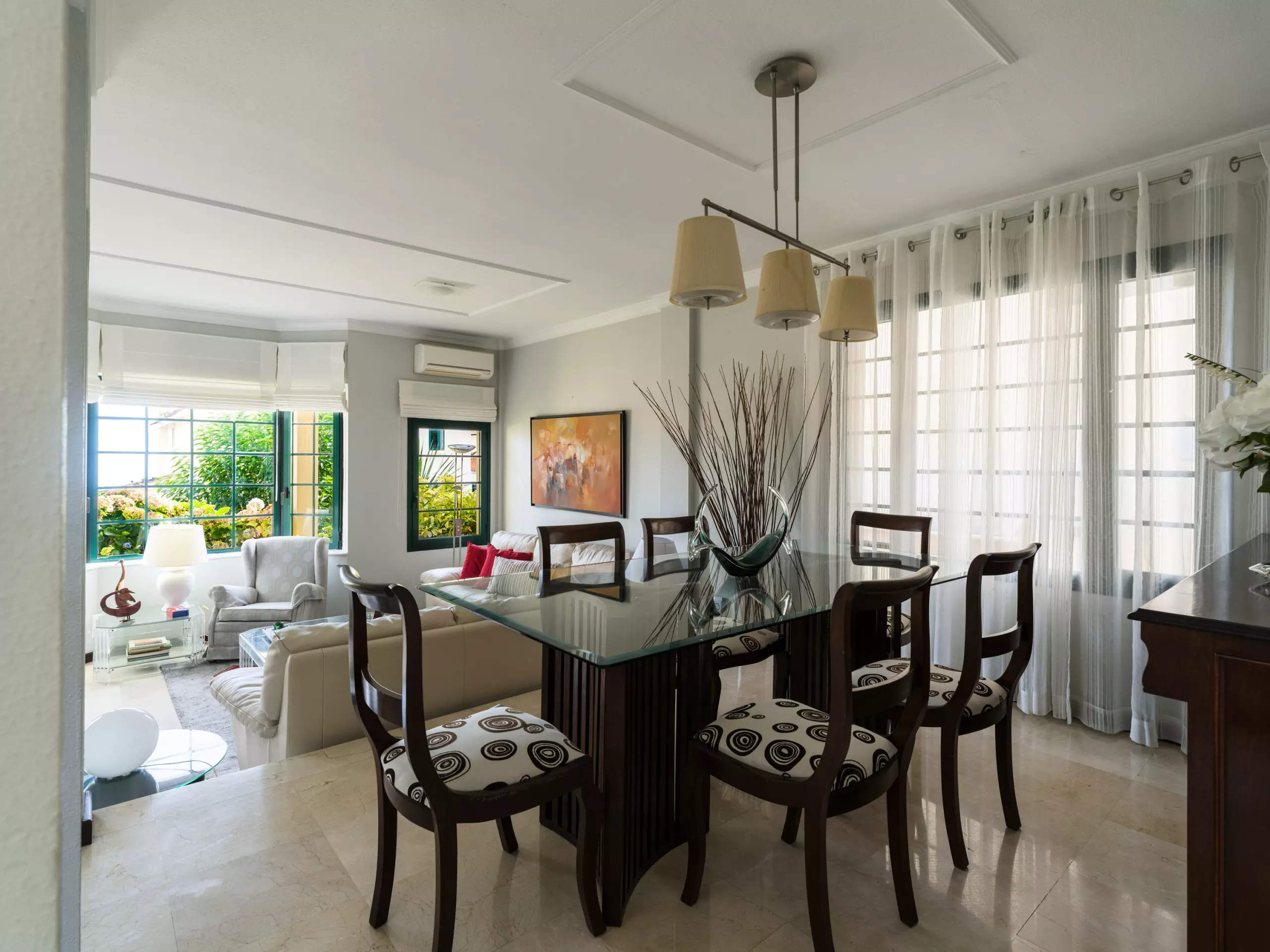It has garden, garden furniture, fence, 50 m² terrace, washing machine, dryer, barbecue, fireplace, iron, internet access (wifi), hair dryer, tennis court, alarm, heat pump heating, air conditioning in the living room and some bedrooms, outdoor parking in the same building, 1 fan, mosquito nets in the bedroom, 1 TV, radio.