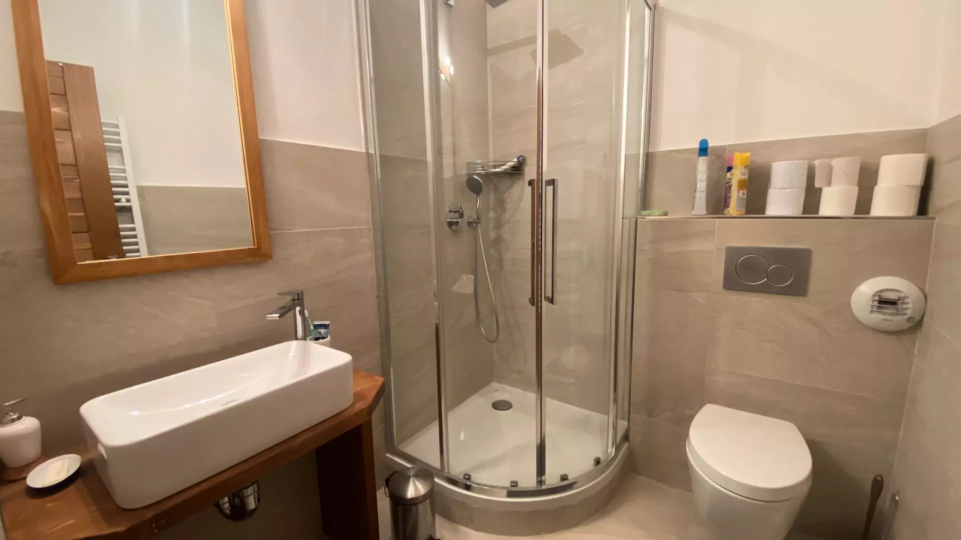 Duplex bathroom: Walk-in shower with shower screen, vanity unit with sink, mirror, wall-mounted electric towel dryer, WC.