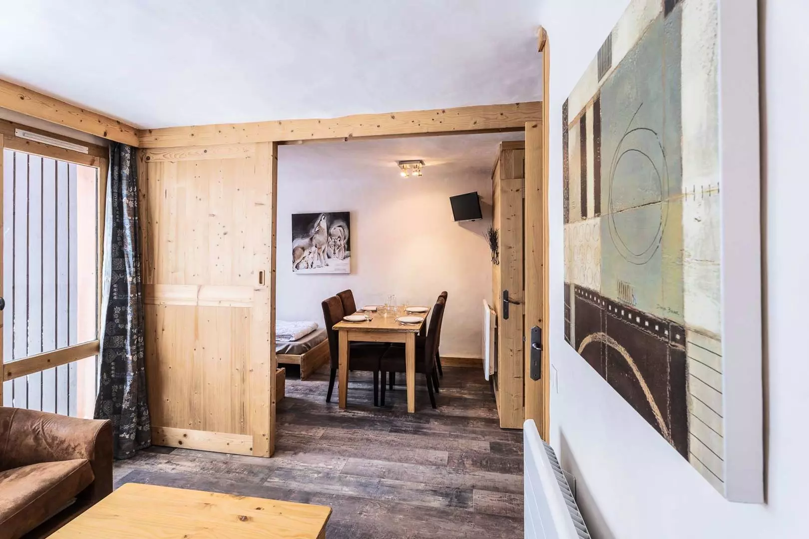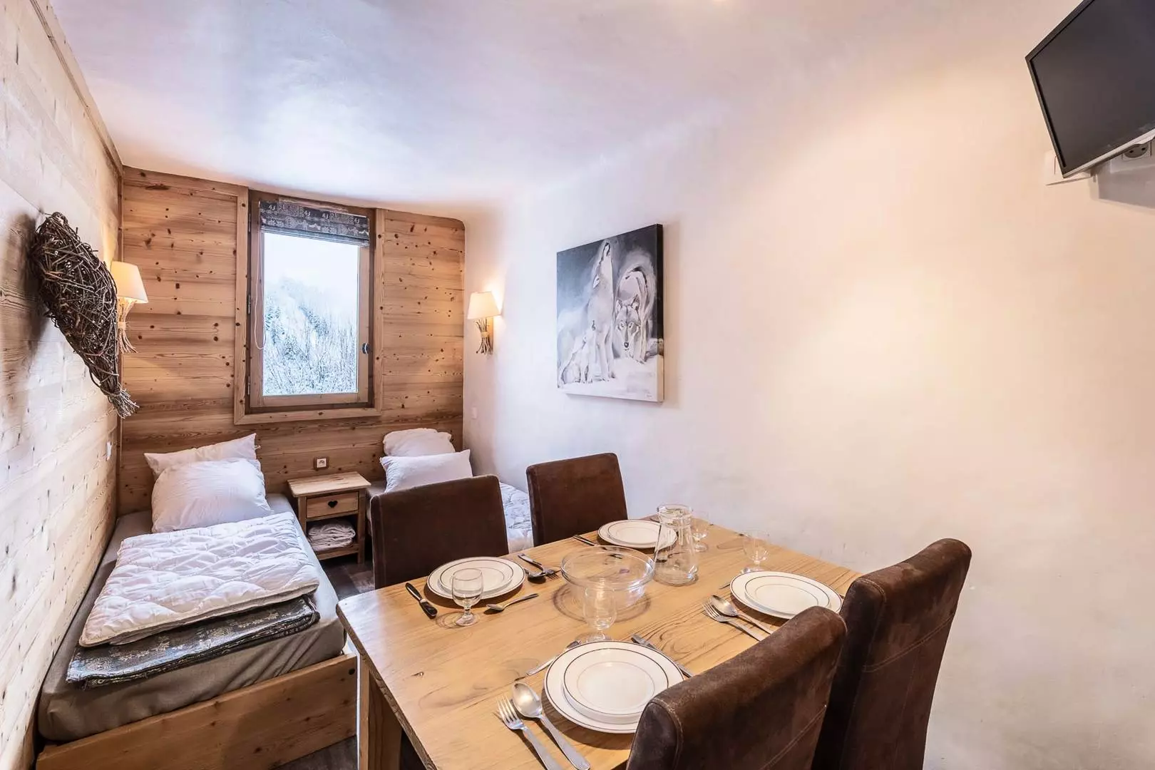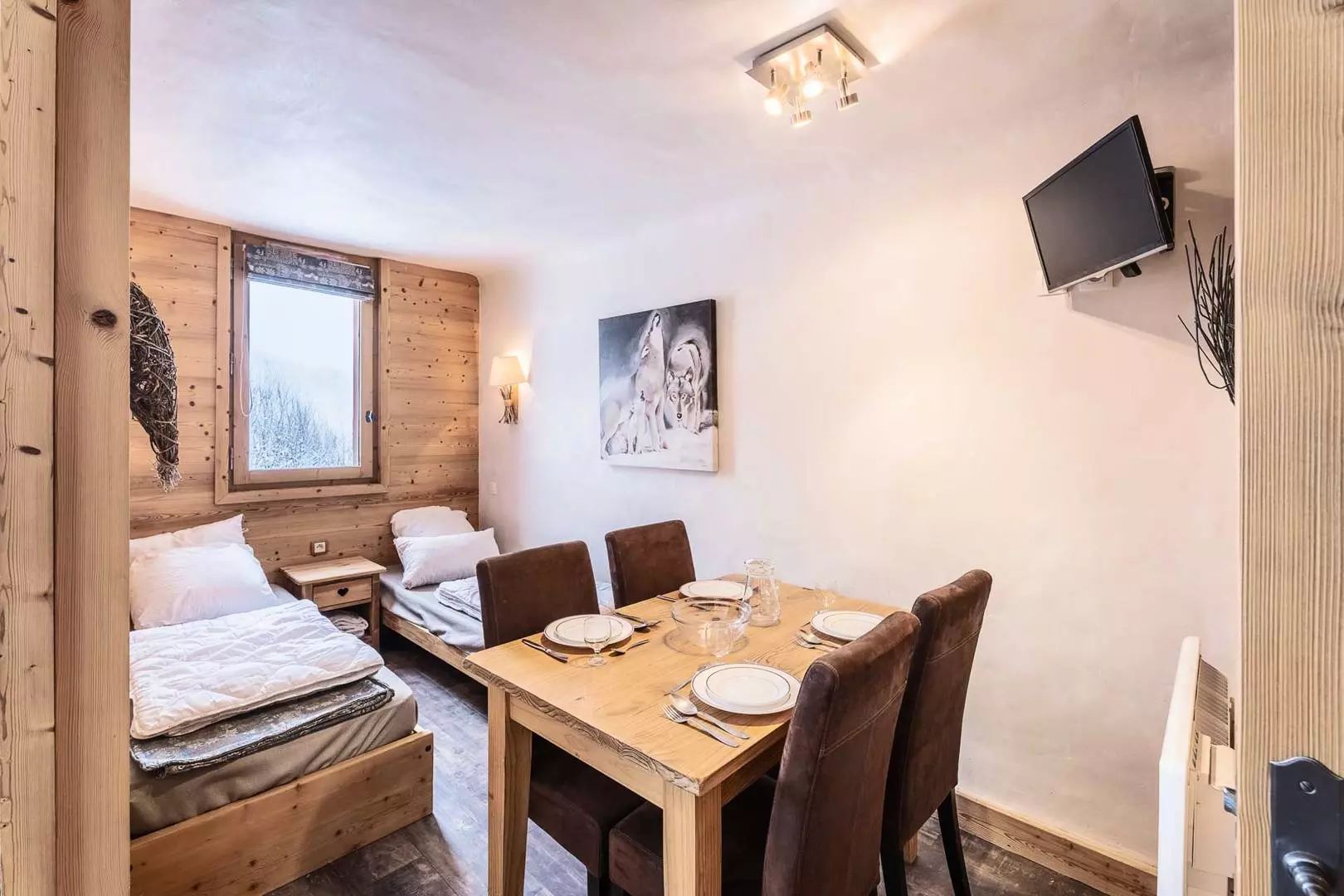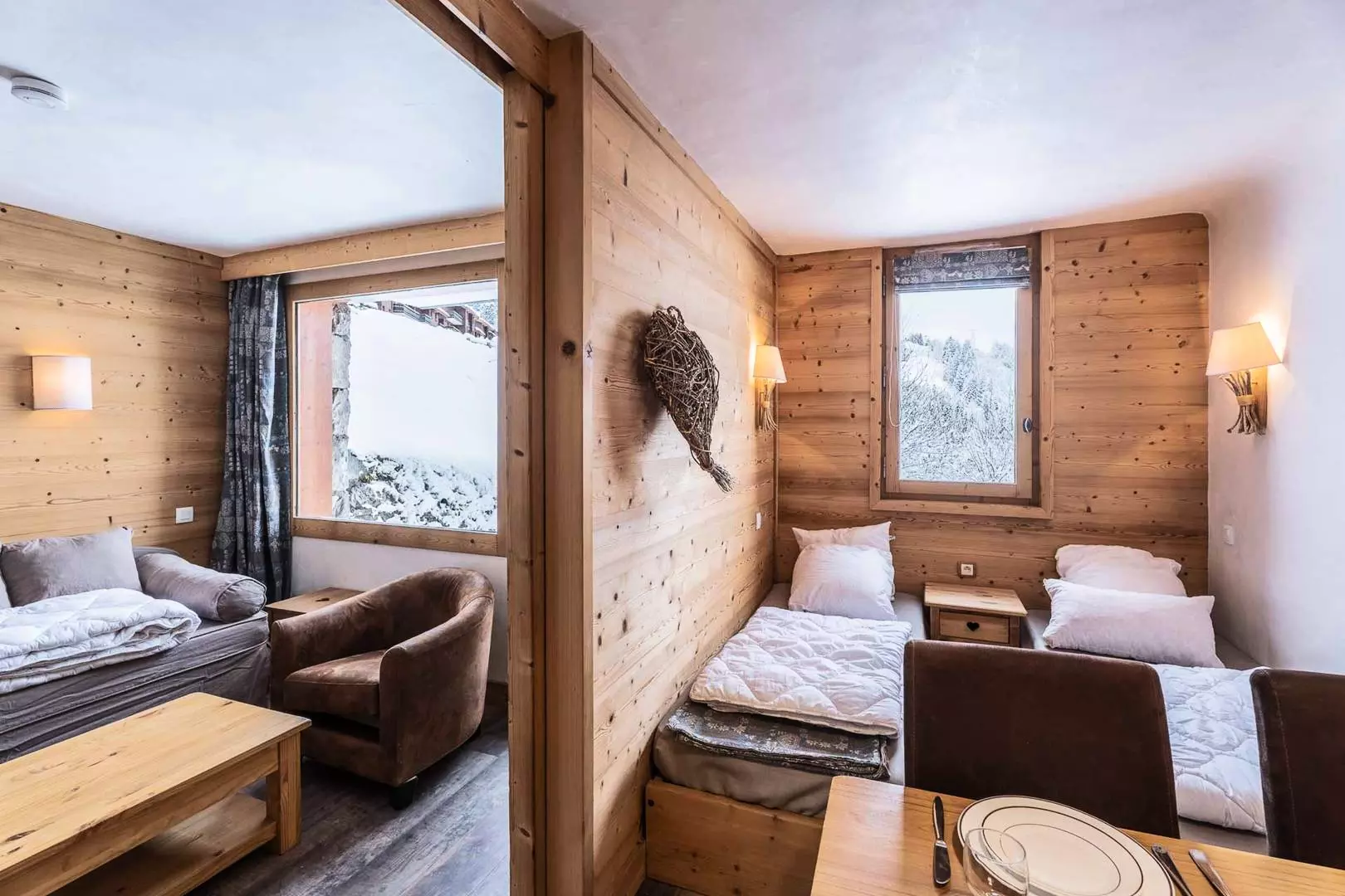 Studio of 28 m2 divisible including a single sofa bed, a trundle bed (80x190) in the dining area and 2 single beds (80x190) in the sleeping area. Television. Kitchen equipped with ceramic hob, dishwasher, microwave, refrigerator, kettle, toaster, coffee maker. Bathroom, separate WC. Terrace. Ski locker in the residence. Elevator. Floor -1. Non-smoking apartment. Pet supplement: €40.