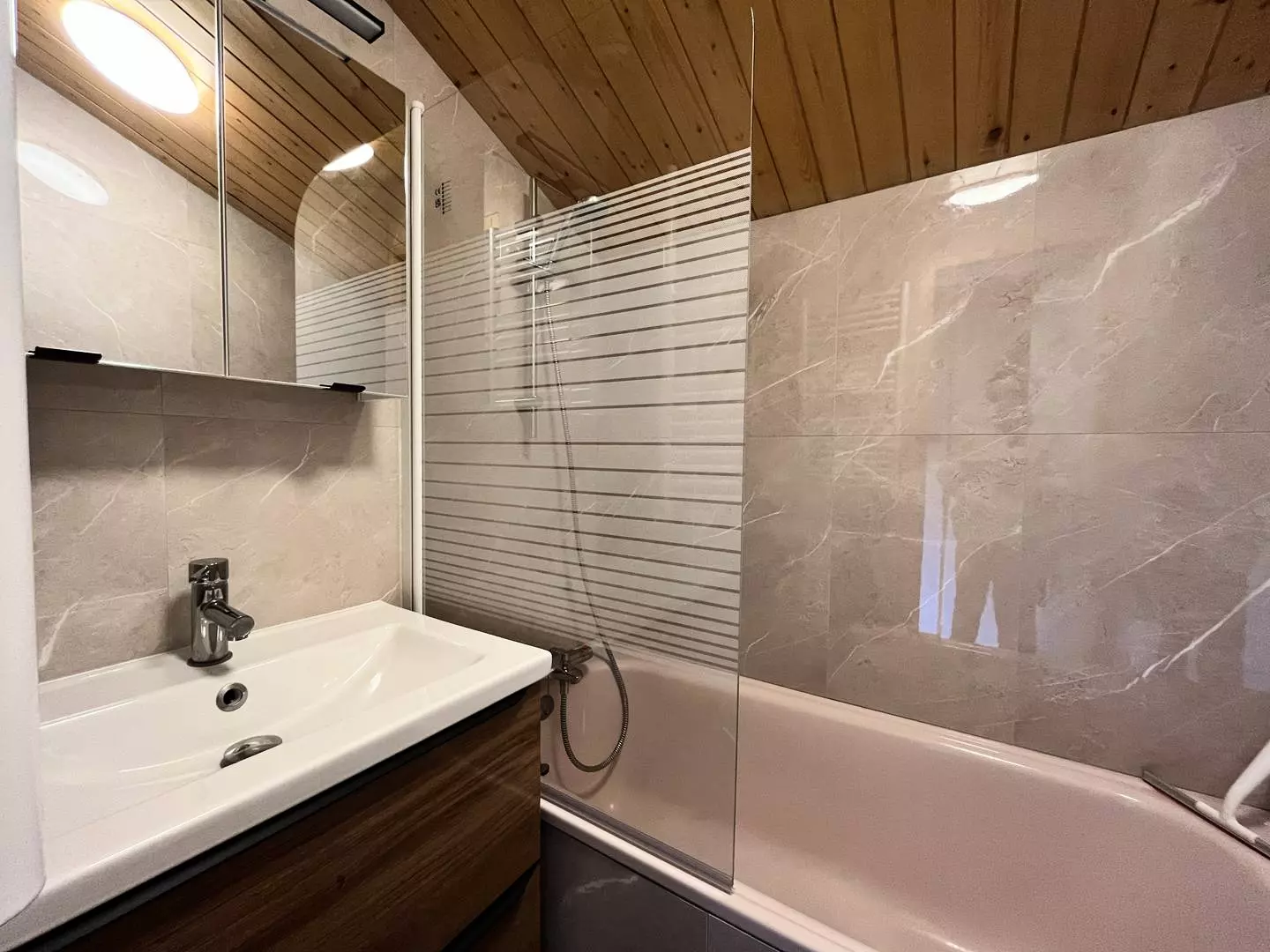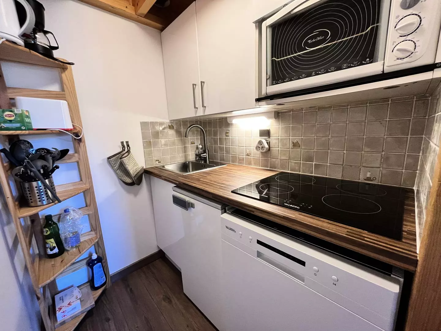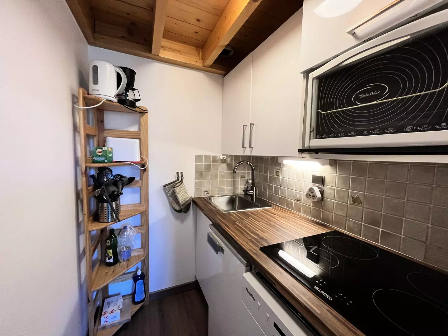 The living room opens onto a balcony with panoramic views from Méribel to the Aiguille du Fruit, with the Saulire directly opposite. The kitchenette is equipped with a dishwasher, electric hobs (x4), an oven, a kettle, and a coffee maker. A bathroom with a bathtub and a separate toilet. The apartment's fireplace is not available for use. A ski locker is available in the building.