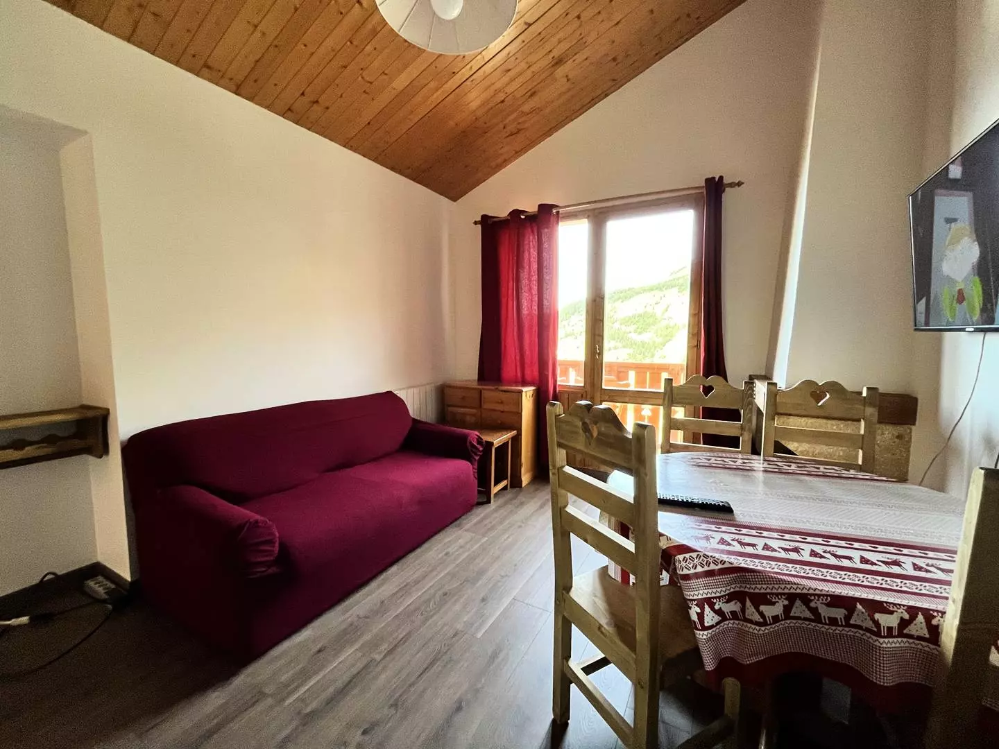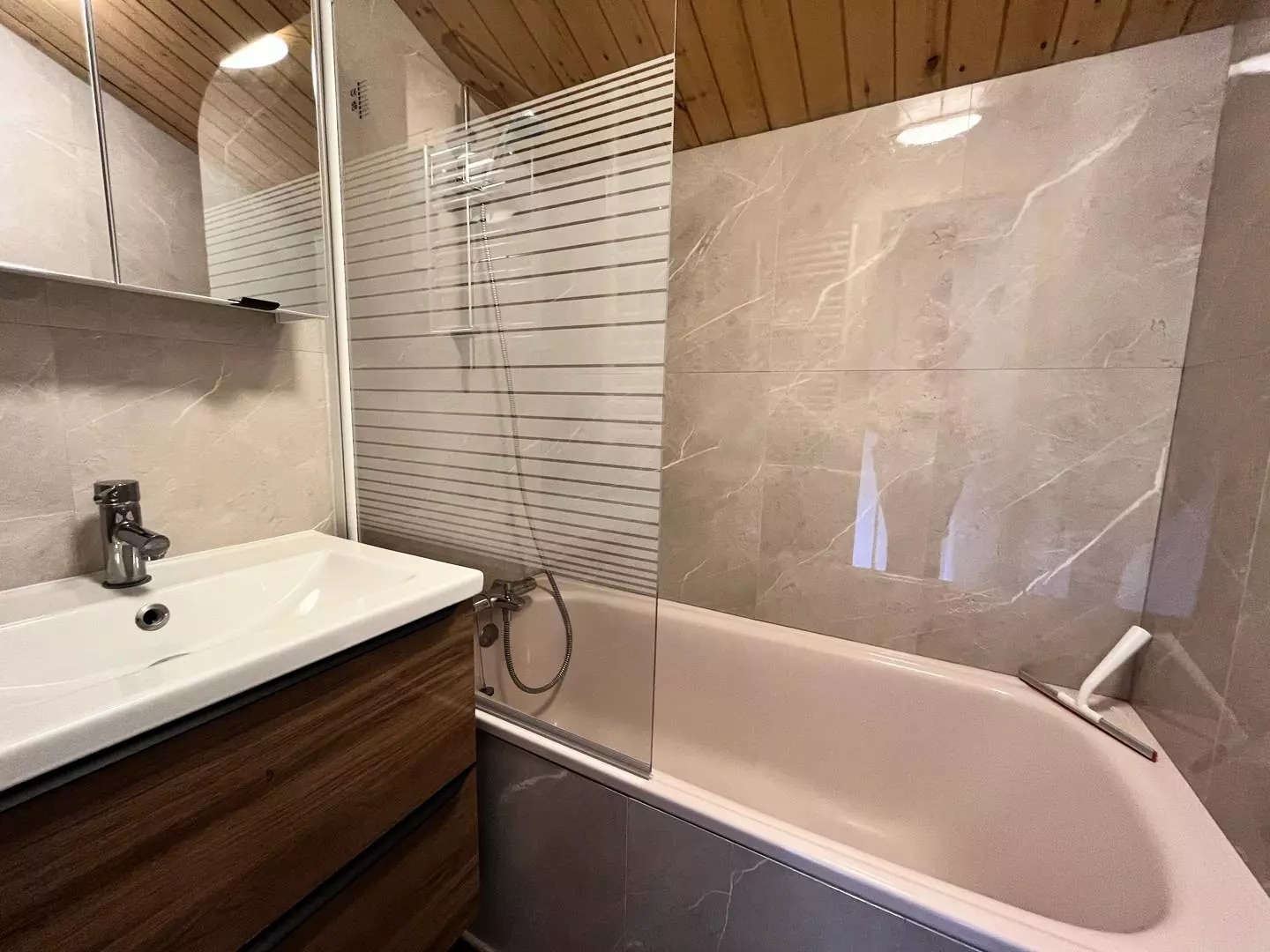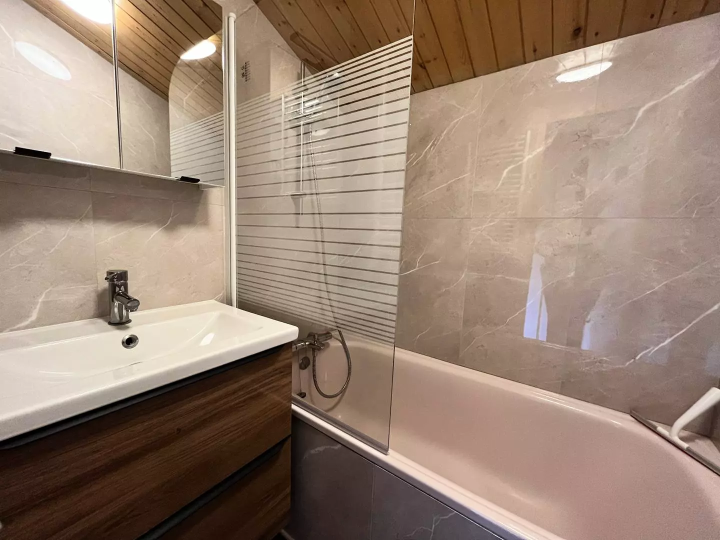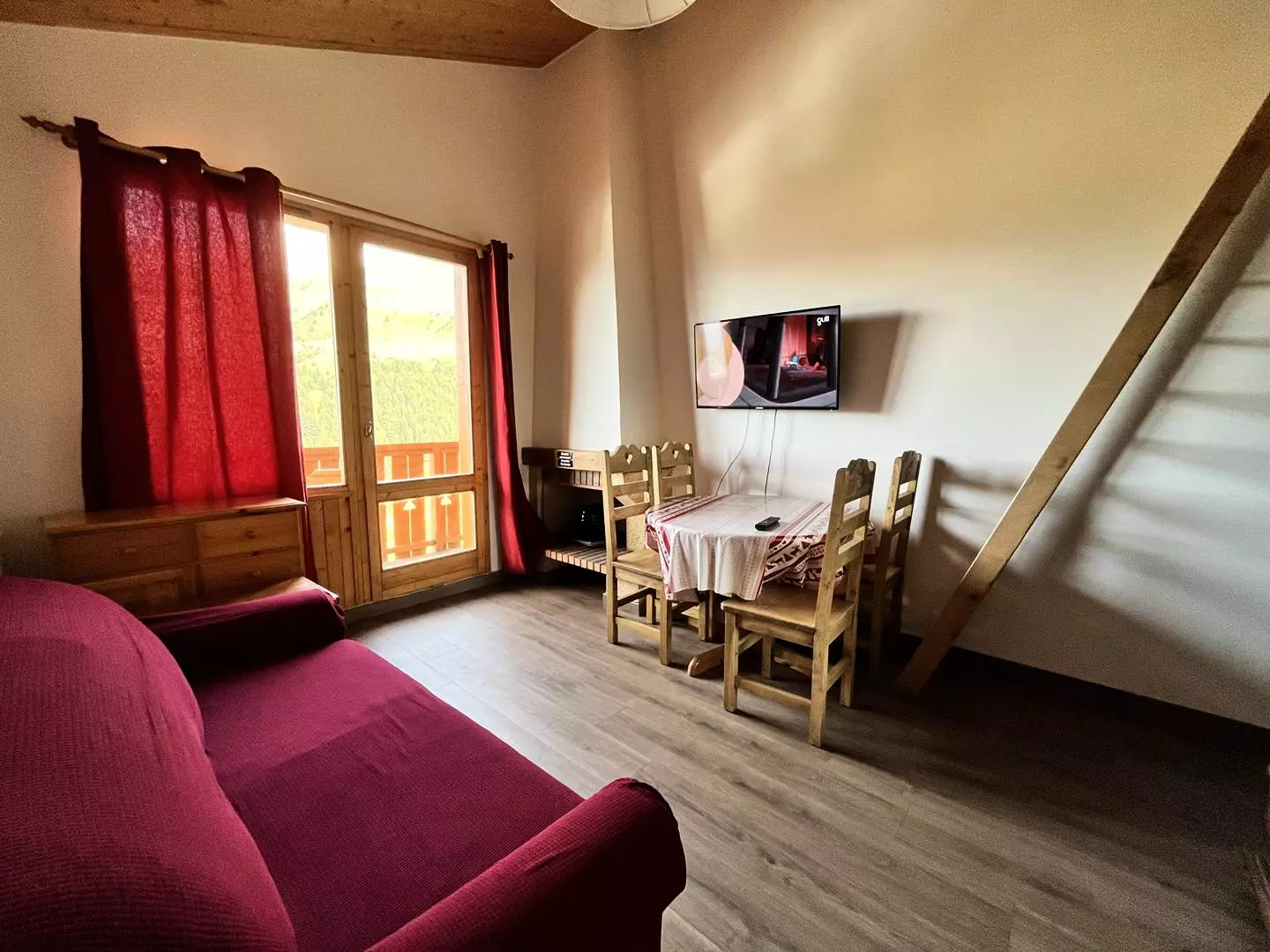 The living room opens onto a balcony with panoramic views from Méribel to the Aiguille du Fruit, with the Saulire directly opposite. The kitchenette is equipped with a dishwasher, electric hobs (x4), an oven, a kettle, and a coffee maker. A bathroom with a bathtub and a separate toilet. The apartment's fireplace is not available for use. A ski locker is available in the building.