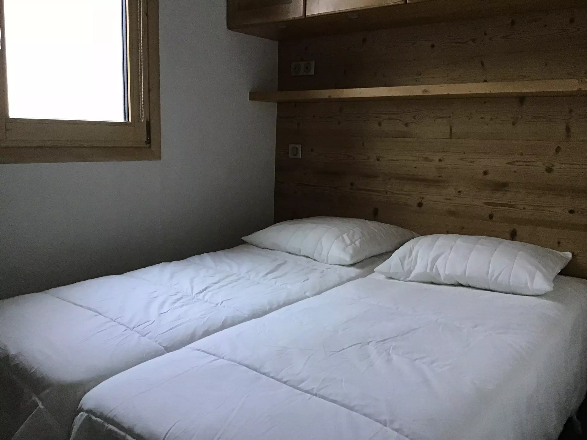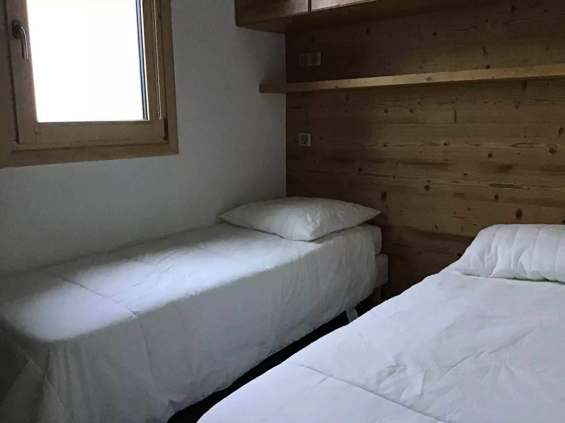 Rented for 4-5 people, it is composed of an entrance with a single folding bed, a bedroom with 2 single beds, a shower room with washing machine and separate WC, a kitchen area opening onto a living room with a sofa bed.