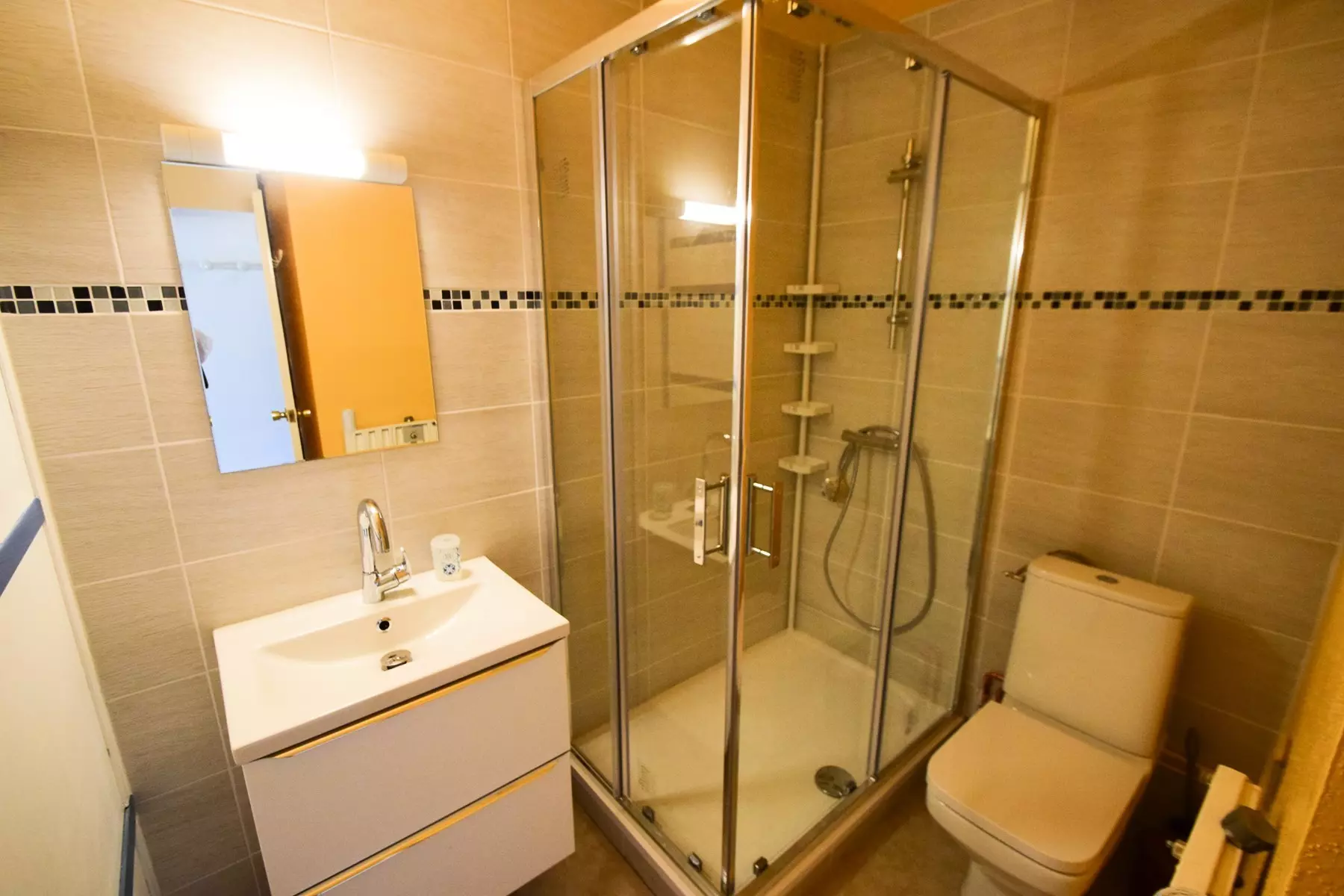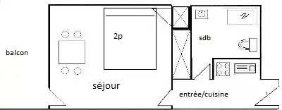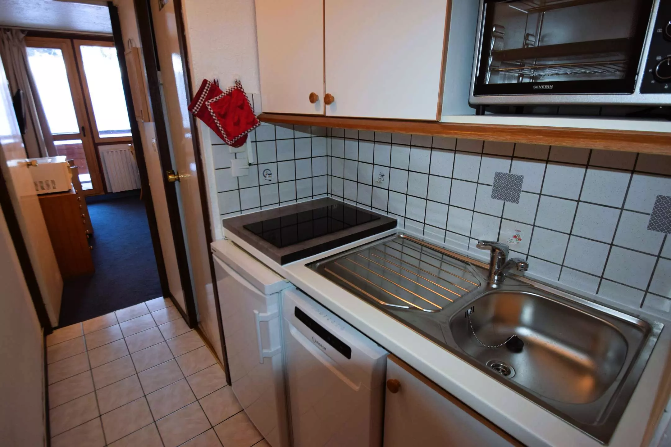 Studio for 2 people, 19m2, south-facing with balcony, view of the slopes, on the 1st floor with elevator, Kitchen: in entrance/corridor: 2 electric hotplates, dishwasher, mini-oven, microwave, refrigerator, Living room: dining area, 1 double bed (140x190cm) TV. Bathroom: shower, WC included. Floors: carpet, except entrance/bathroom-WC tiled - Bedding: 2-person duvet.