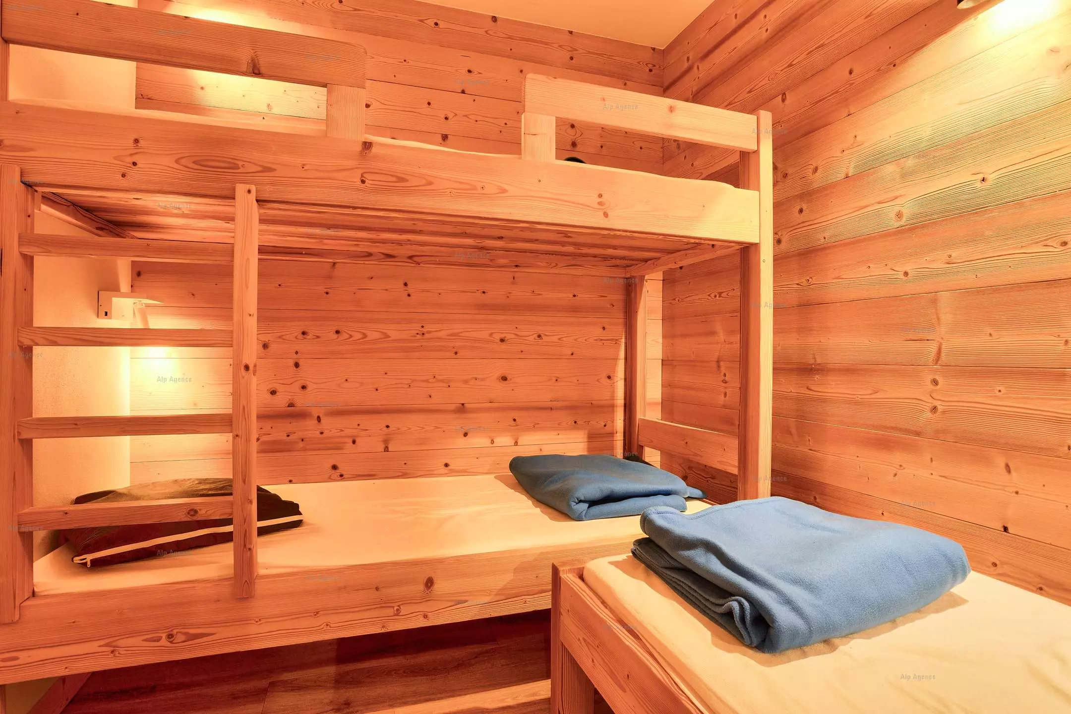 Duplex apartment for 9 people, approximately 63m², south-facing living room with balcony/terrace overlooking the slopes - 1st floor with elevator - Level 1: kitchen: 4 ceramic hobs, fridge/freezer, traditional oven, microwave, dishwasher - filter coffee maker - Living room: dining area, 1 corner sofa (2 single beds 90cm), TV. Bathroom with shower and separate toilet - Upstairs level 2: Bedroom 1 (left): 2 single beds, TV - Bedroom 2: 1 double bed 140cm window overlooking the living room, TV - Bedroom 3/ Cabin (without window): 2 bunk beds 80cm and 1 single bed 80cm - Bathroom: bathtub WC included - washing machine - Bedding: blankets including 1 double. Floor: plastic - Ski locker no. 132 on the ground floor, UCPA side. Comfortable apartment with a beautiful view of the slopes - NO PETS ALLOWED and NON-SMOKING APPT - End-of-stay cleaning, sheets, towels and ski passes are optional - Residence located at the foot of the slopes, connected to the shops by gallery.