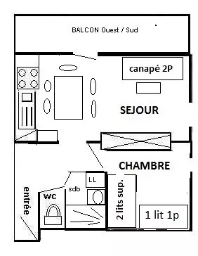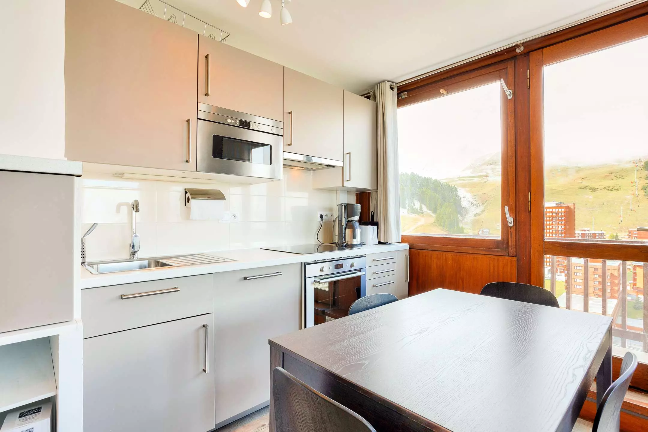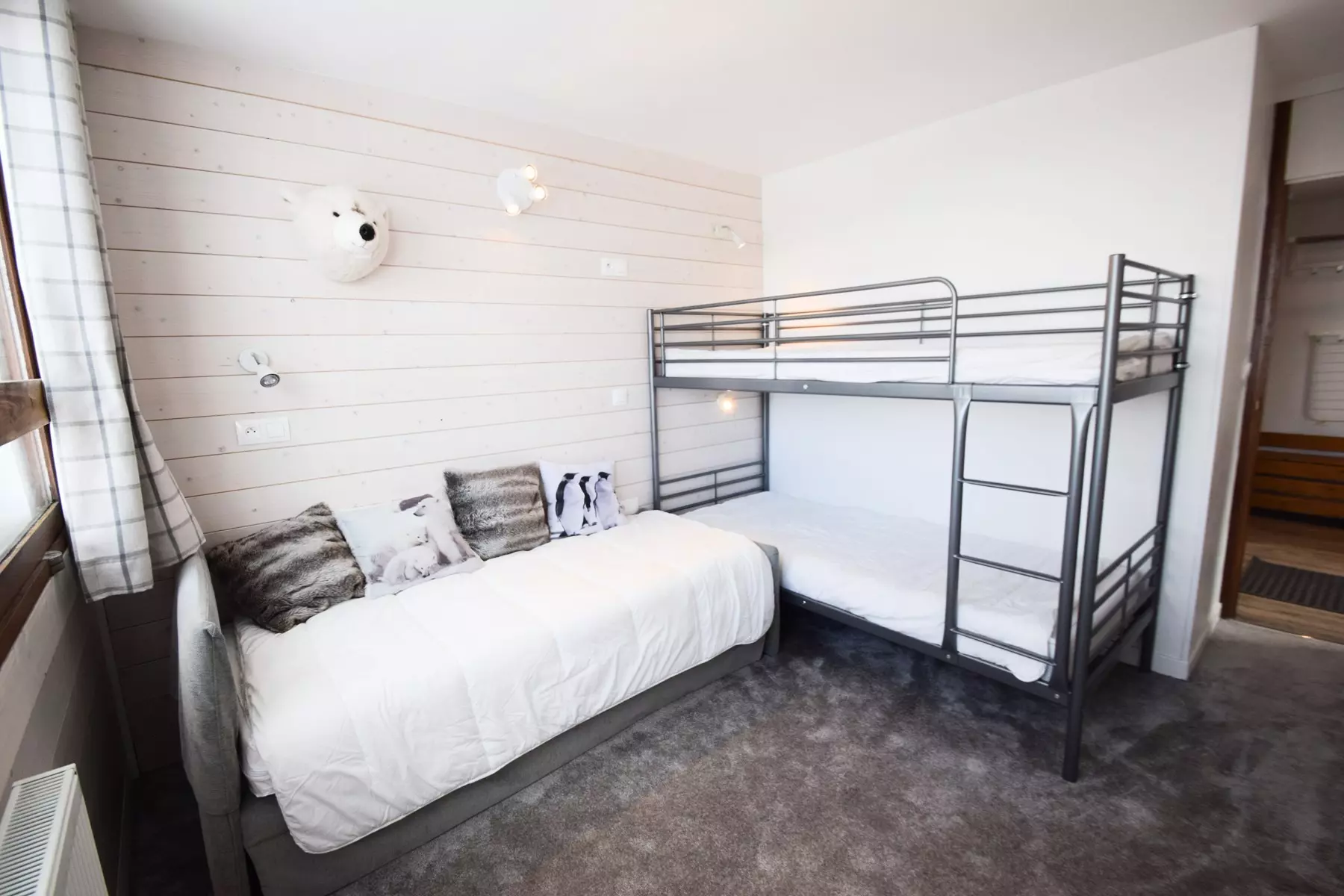 2-room apartment for 5 people, 42m2, West and North facing, magnificent view of the valley, Mont Blanc, the mountain and the resort, with balcony, on the 15th floor - with elevator - Kitchen: 4 ceramic hobs, multi-function oven, refrigerator, dishwasher. Living room: dining area, lounge area with 1 double sofa bed (160x200cm), TV - Bedroom: 2 bunk beds (90x200cm) + 1 single bed (90x190cm) - Bathroom: shower - Washing machine - Separate WC - Bedding: duvets - Floor: PVC slats everywhere except in bedroom: carpet - WIFI included - Fully renovated apartment, very bright, exceptional view. End of stay cleaning, sheets and towels and ski passes optional. PETS NOT ALLOWED Ski locker n°151 RP level.