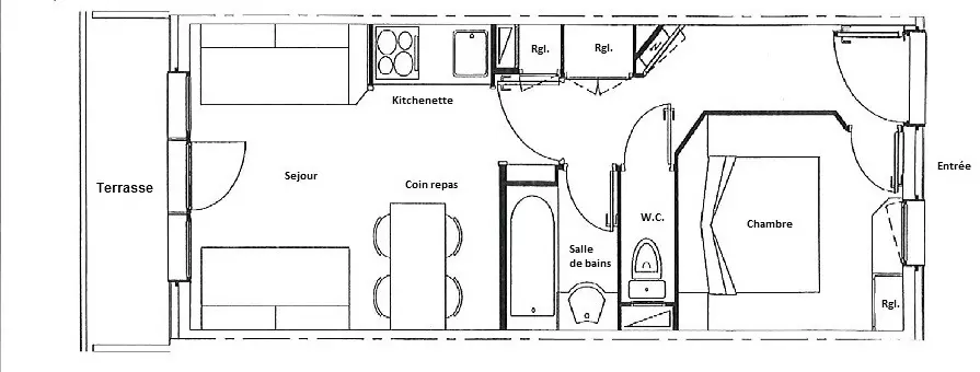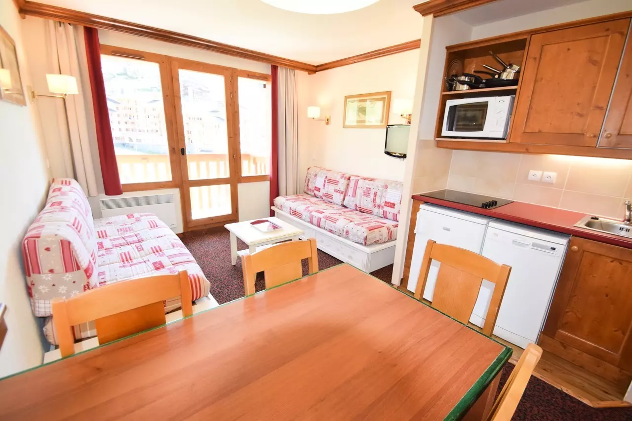 2-room apartment for 4/5 people, approx. 30m2, south-facing with balcony, 6th floor with elevator, beautiful view of the slopes and mountains - kitchenette at the entrance to the living room: 4 electric hotplates, refrigerator, microwave, dishwasher, filter coffee maker and Nespresso - Living room: dining area, 2 pull-out beds + 1 single sofa bed. TV - Bedroom: 1 double bed 160cm - Bathroom: bathtub - Separate WC - Floors: carpet except bathroom/WC: plastic - Bedding: duvets - End-of-stay cleaning, sheets, towels and ski passes are optional. Ski locker No. B609 at the slopes exit level - PETS NOT ALLOWED. Apartment located in the heart of the ski area -