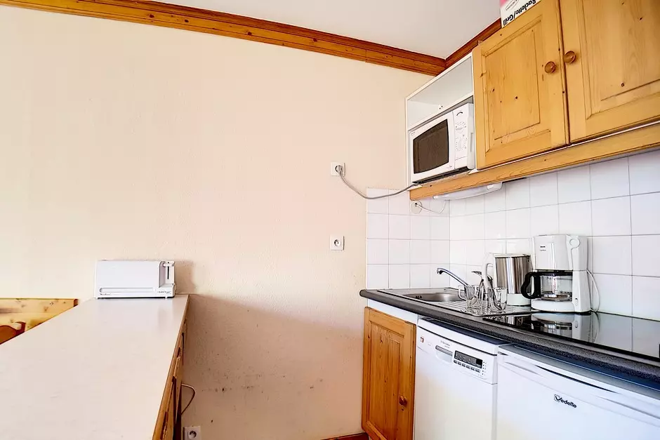 Kitchen equipped with 4 ceramic hobs, dishwasher, refrigerator, microwave, kettle, coffee maker and toaster.