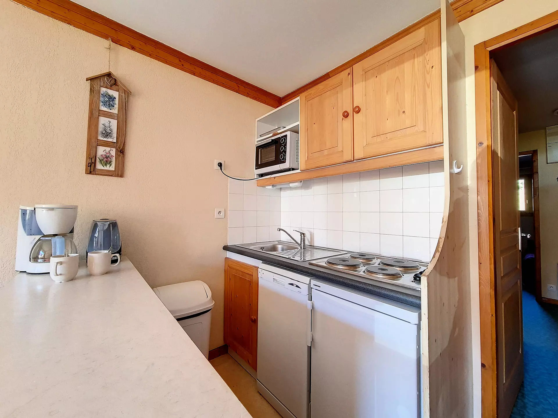 Kitchen equipped with 4 electric hotplates, dishwasher, refrigerator, oven, kettle, coffee maker and toaster.