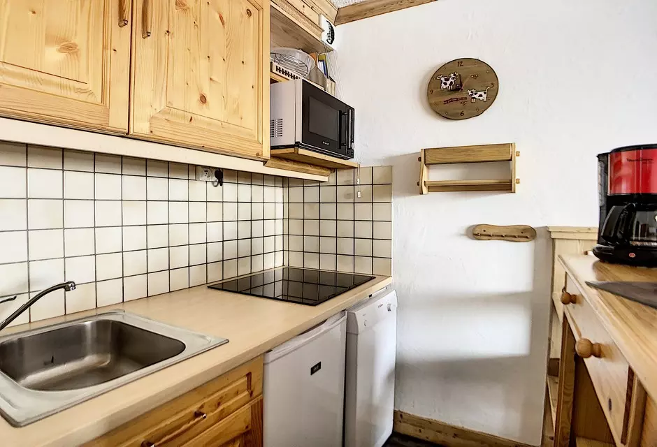 Built-in kitchen with 4 induction hobs, refrigerator, dishwasher, raclette machine, fondue, pierrade, combination oven/microwave, kettle, toaster, coffee maker and Nespresso coffee machine.