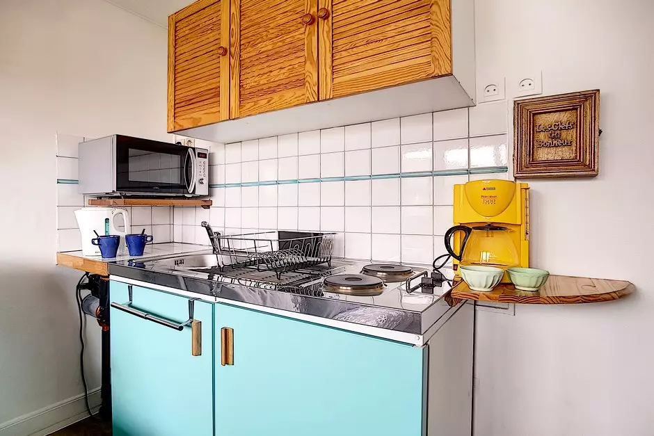 Fully equipped kitchen: refrigerator, 2 electric hotplates, combination microwave oven, coffee maker + electric kettle.