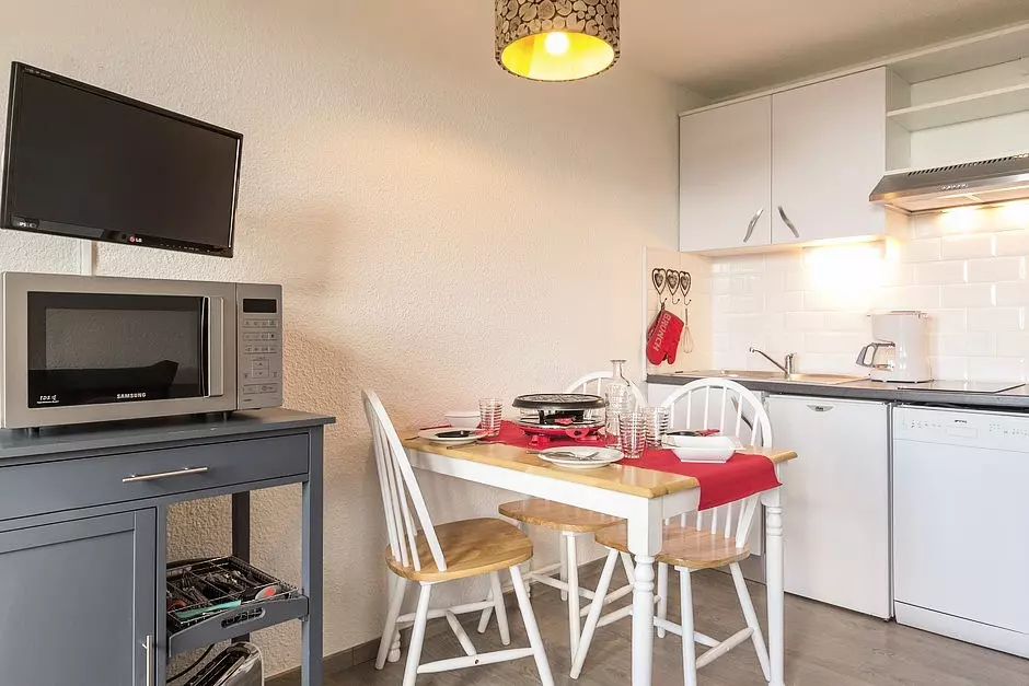 Kitchen equipped with 2 electric hobs, mini-oven, refrigerator, dishwasher, coffee maker, toaster and kettle, raclette machine.