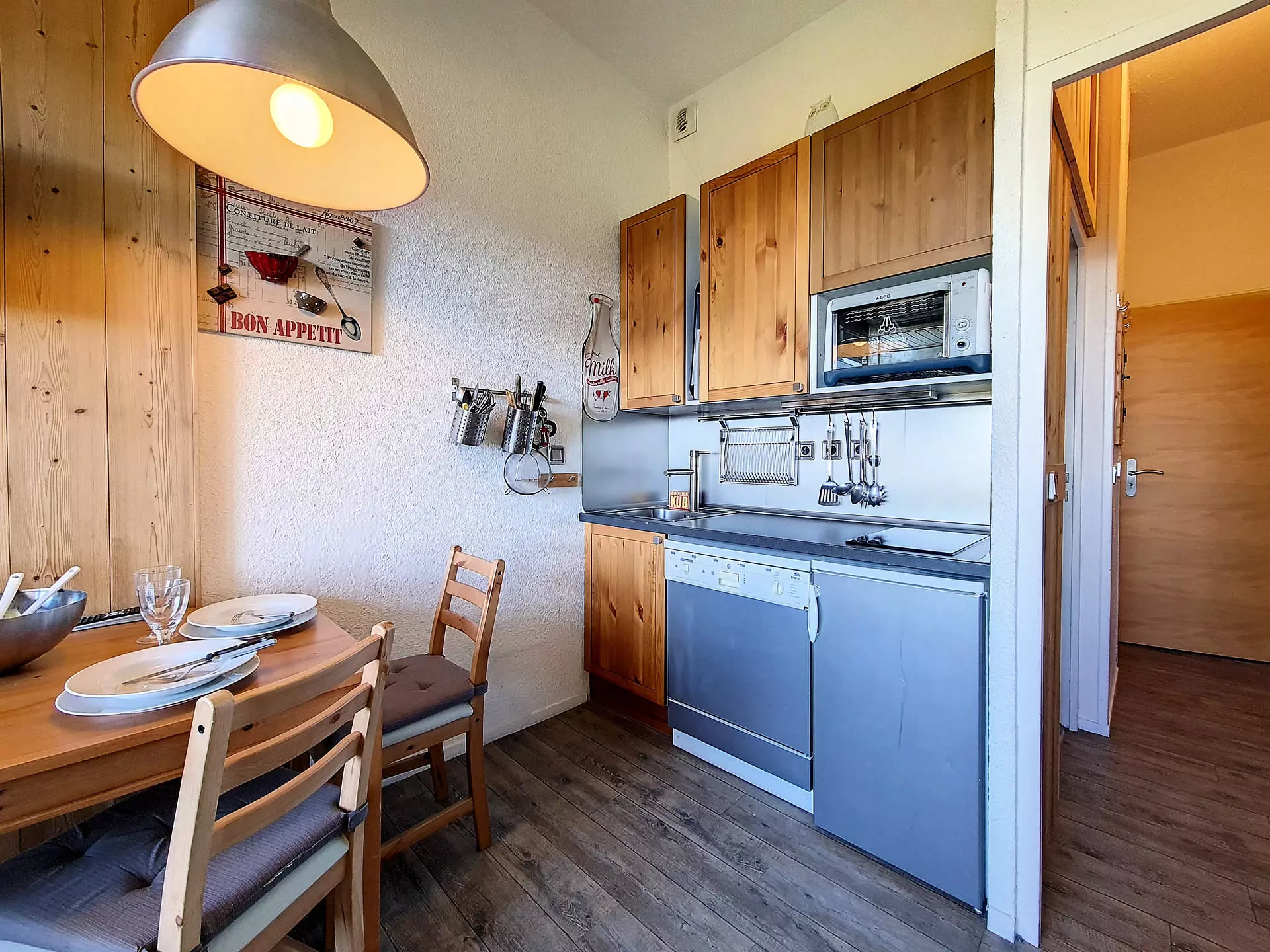 Kitchen equipped with 2 electric hobs, mini-oven, refrigerator, dishwasher, coffee maker, toaster and kettle.