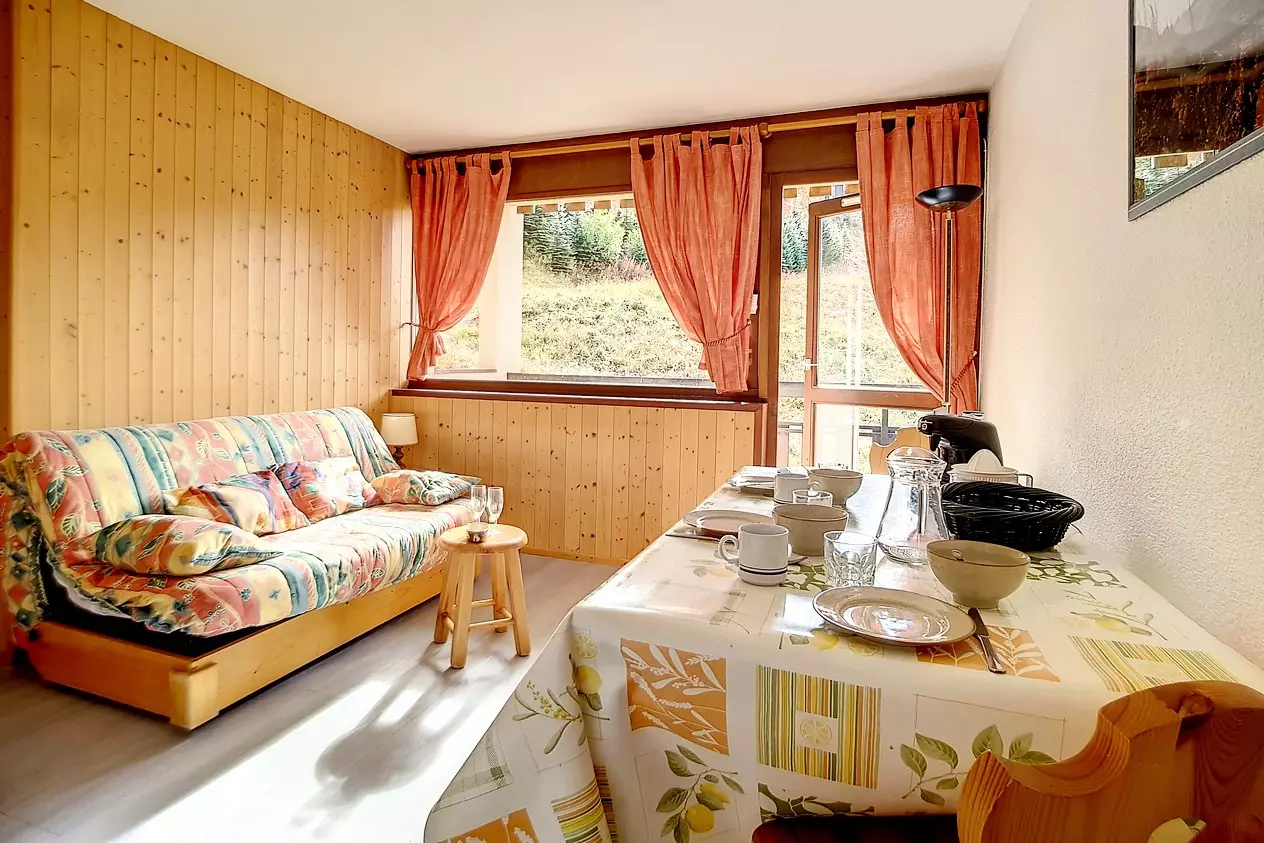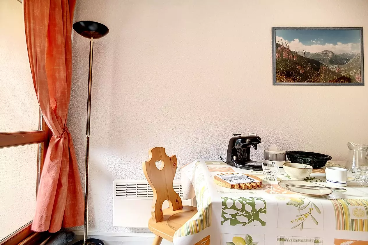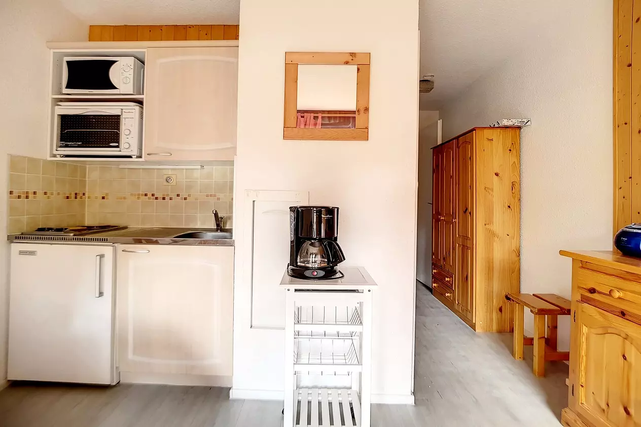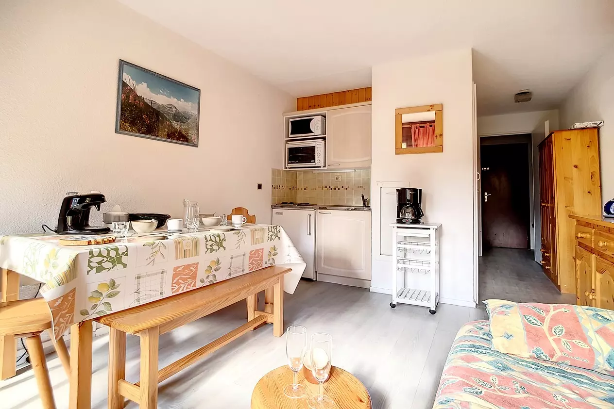 Partially renovated 24m² studio cabin for 4 people. This very pleasant and bright apartment has a south-facing balcony offering unobstructed views of the ski slopes. It is located on level 2 of the building and has electric shutters.