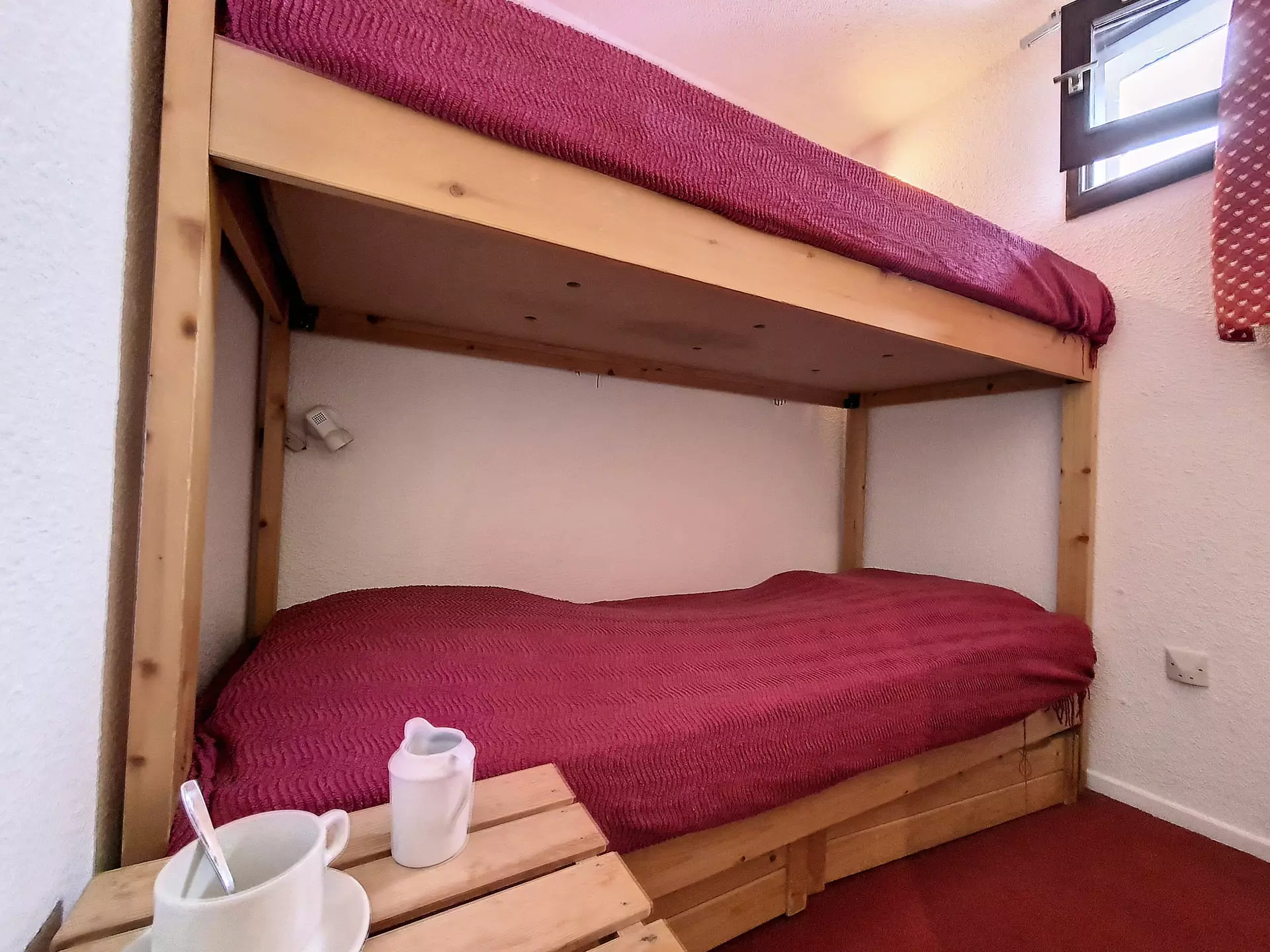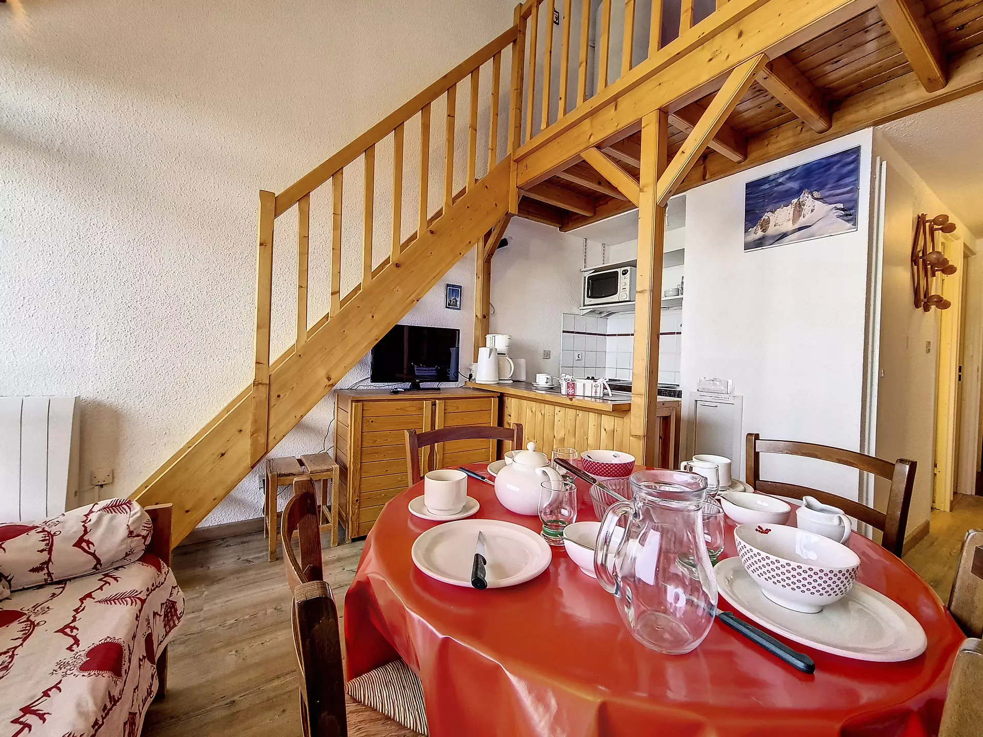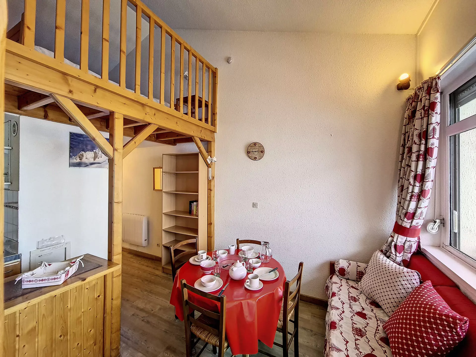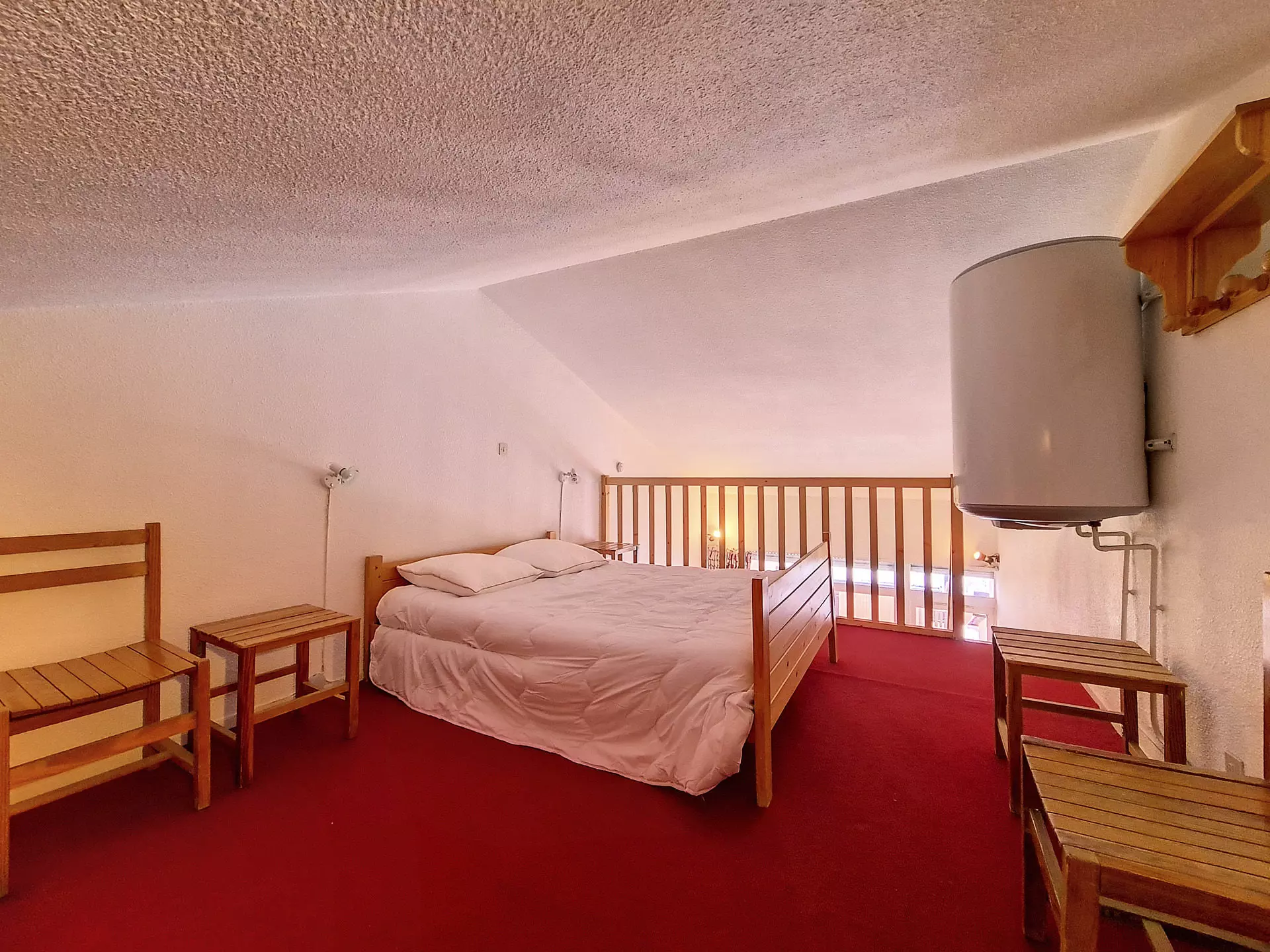 This 30m² mezzanine apartment sleeps 4 and is located on the floor of the building, with a balcony. It also includes a private outdoor parking space.