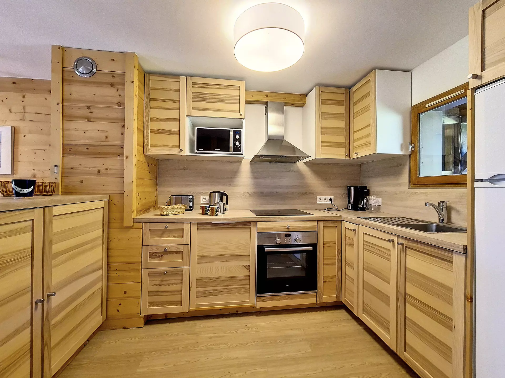 Kitchen with 4 hotplates, refrigerator, oven, dishwasher, kettle, toaster, electric coffee maker