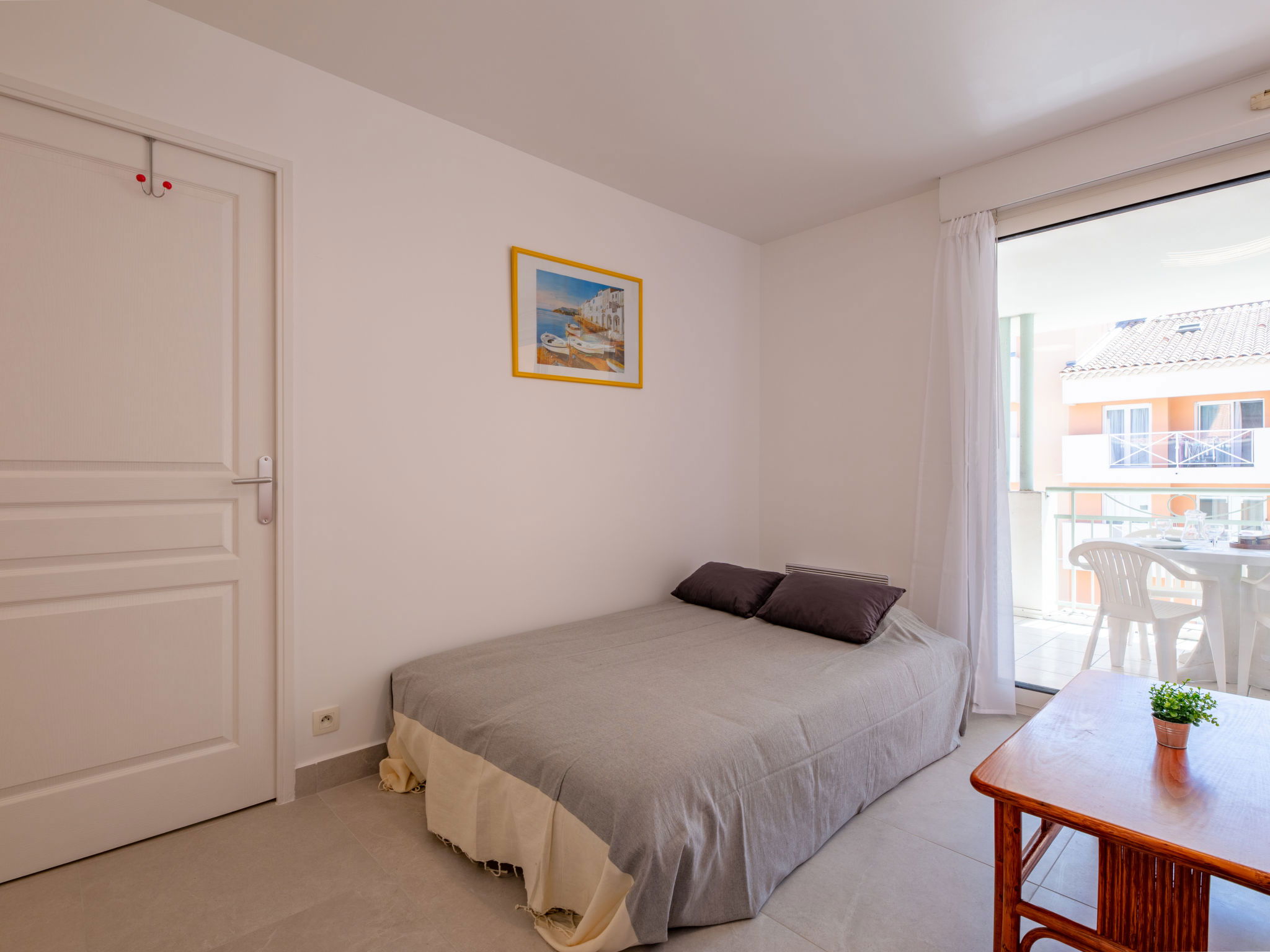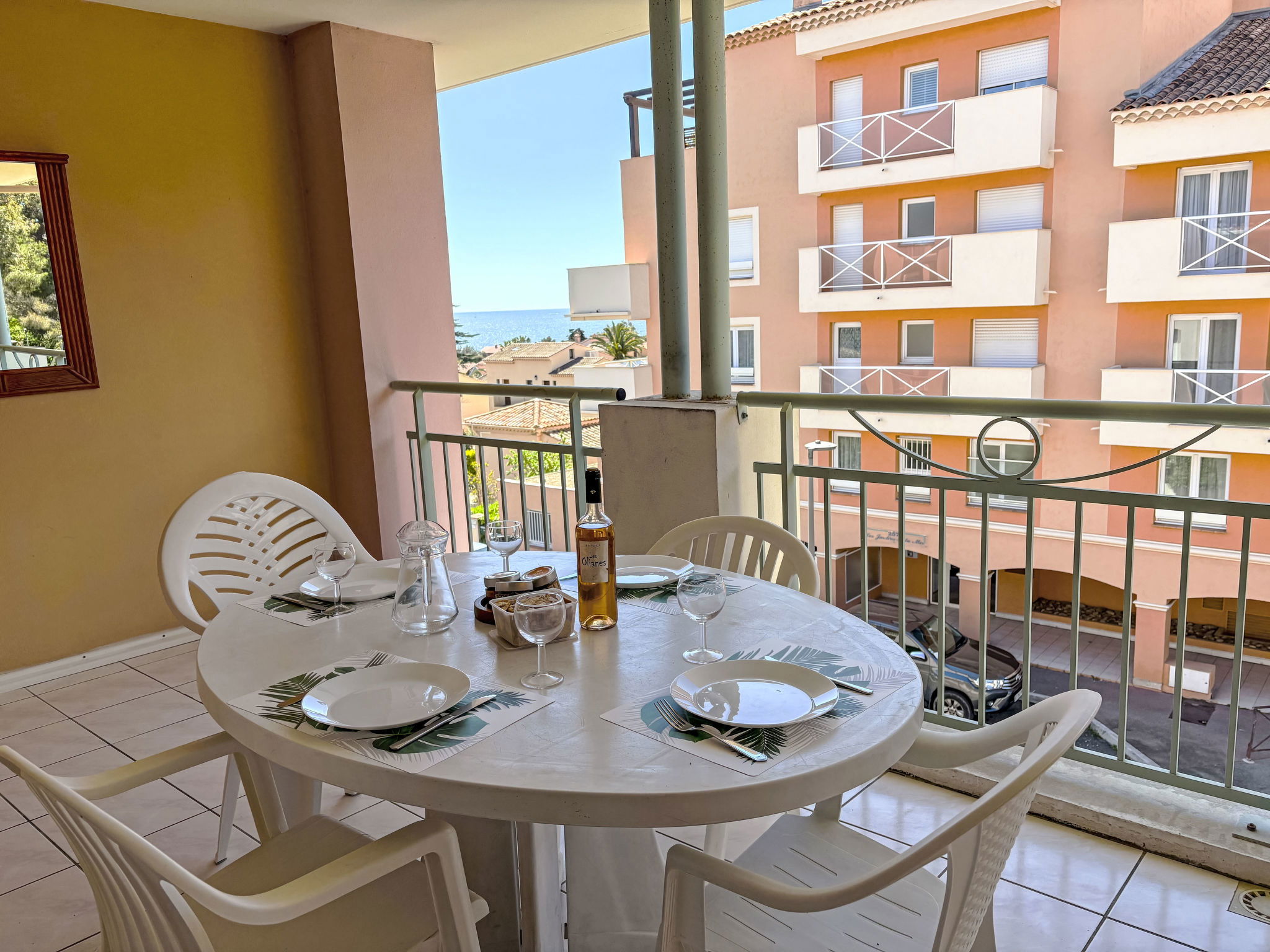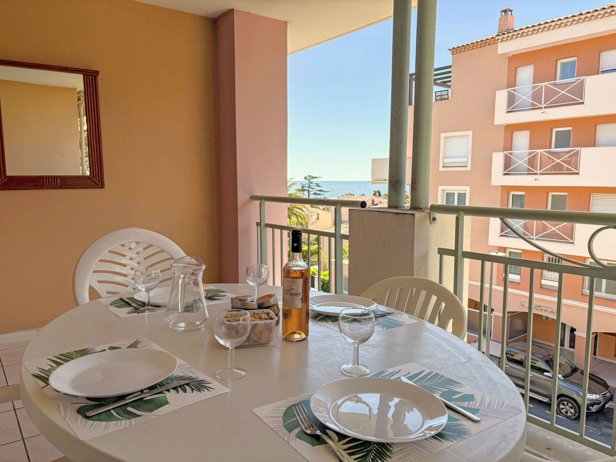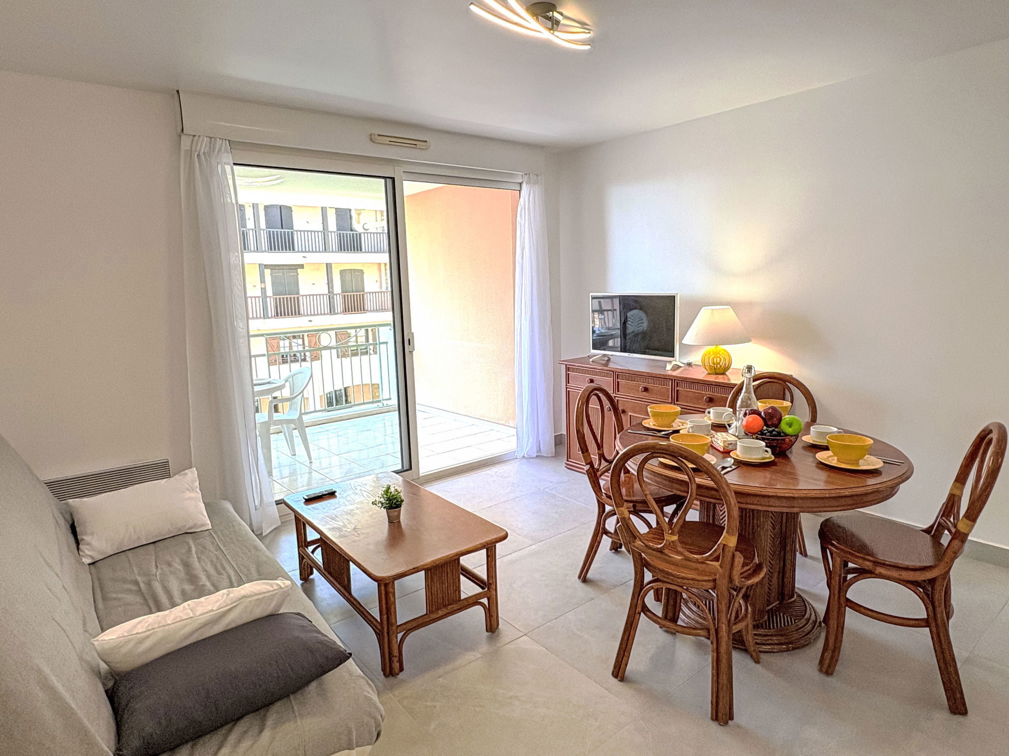 2-room apartment 28 m2 on 2nd floor. Renovated in 2025, beautiful furnishings: living/dining room with panoramic window with 1 double sofabed (1 x 135 cm, length 185 cm), TV (flat screen), fan. Exit to the terrace. 1 room with 1 bed (160 cm, length 200 cm), fan. Exit to the terrace. Open kitchen (dishwasher, 3 ceramic glass hob hotplates, toaster, kettle, microwave, electric coffee machine). Bathroom, sep. WC. Heating. Terrace 20 m2 partly roofed. Terrace furniture. Side view of the sea. Facilities: washing machine, iron, hair dryer. Internet (WiFi, extra). Parking space n A27 (roofed, 1 car). Please note: smoke alarm. Offer by a private individual according to Art. 155, IV of CGI. CBQPGP