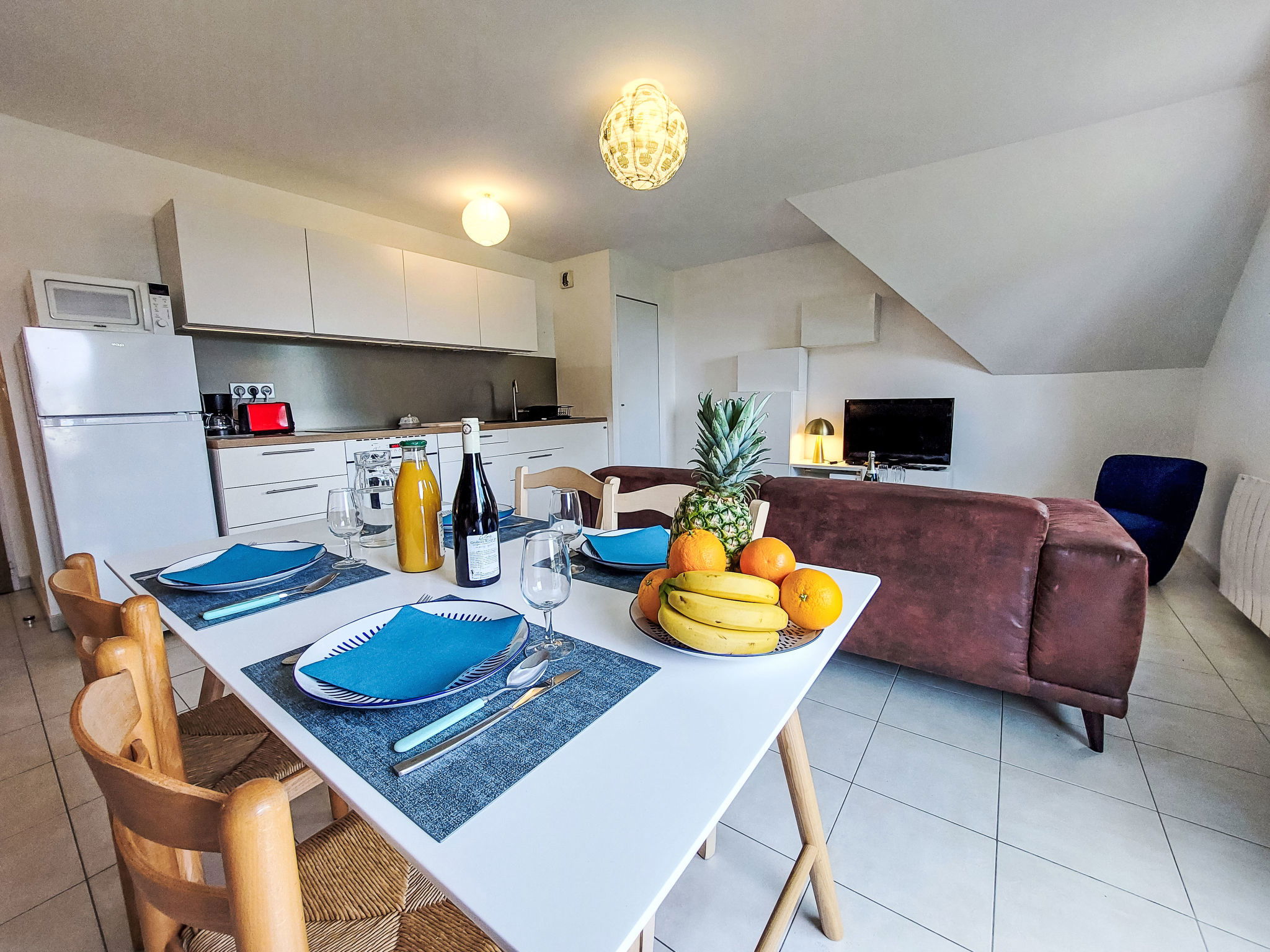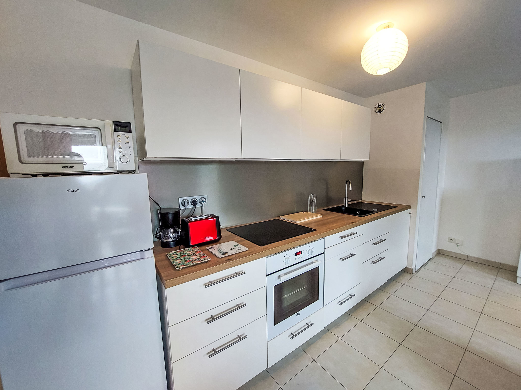 3-room apartment 51 m2 on 1st floor. Very beautiful furnishings: living room with TV (flat screen). Exit to the balcony. 1 room with sloping ceilings with 1 french bed (140 cm, length 190 cm). 1 room with sloping ceilings with 2 beds (90 cm, length 190 cm). Exit to the balcony. Open kitchen (oven, dishwasher, 3 ceramic glass hob hotplates, toaster, microwave, freezer, electric coffee machine). Bathroom, sep. WC. Electric heating. Balcony 8 m2. Balcony furniture. Facilities: washing machine, hair dryer. Internet (WiFi, free). Parking space n 34. Please note: non-smokers only. Smoke alarm. 562400009374M