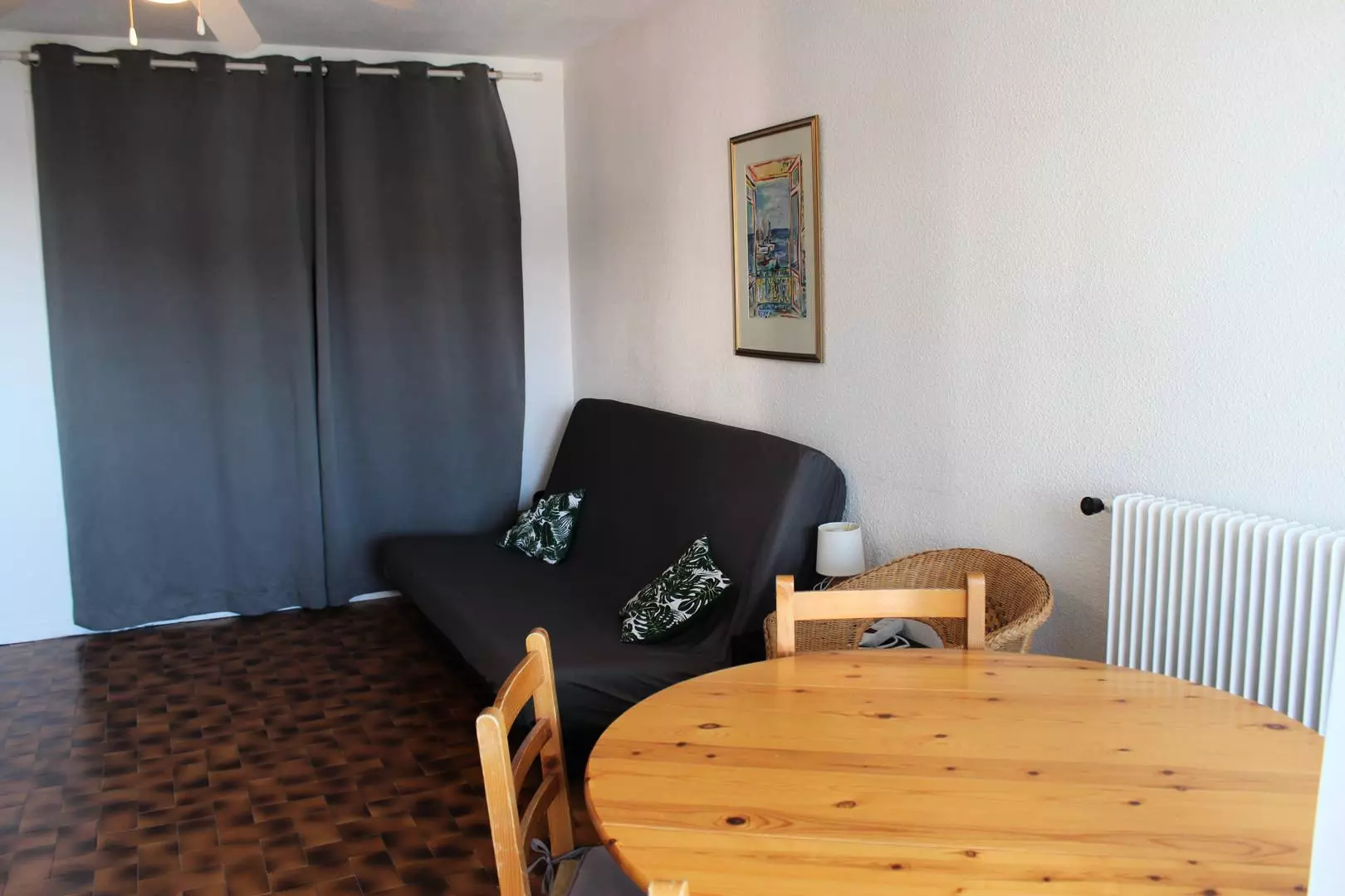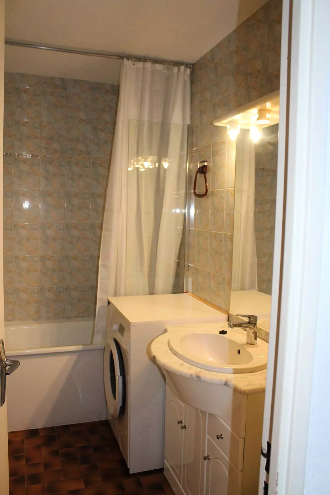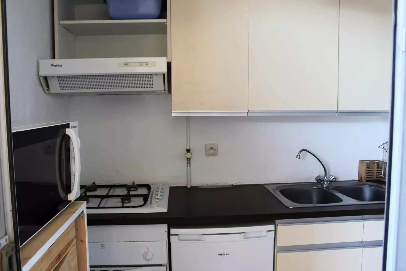 Entrance hall, bathroom (bathtub) with washing machine, WC, large main room with sofa bed + 90 cm bed, storage, TV, kitchen area semi-separate from the living room (equipped with a TOP fridge, a 4-burner gas hob, oven and microwave) opening onto the loggia/terrace.