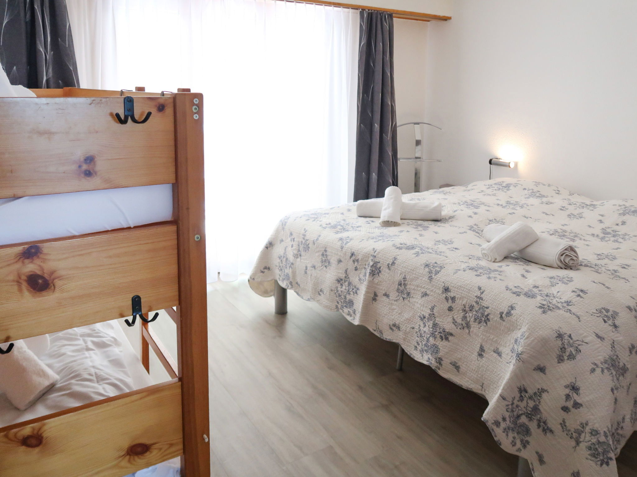 "Derborence 28", 2-room apartment 56 m2, on the ground floor. Object suitable for 2 adults + 2 children. Bright, renovated, practical and beautiful furnishings: living/dining room with cable TV. Exit to the balcony, north facing position. 1 room with 1 x 2 bunk beds (90 cm, length 190 cm), 1 double bed (2 x 90 cm, length 190 cm). Exit to the balcony, south facing position. Open kitchen (oven, dishwasher, 2 ceramic glass hob hotplates, microwave, electric coffee machine, Capsules for coffee machine (nespresso) extra, raclette grill, fondue Set (chinoise, cheese)). Bath/shower/WC. Balcony, north facing position balcony, south facing position. Balcony furniture. Beautiful panoramic view of the mountains. Facilities: hair dryer. Internet (WiFi, free). Parking space n 1 (roofed), height 190 cm. Please note: non-smokers only. Maximum 1 pet/ dog allowed.