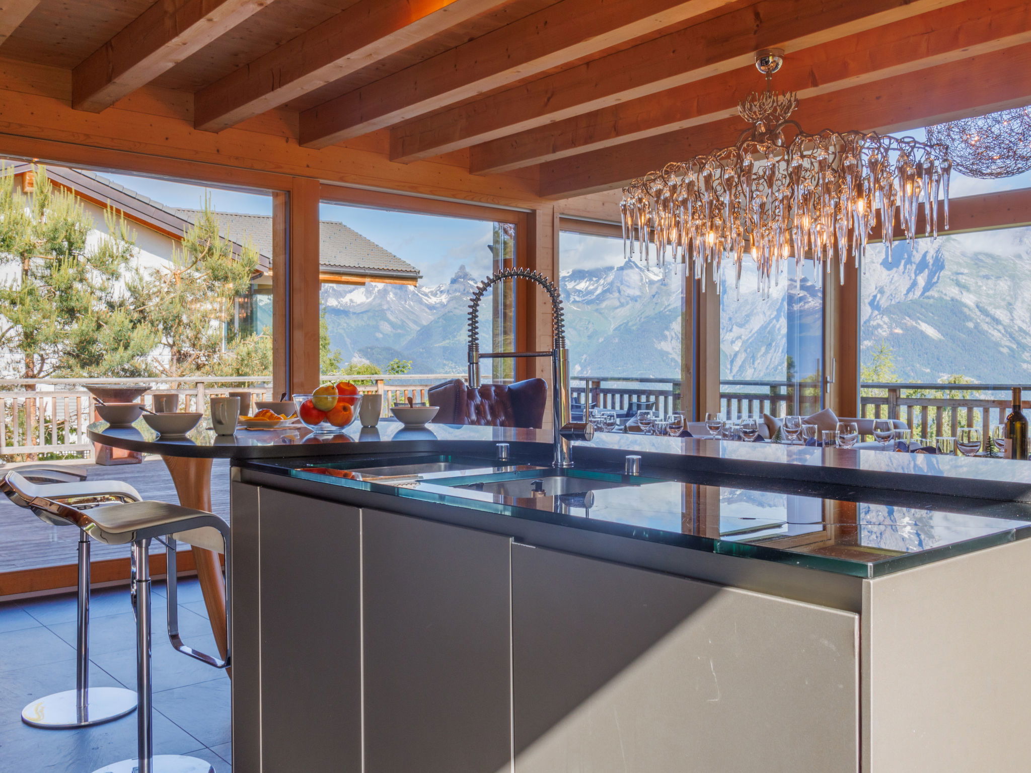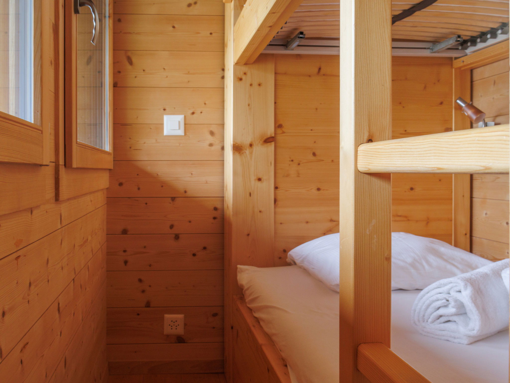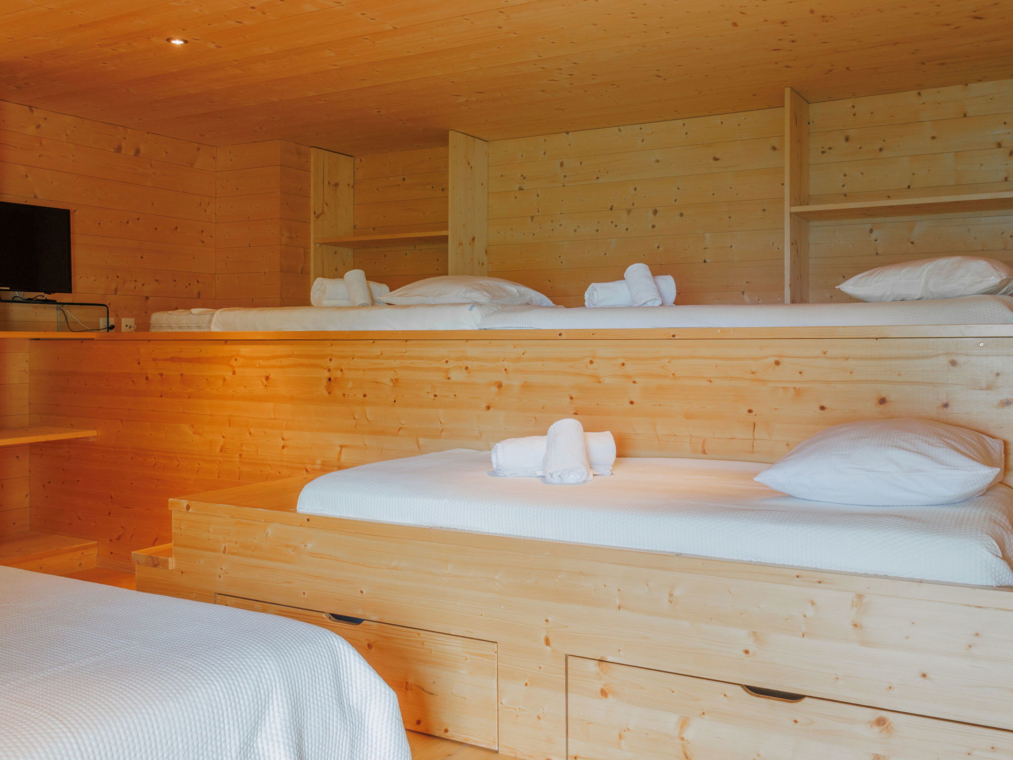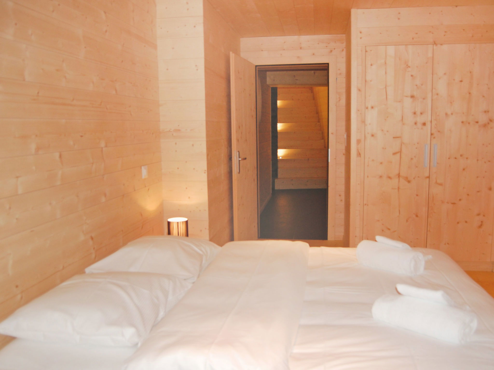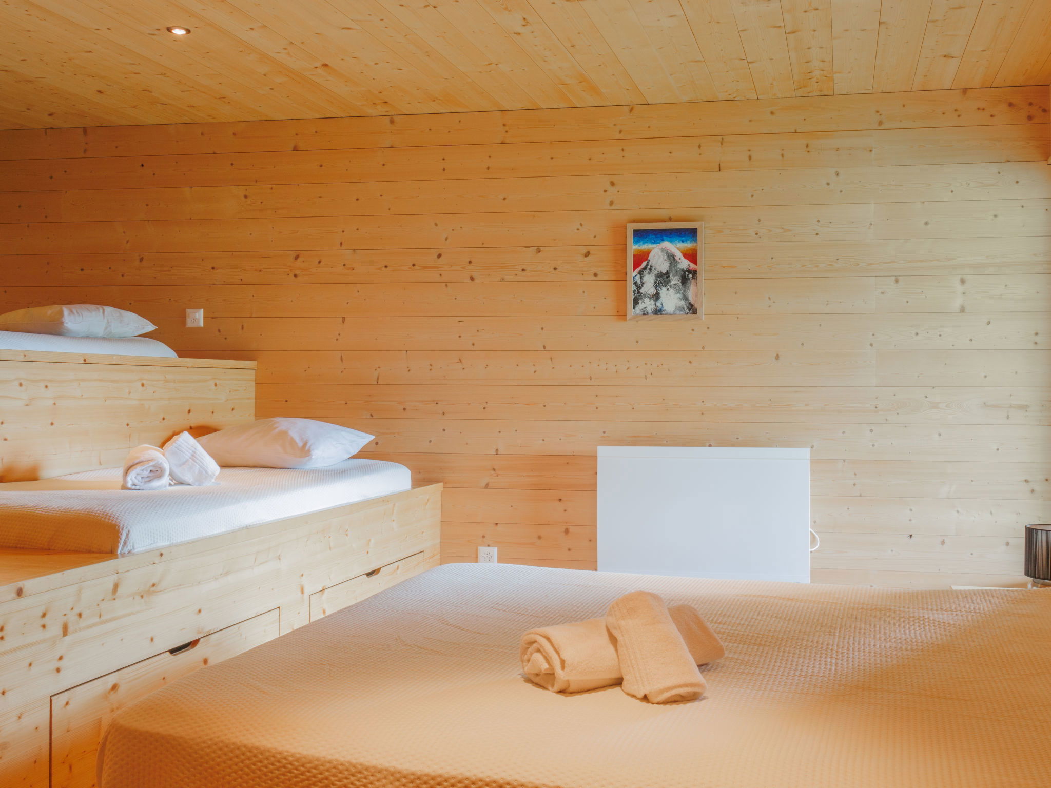 "Woovim 14", 6-room chalet 250 m2. Luxurious and wooden furniture furnishings: large living/dining room with panoramic window north facing position with Scandinavian wood stove, cable TV and DVD. Exit to the terrace. 1 large room with 1 french bed (180 cm, length 200 cm). Open kitchen (oven, dishwasher, 4 induction hot plates, toaster, kettle, microwave, electric coffee machine, Capsules for coffee machine (nespresso) extra, raclette grill, fondue Set (cheese)) with bar. Shower/WC. Heating. On the lower ground floor: 1 large room with 1 french bed (160 cm, length 200 cm), cable TV. 1 large room 28 m2 with 3 beds (80 cm, length 190 cm), 1 french bed (160 cm, length 200 cm), cable TV. Shower, sep. WC, bath/shower/WC, double hand-basin, Sauna. Upper floor: 1 room with 2 x 2 bunk beds (90 cm, length 190 cm), shower, double hand-basin and cable TV. 1 room with 1 french bed (160 cm, length 200 cm), shower and double hand-basin. Sep. WC. Terrace 80 m2, north facing position and west facing position. Terrace furniture. Very beautiful panoramic view of the mountains and the valley. Facilities: sauna, children's high chair, baby cot for up to 2 year olds, hair dryer. Internet (WiFi, free). Parking (3 cars), garage, height 200 cm, width 220 cm. Please note: non-smokers only.