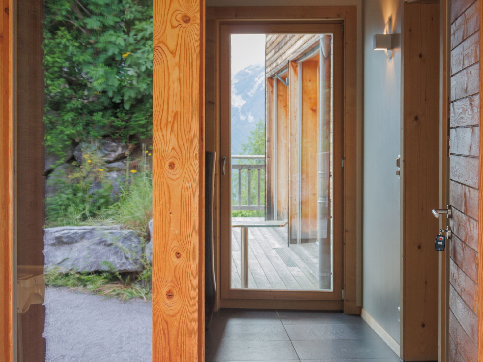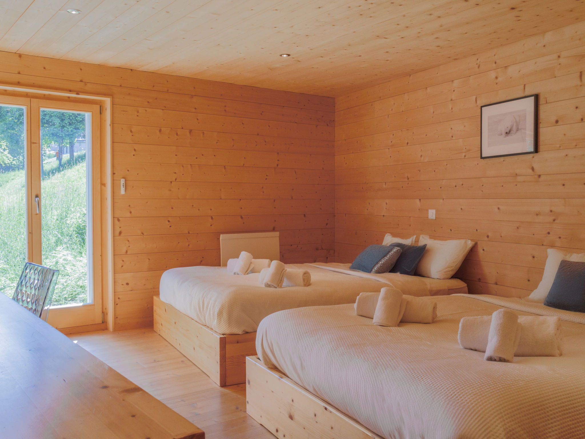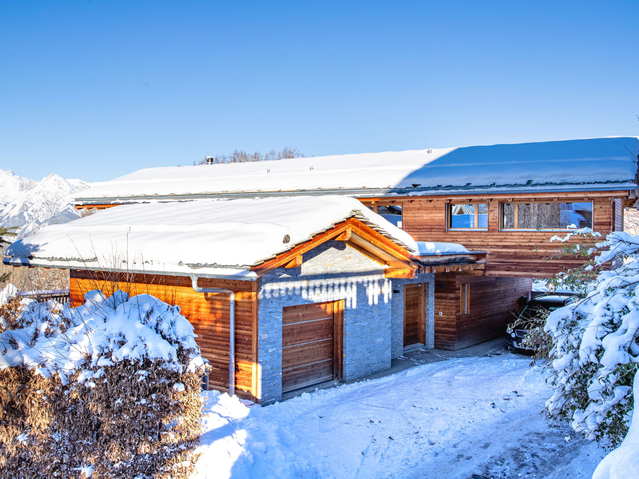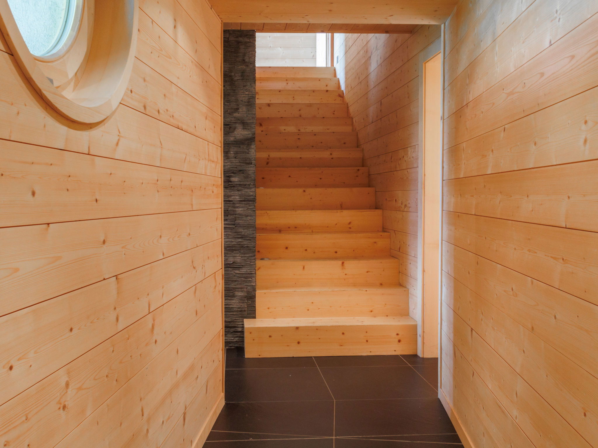 "Woovim 14", 6-room chalet 250 m2. Luxurious and wooden furniture furnishings: large living/dining room with panoramic window north facing position with Scandinavian wood stove, cable TV and DVD. Exit to the terrace. 1 large room with 1 french bed (180 cm, length 200 cm). Open kitchen (oven, dishwasher, 4 induction hot plates, toaster, kettle, microwave, electric coffee machine, Capsules for coffee machine (nespresso) extra, raclette grill, fondue Set (cheese)) with bar. Shower/WC. Heating. On the lower ground floor: 1 large room with 1 french bed (160 cm, length 200 cm), cable TV. 1 large room 28 m2 with 3 beds (80 cm, length 190 cm), 1 french bed (160 cm, length 200 cm), cable TV. Shower, sep. WC, bath/shower/WC, double hand-basin, Sauna. Upper floor: 1 room with 2 x 2 bunk beds (90 cm, length 190 cm), shower, double hand-basin and cable TV. 1 room with 1 french bed (160 cm, length 200 cm), shower and double hand-basin. Sep. WC. Terrace 80 m2, north facing position and west facing position. Terrace furniture. Very beautiful panoramic view of the mountains and the valley. Facilities: sauna, children's high chair, baby cot for up to 2 year olds, hair dryer. Internet (WiFi, free). Parking (3 cars), garage, height 200 cm, width 220 cm. Please note: non-smokers only.