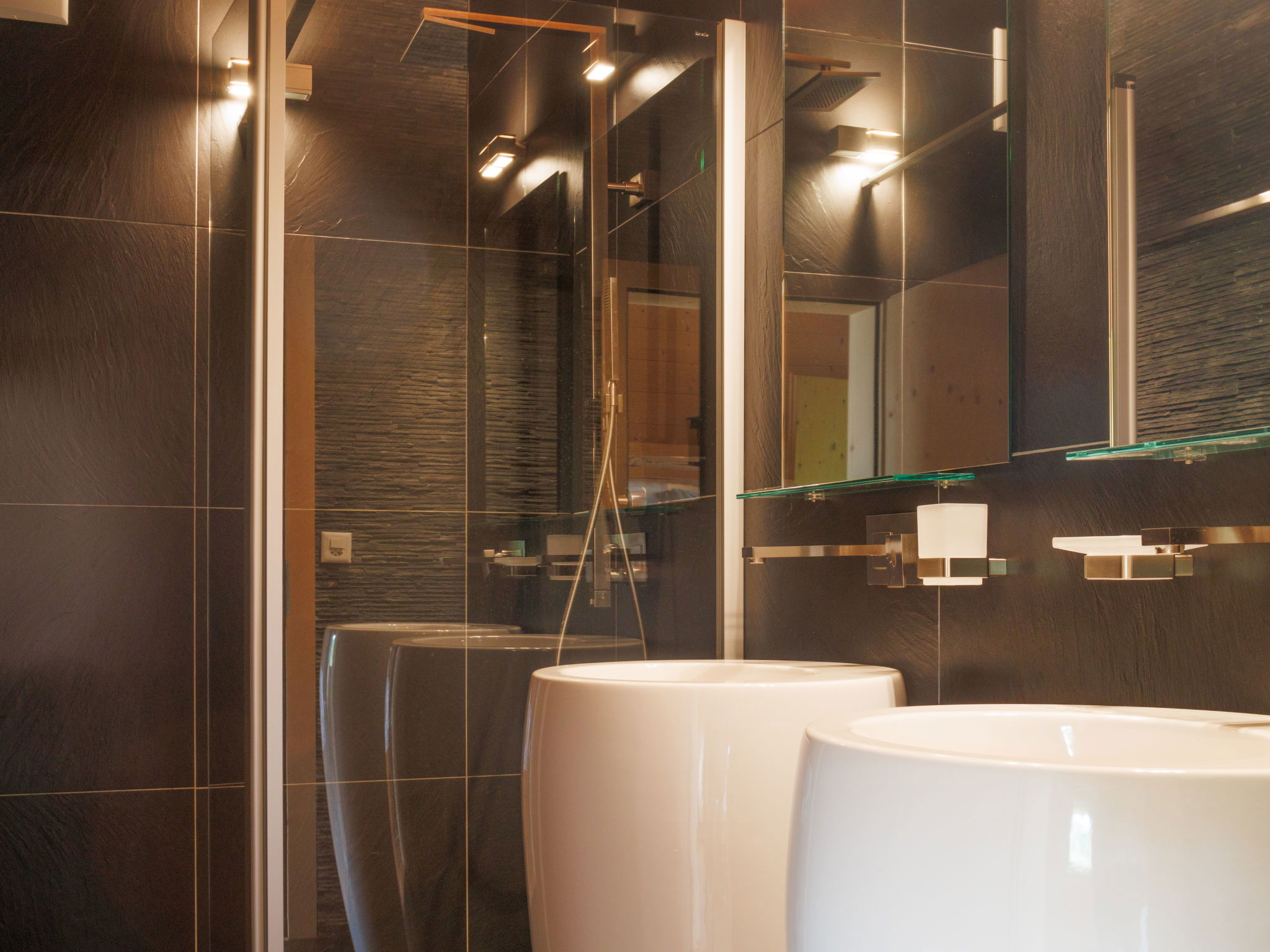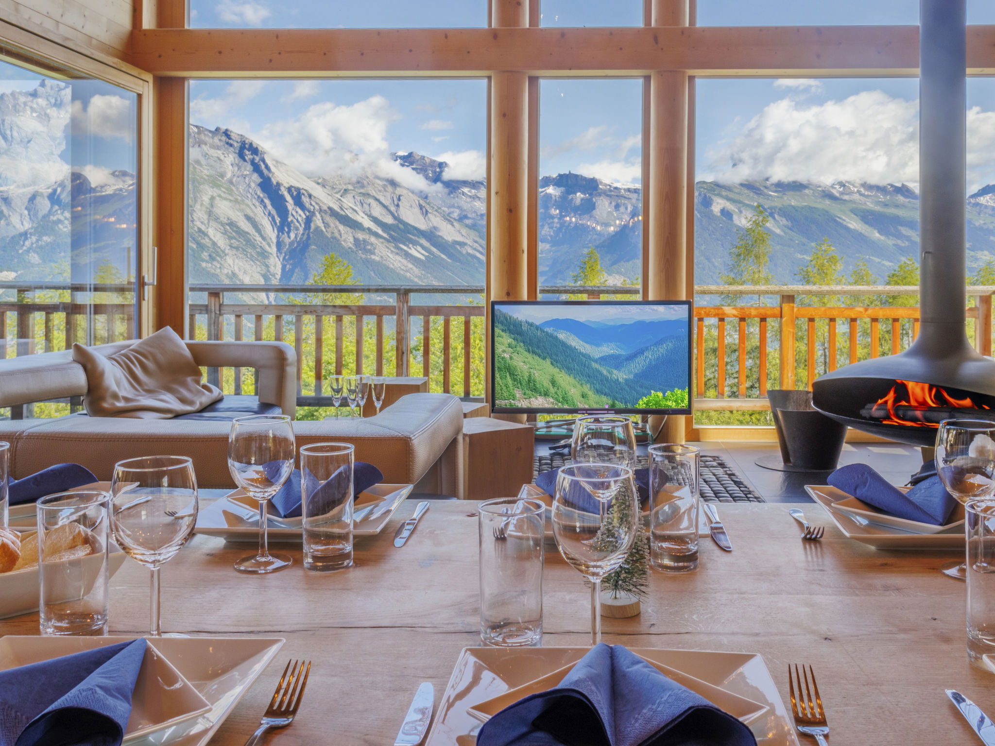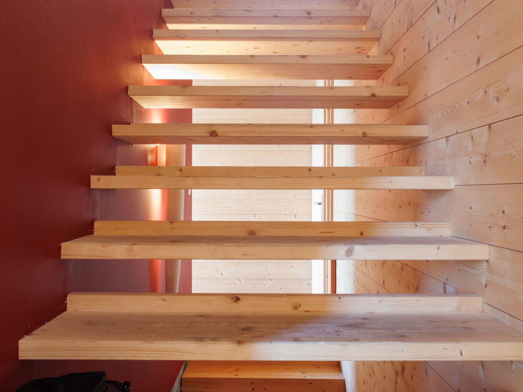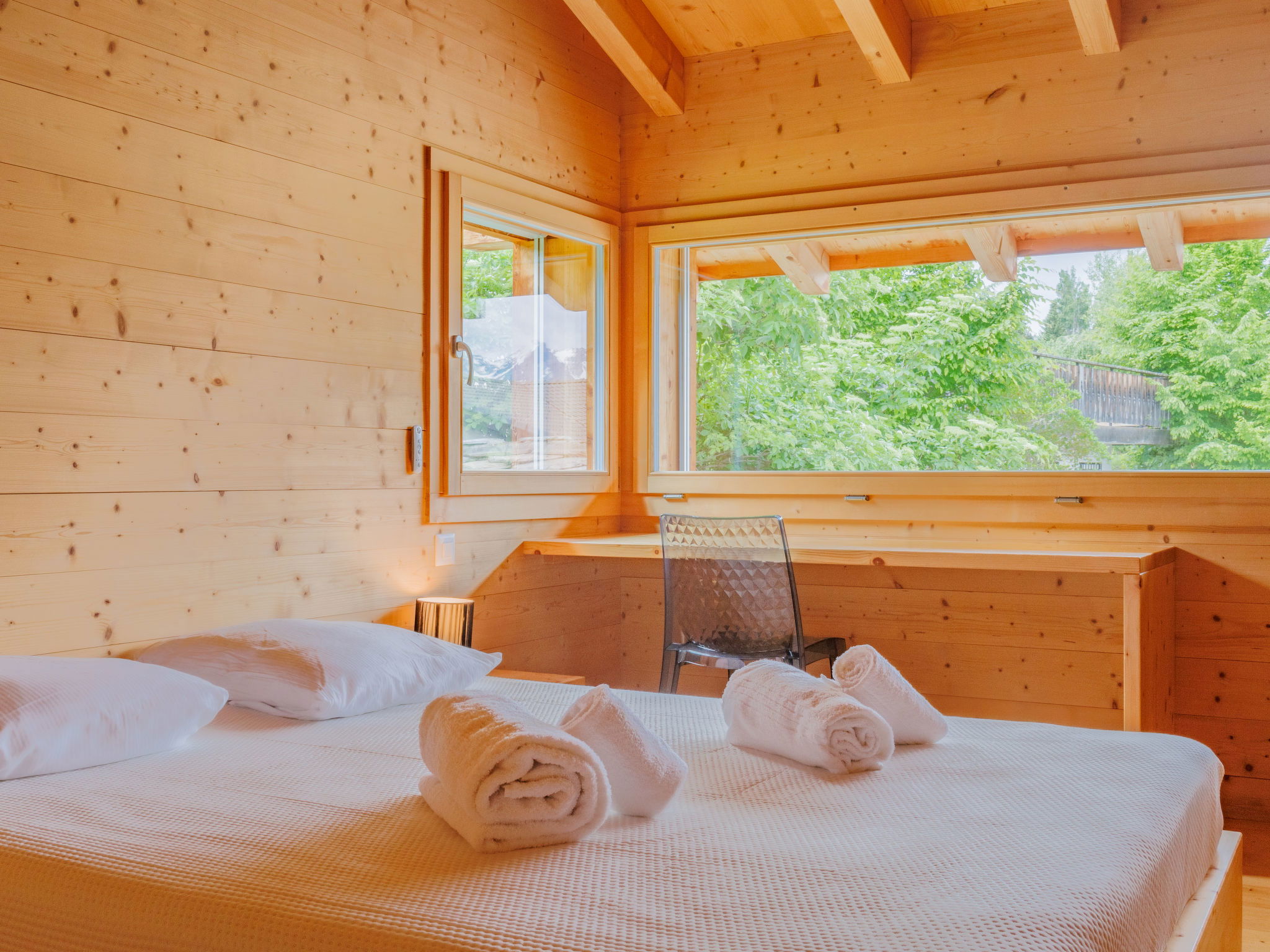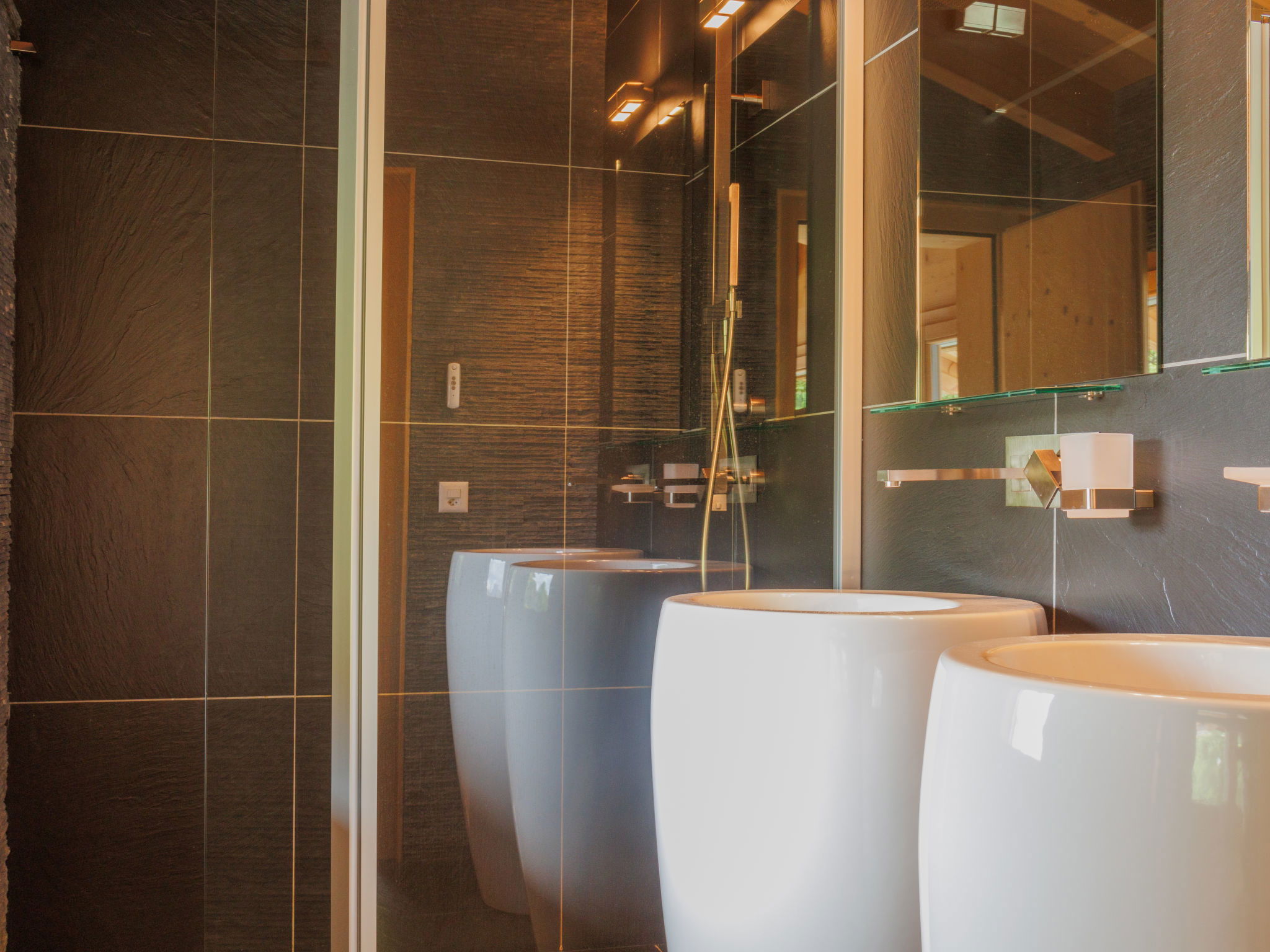 "Woovim 14", 6-room chalet 250 m2. Luxurious and wooden furniture furnishings: large living/dining room with panoramic window north facing position with Scandinavian wood stove, cable TV and DVD. Exit to the terrace. 1 large room with 1 french bed (180 cm, length 200 cm). Open kitchen (oven, dishwasher, 4 induction hot plates, toaster, kettle, microwave, electric coffee machine, Capsules for coffee machine (nespresso) extra, raclette grill, fondue Set (cheese)) with bar. Shower/WC. Heating. On the lower ground floor: 1 large room with 1 french bed (160 cm, length 200 cm), cable TV. 1 large room 28 m2 with 3 beds (80 cm, length 190 cm), 1 french bed (160 cm, length 200 cm), cable TV. Shower, sep. WC, bath/shower/WC, double hand-basin, Sauna. Upper floor: 1 room with 2 x 2 bunk beds (90 cm, length 190 cm), shower, double hand-basin and cable TV. 1 room with 1 french bed (160 cm, length 200 cm), shower and double hand-basin. Sep. WC. Terrace 80 m2, north facing position and west facing position. Terrace furniture. Very beautiful panoramic view of the mountains and the valley. Facilities: sauna, children's high chair, baby cot for up to 2 year olds, hair dryer. Internet (WiFi, free). Parking (3 cars), garage, height 200 cm, width 220 cm. Please note: non-smokers only.