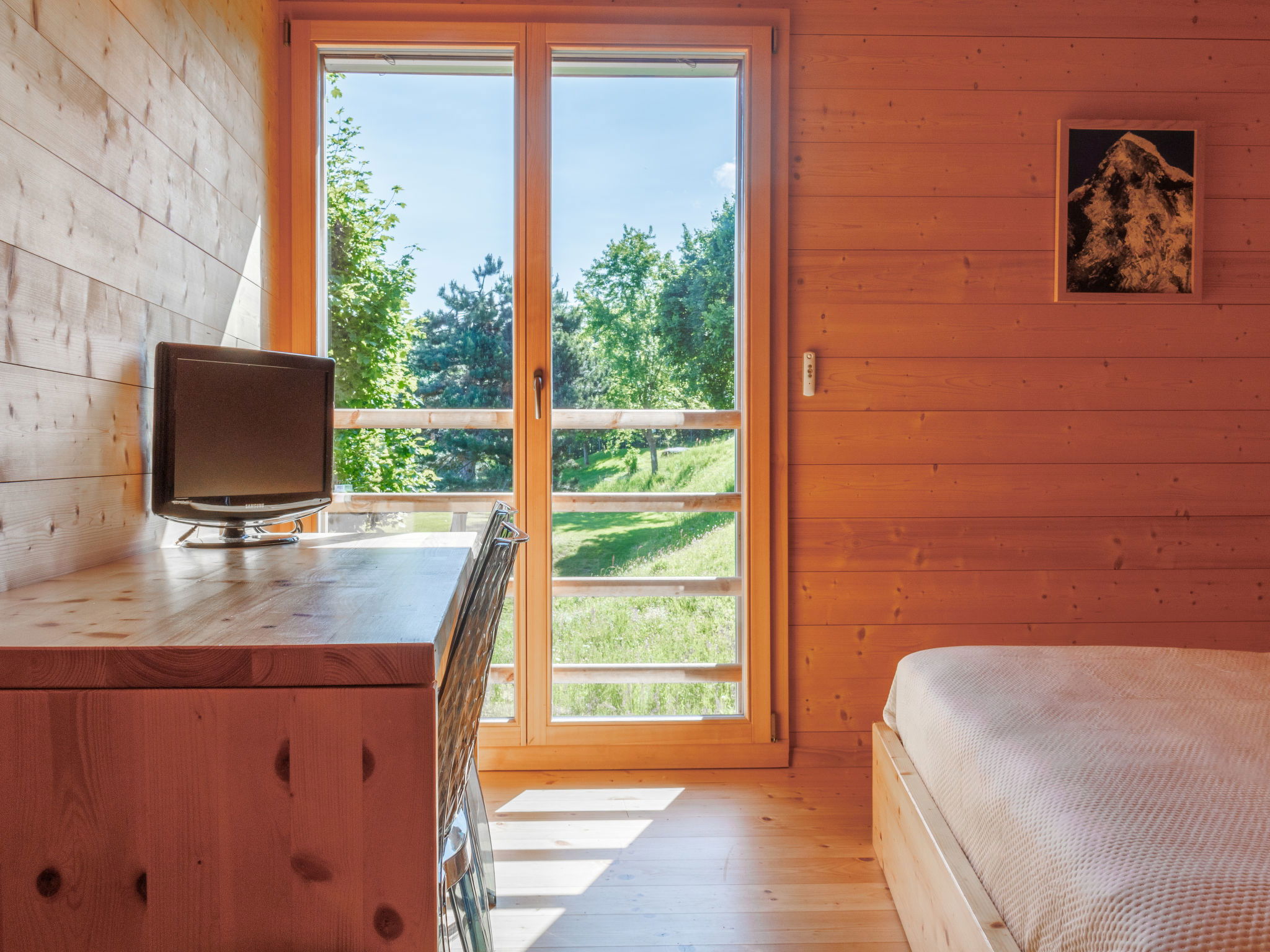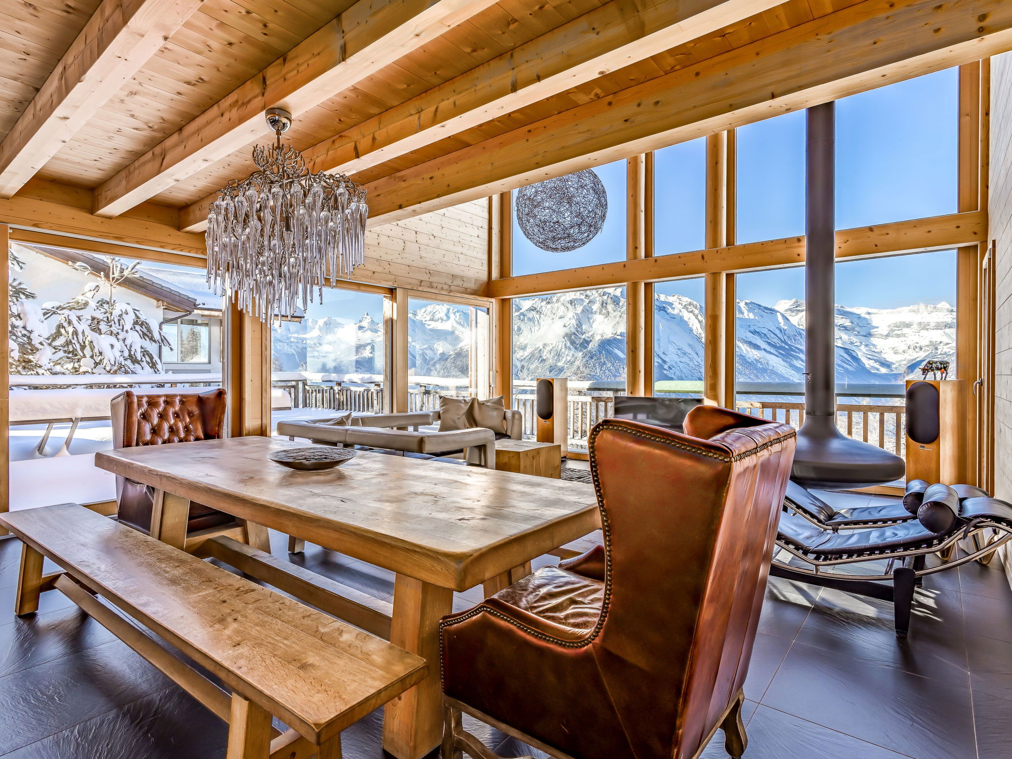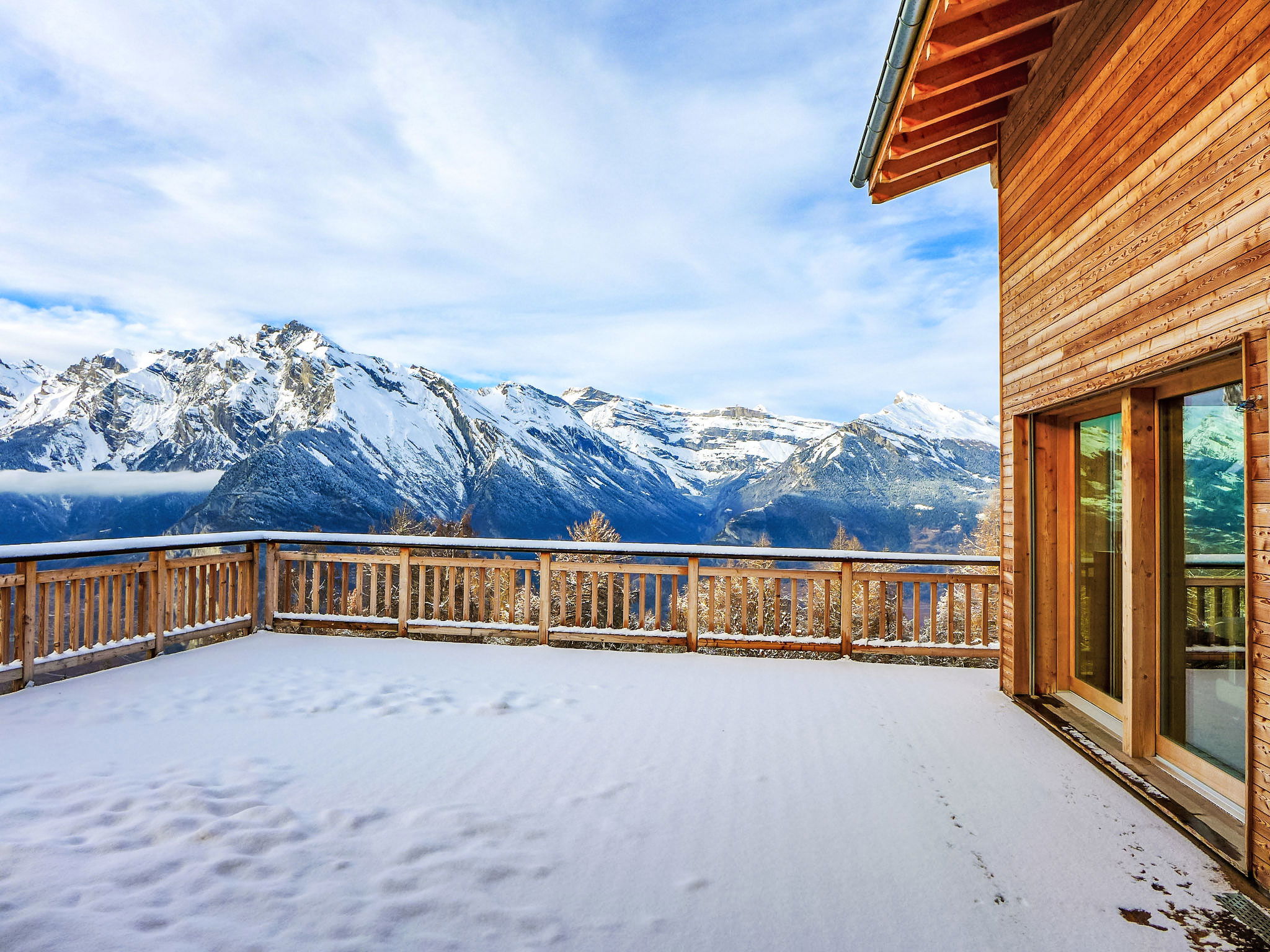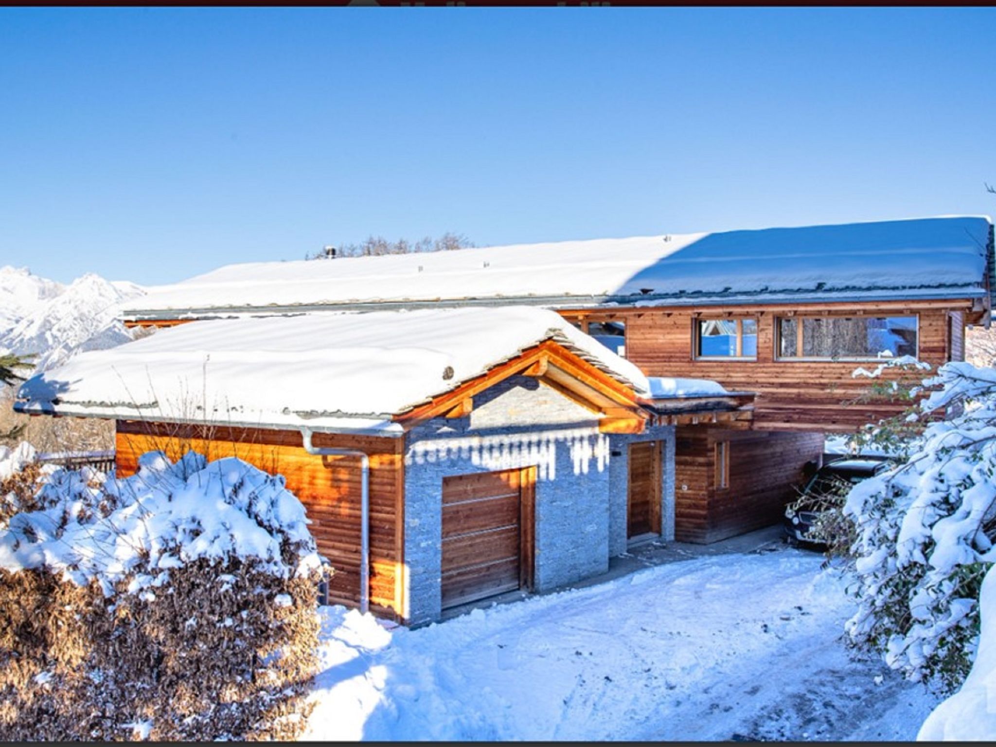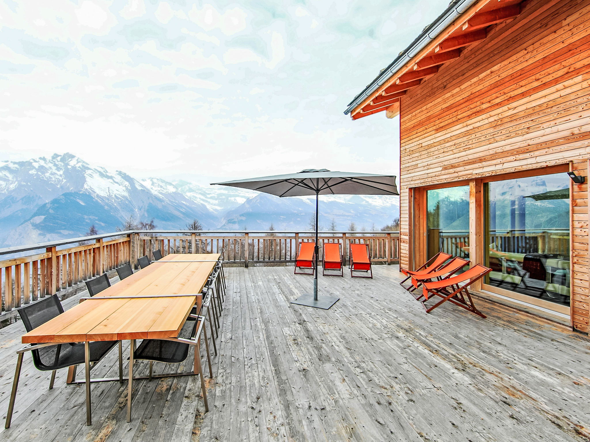 "Woovim 8", 5-room chalet 225 m2 on 3 levels. Luxurious and wooden furniture furnishings: large living/dining room with sliding door, panoramic window north facing position with Scandinavian wood stove and cable TV. Exit to the terrace. 1 large room with 1 double bed (180 cm, length 200 cm). Open kitchen (oven, dishwasher, toaster, kettle, microwave, electric coffee machine, Capsules for coffee machine (nespresso) extra, raclette grill, fondue Set (cheese)) with bar. Shower/WC. Heating. On the lower ground floor: 1 large room with 1 french bed (160 cm, length 200 cm). Shower, sep. WC, Sauna. Upper floor: 1 room with 1 french bed (160 cm, length 200 cm), shower and double hand-basin. 1 room with 1 x 2 bunk beds (90 cm, length 190 cm), shower and double hand-basin. Sep. WC. Large terrace 80 m2. Terrace furniture. Very beautiful panoramic view of the mountains and the valley. Facilities: children's high chair, baby cot, hair dryer. Internet (WiFi, free). Parking (2 cars), garage, height 200 cm, width 220 cm. Please note: non-smokers only.