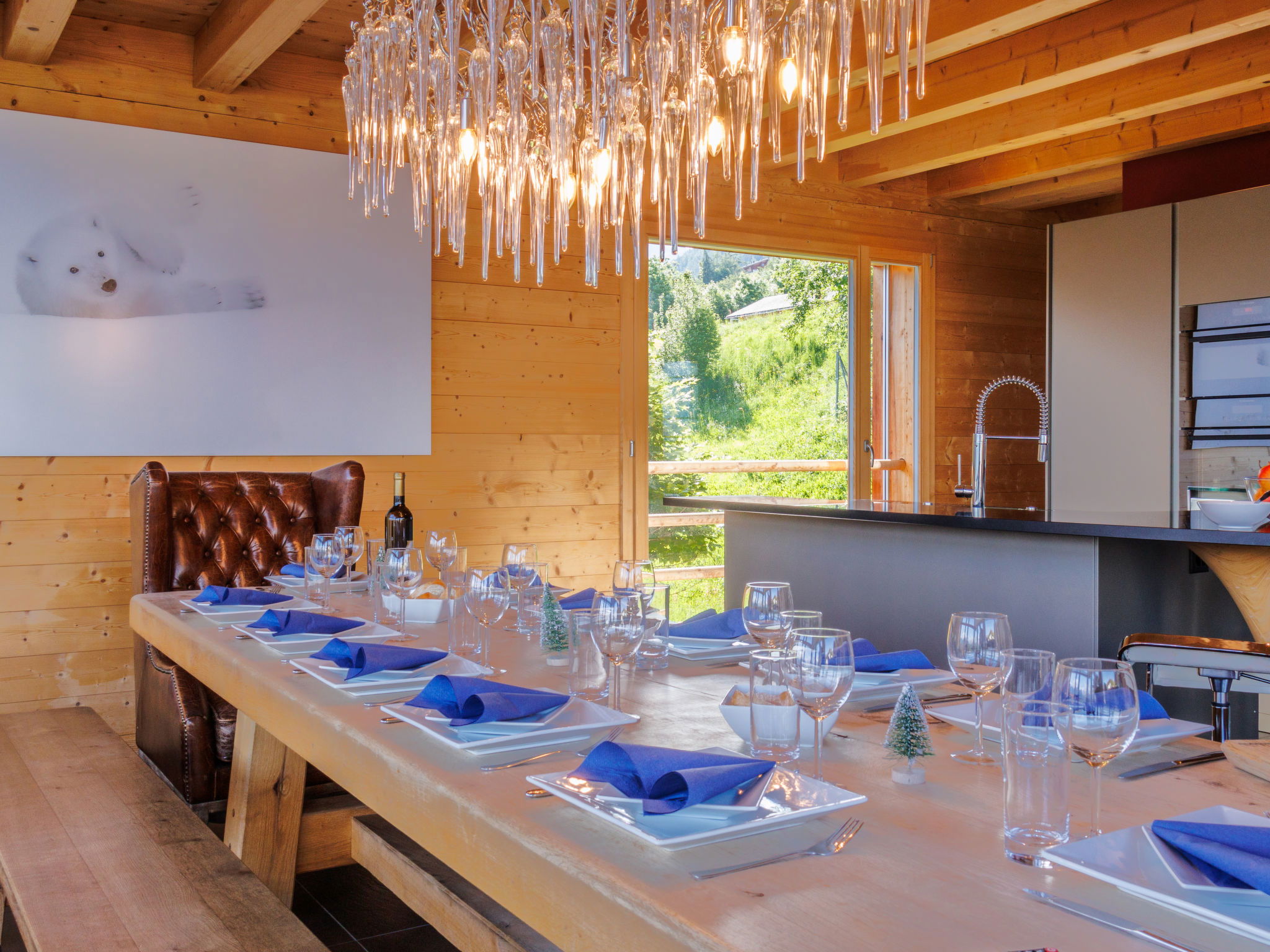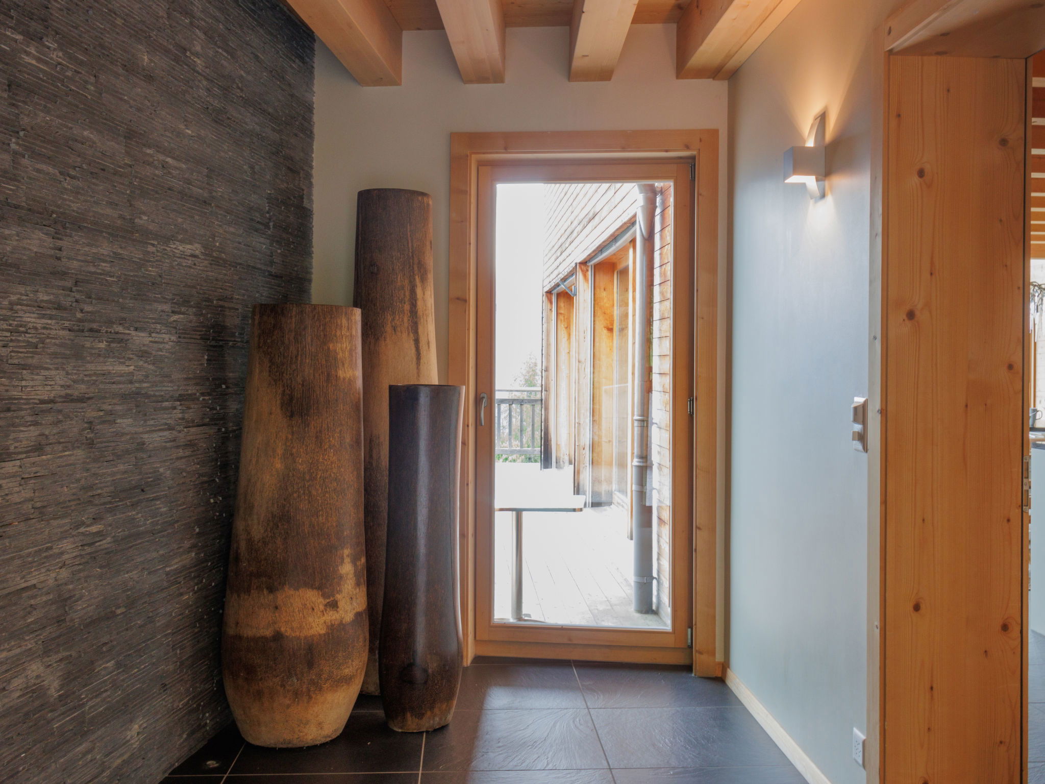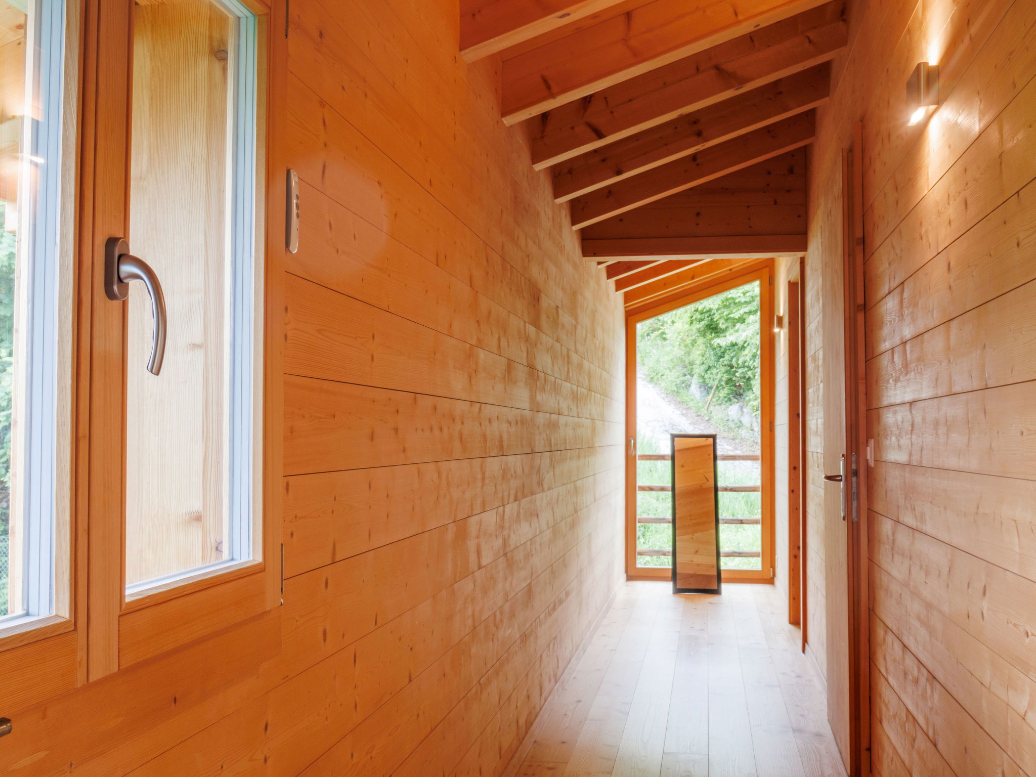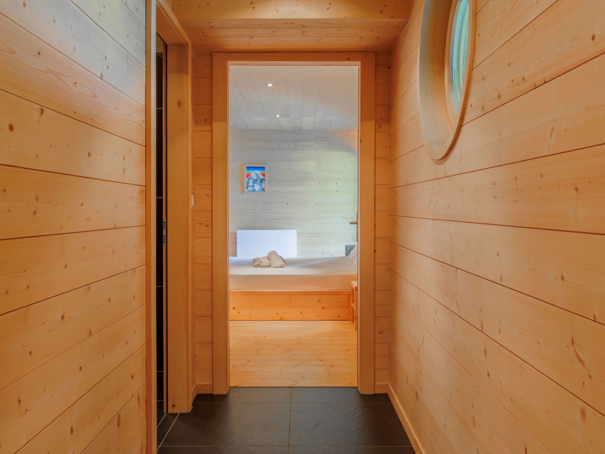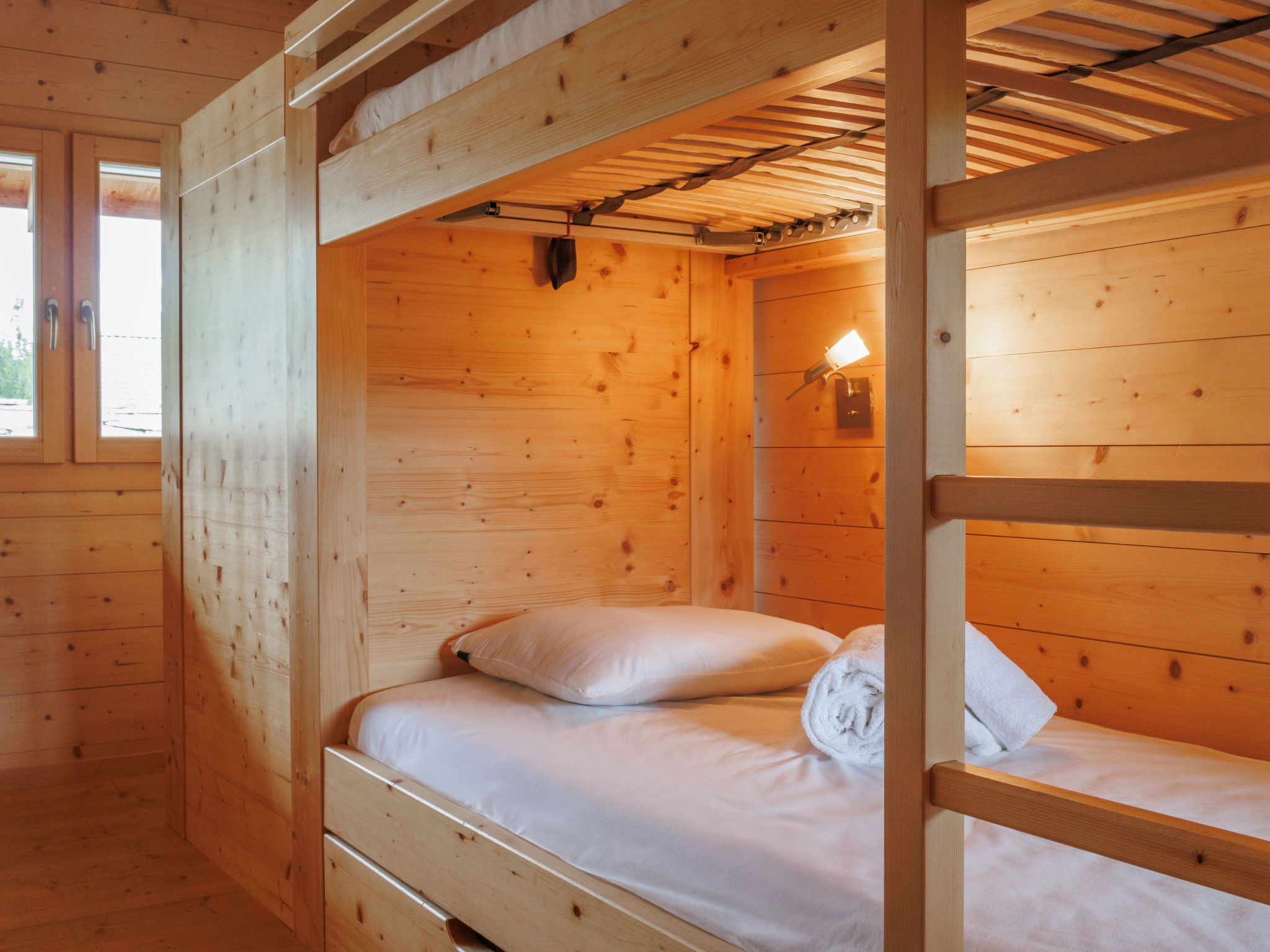 "Woovim 8", 5-room chalet 225 m2 on 3 levels. Luxurious and wooden furniture furnishings: large living/dining room with sliding door, panoramic window north facing position with Scandinavian wood stove and cable TV. Exit to the terrace. 1 large room with 1 double bed (180 cm, length 200 cm). Open kitchen (oven, dishwasher, toaster, kettle, microwave, electric coffee machine, Capsules for coffee machine (nespresso) extra, raclette grill, fondue Set (cheese)) with bar. Shower/WC. Heating. On the lower ground floor: 1 large room with 1 french bed (160 cm, length 200 cm). Shower, sep. WC, Sauna. Upper floor: 1 room with 1 french bed (160 cm, length 200 cm), shower and double hand-basin. 1 room with 1 x 2 bunk beds (90 cm, length 190 cm), shower and double hand-basin. Sep. WC. Large terrace 80 m2. Terrace furniture. Very beautiful panoramic view of the mountains and the valley. Facilities: children's high chair, baby cot, hair dryer. Internet (WiFi, free). Parking (2 cars), garage, height 200 cm, width 220 cm. Please note: non-smokers only.