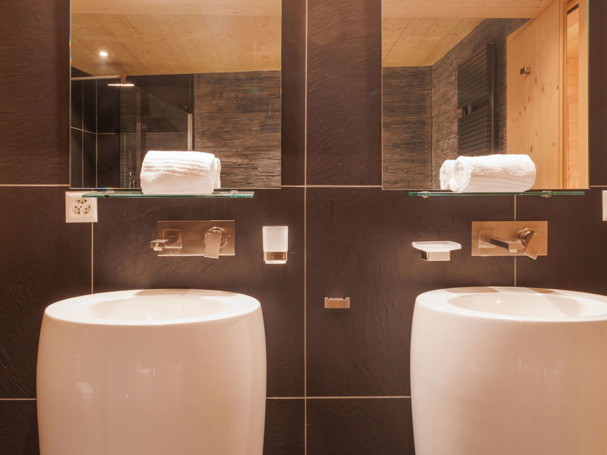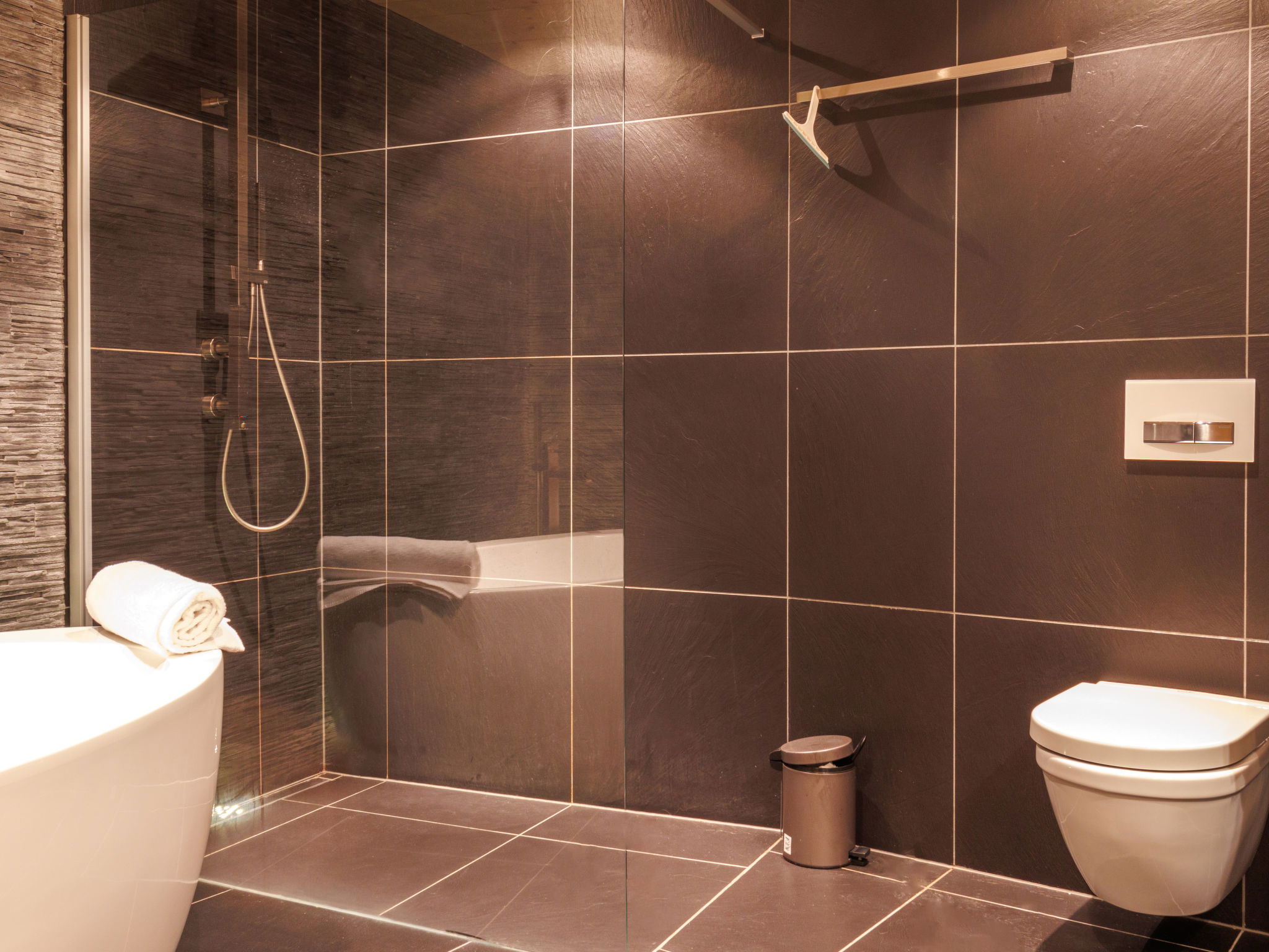 Very modern, beautiful, luxurious chalet "Woovim", 3 storeys, built in 2014. On the outskirts, 500 m from the centre, on a slope, in a cul-de-sac. Private: terrace (80 m2), barbecue. In the house: sauna, sun terrace, washing machine, tumble dryer, ski boot dryer. Steep motor access. In Winter: please take snow chains, 4x4 car recommended in winter. Parking (for 3 cars), single garage. Shop, grocery, supermarket 750 m, restaurant 200 m, 10 minute walk to the centre, bus stop "Haute-Nendaz, station/poste" 1 km, railway station "Sion" 16.8 km, outdoor swimming pool 200 m. Golf course (18 hole) 15 km, tennis 200 m, gondola lift 1 km, ski bus stop, ski-kindergarten, children's playground 300 m. Nearby attractions: SPA Des Bisses 800 m. Well-known ski regions can easily be reached: Nendaz 4 Vallées 1 km. Hiking paths: Les Bisses 1 km. Please note: groups of teenagers on request only. Ski bus (free of charge).