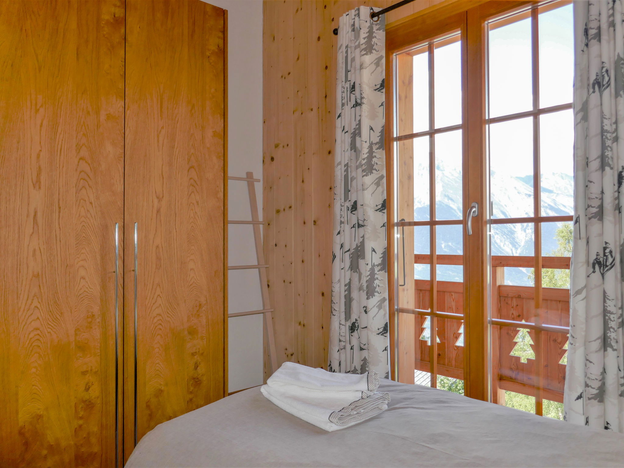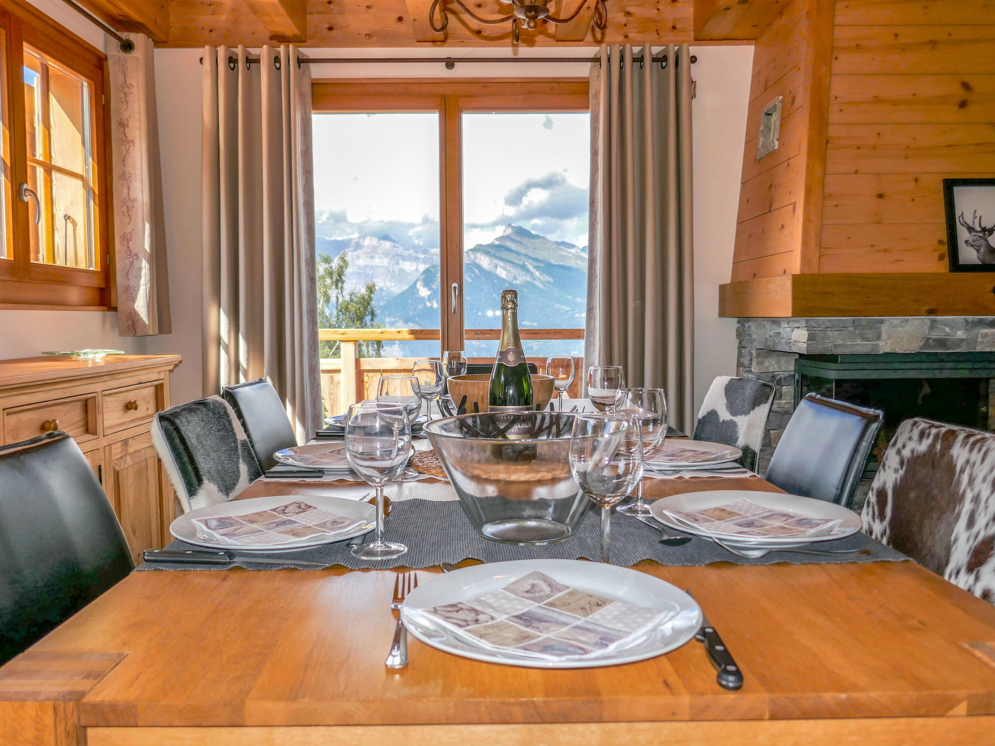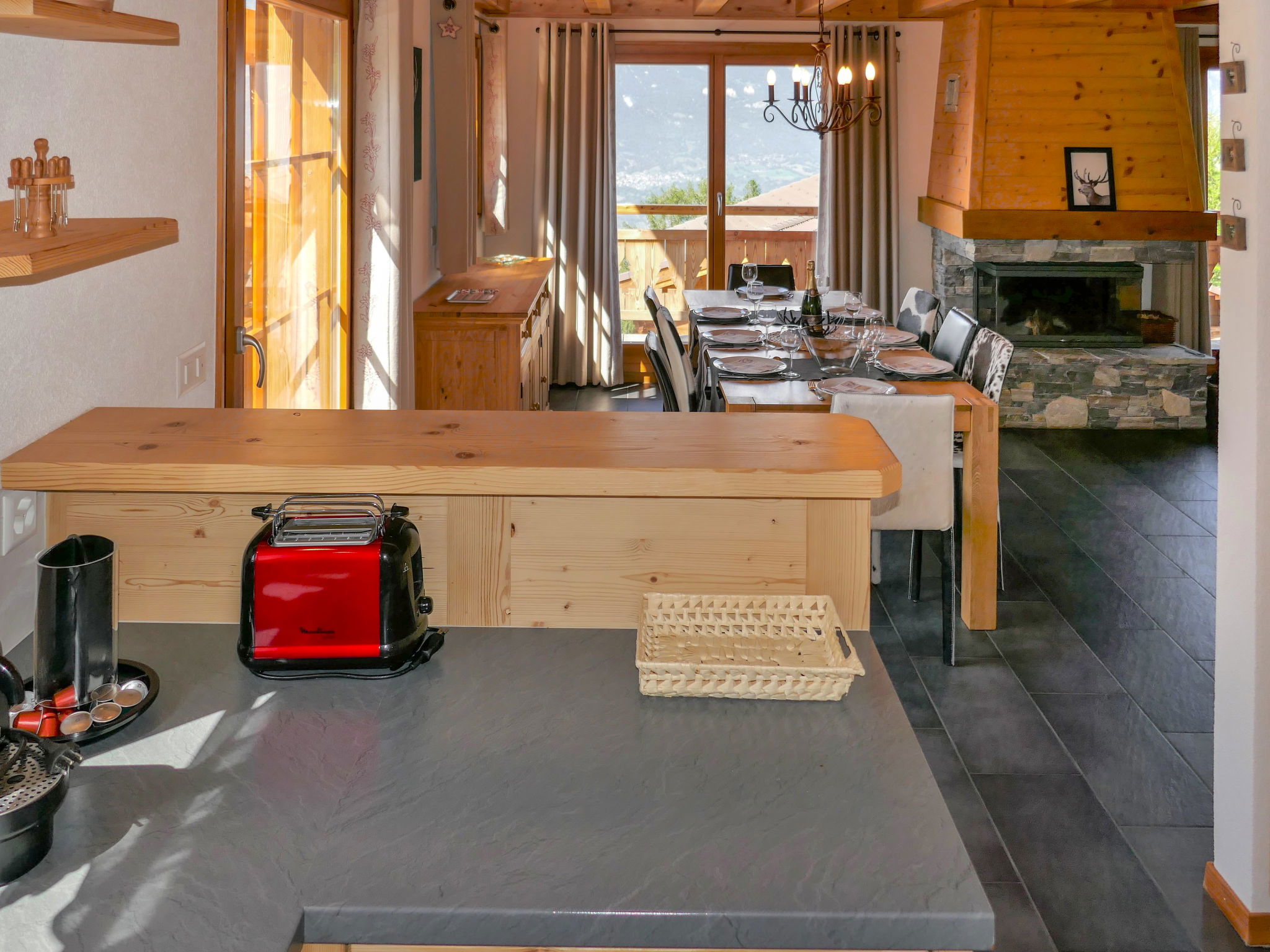 "Le Muveran V8", 5-room chalet 184 m2 on 3 levels. Spacious and bright, beautiful and tasteful furnishings: entrance hall. Living/dining room with open-hearth fireplace, cable TV and radio. Exit to the balcony, to the terrace, north facing position and west facing position. Open kitchen (oven, dishwasher, 4 ceramic glass hob hotplates, toaster, kettle, microwave, electric coffee machine, Capsules for coffee machine (nespresso) extra, raclette grill, fondue Set (chinoise, cheese)). Sep. WC. Heating. On the lower ground floor: entrance hall. 1 room with 1 french bed (160 cm, length 200 cm). 1 room with 2 beds (90 cm, length 200 cm). Shower/WC. Upper floor: 1 room with 1 french bed (160 cm, length 200 cm). Exit to the balcony, north facing position. 1 room with 2 beds (90 cm, length 200 cm). Exit to the balcony, north facing position. Bath/shower/WC. Balcony, north facing position terrace 27 m2, west facing position, garden, south facing position. Terrace furniture, barbecue, deck chairs (2). Very beautiful view of the mountains. Facilities: washing machine, dryer, children's high chair, baby cot, hair dryer. Internet (WiFi, free). Parking (3 cars). Please note: non-smokers only.